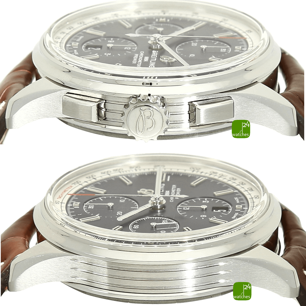 Brushed and polished stainless steel | Case diameter 42 mm without crown - with crown 45 mm | from lug to lug 49 mm | case height 13.5 mm | solid screwed case back | elaborate sapphire glass anti-reflective and undamaged | original Breitling crown | Stepped and polished bezel | Lug22 mm | according to manufacturer 100 m waterproof | Total weight 117.10 grams