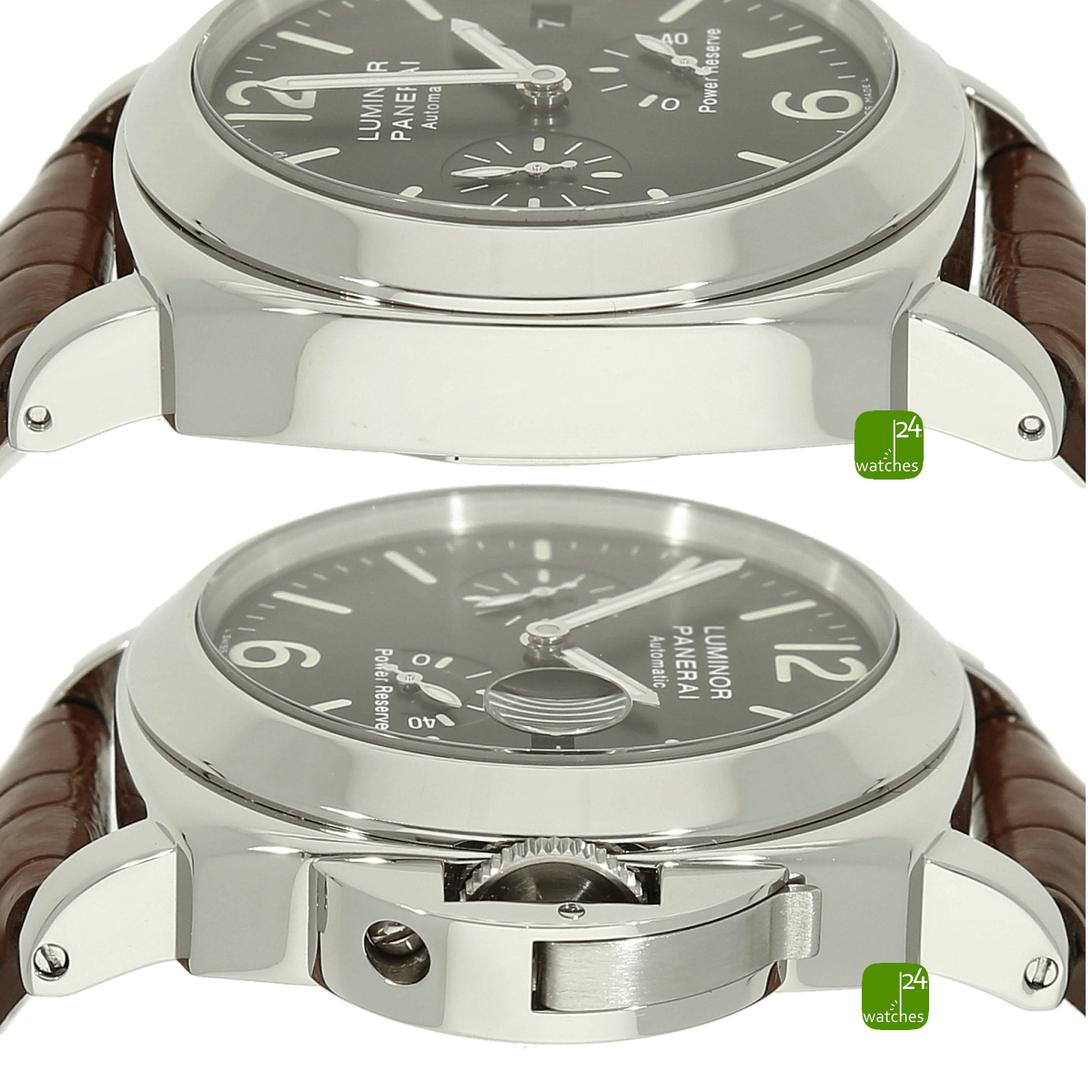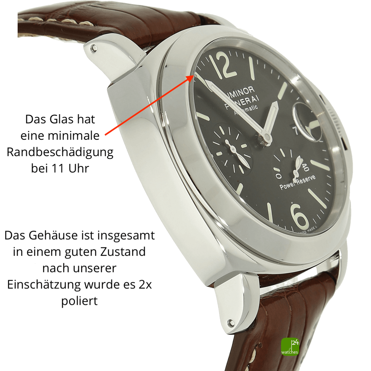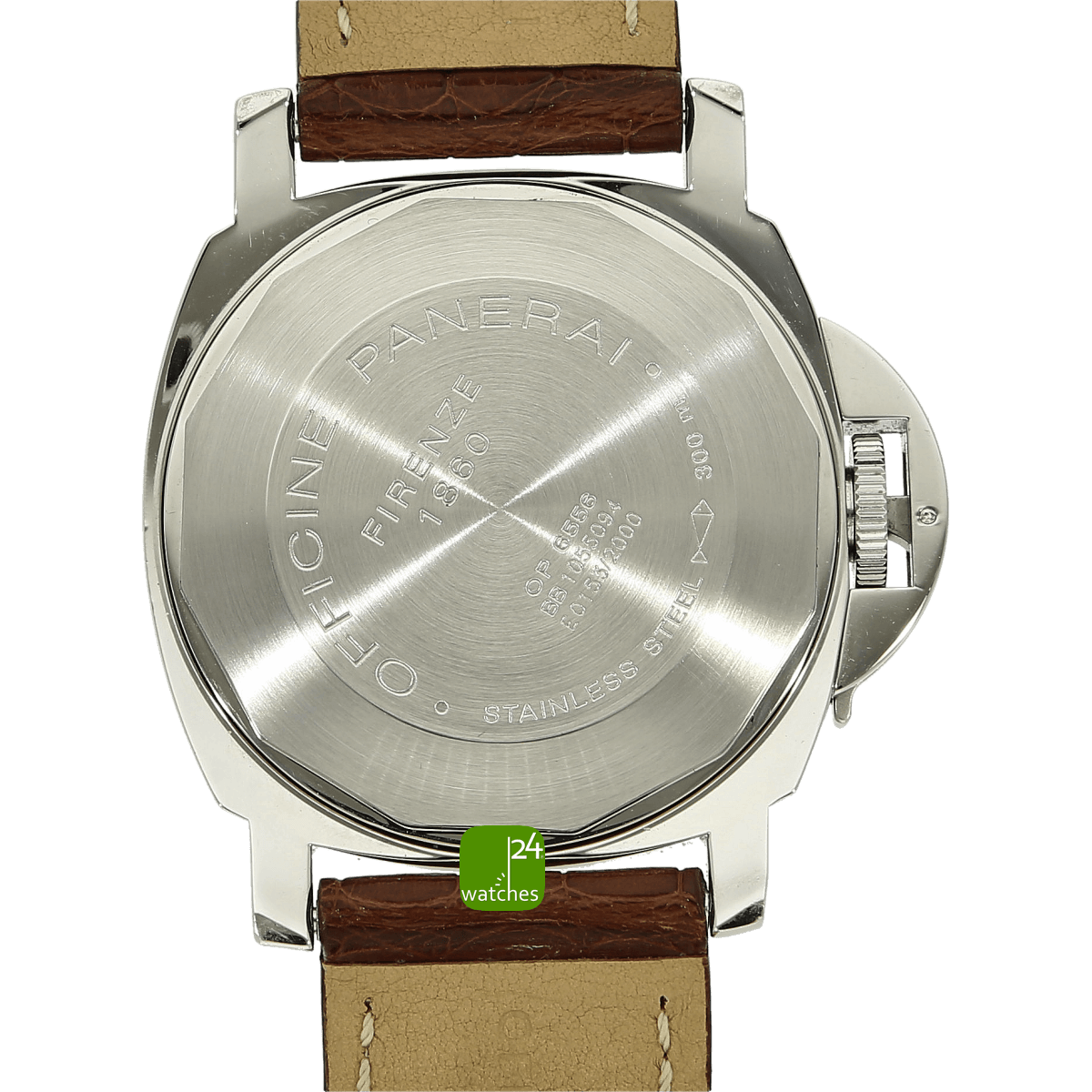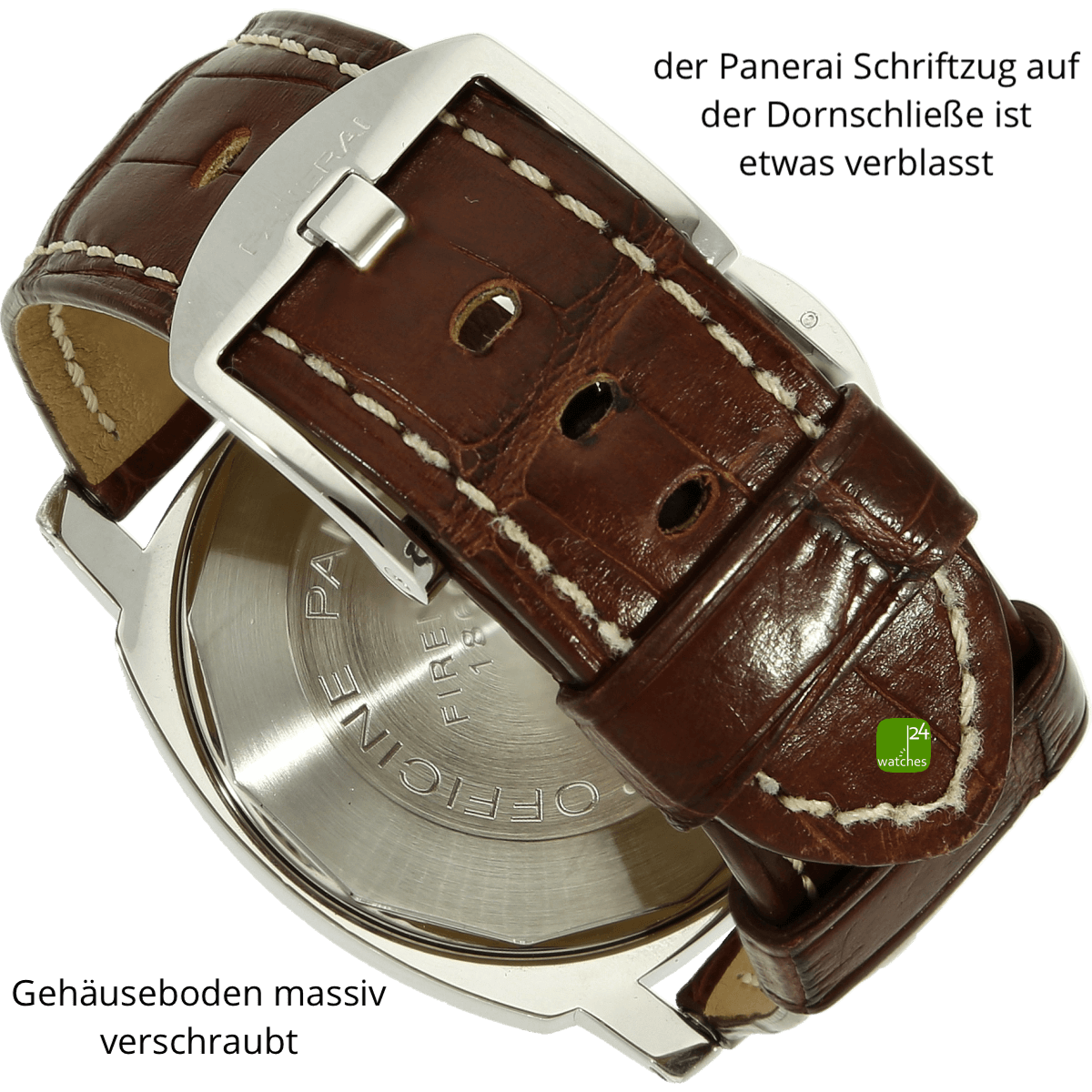 Stainless steel | Diameter without crown 44 mm | with crown 49.5 mm | from lug to lug 53 mm | Case height 15 mm | solid screwed case back with manufacturer engravings | Sapphire crystal with date magnifier between 10 and 11 o'clock with minimal edge damage | Panerai patented crown closure | according to manufacturer 300 m water resistant - currently tested with + 100 m | Total weight 143.24 grams