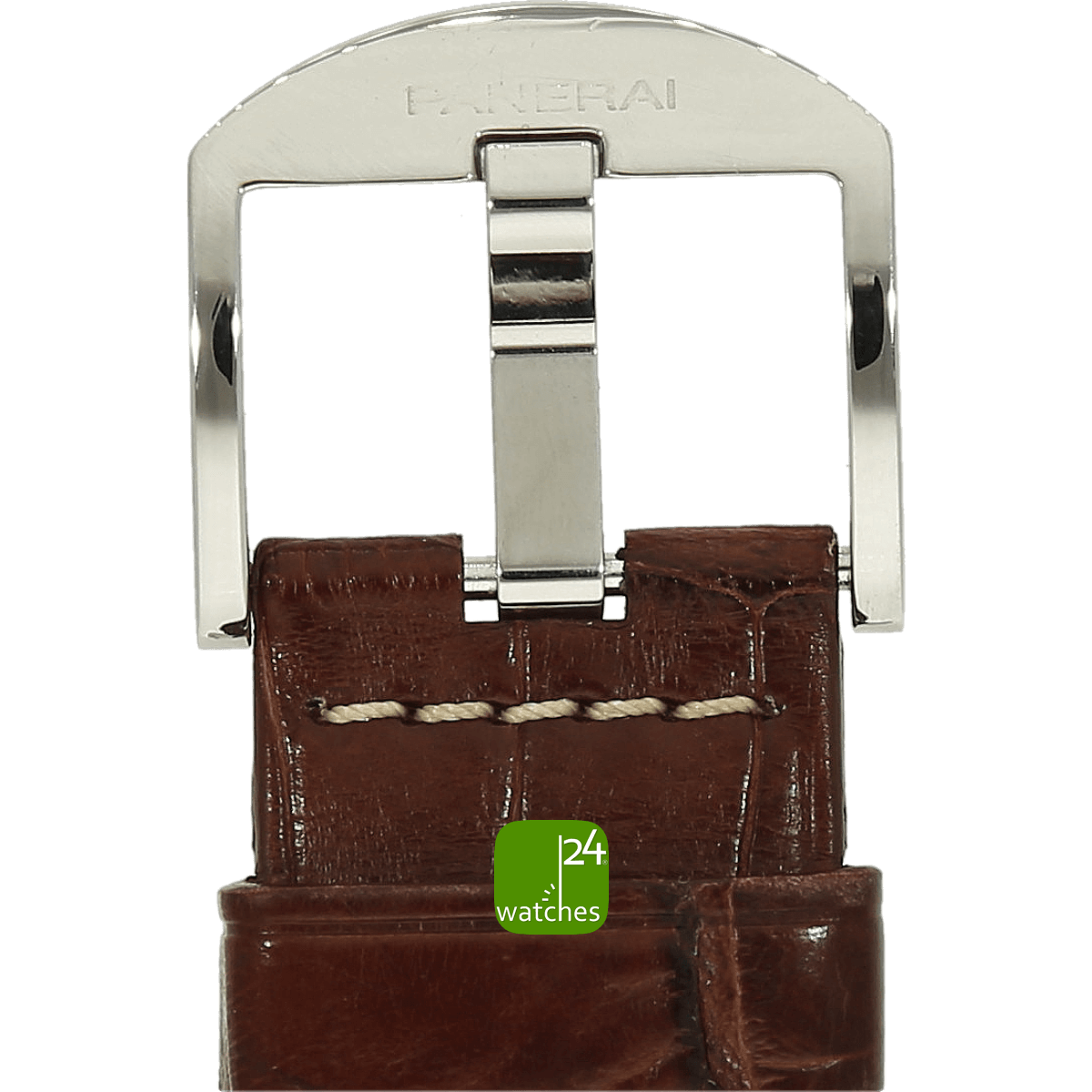 Original Panerai alligator leather strap worn close up | Original Panerai pin buckle in polished stainless steel, slightly faded.