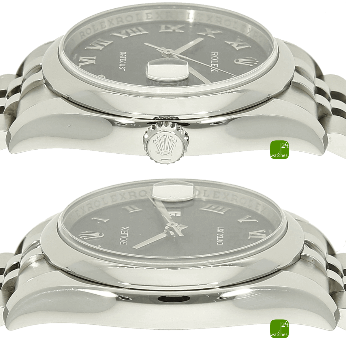 Stainless steel | Case diameter 36 mm without crown - 39 mm with crown | Total case length 44 mm | Case height 11 mm | Screw-down solid case back | Rolex sapphire crystal with minimal damage at 12 o'clock - with 2.5x magnification at 3 o'clock | Polished, domed stainless steel bezel | Lug width 20 mm | Water resistant to 100 m according to the manufacturer | Total weight 113.25 grams