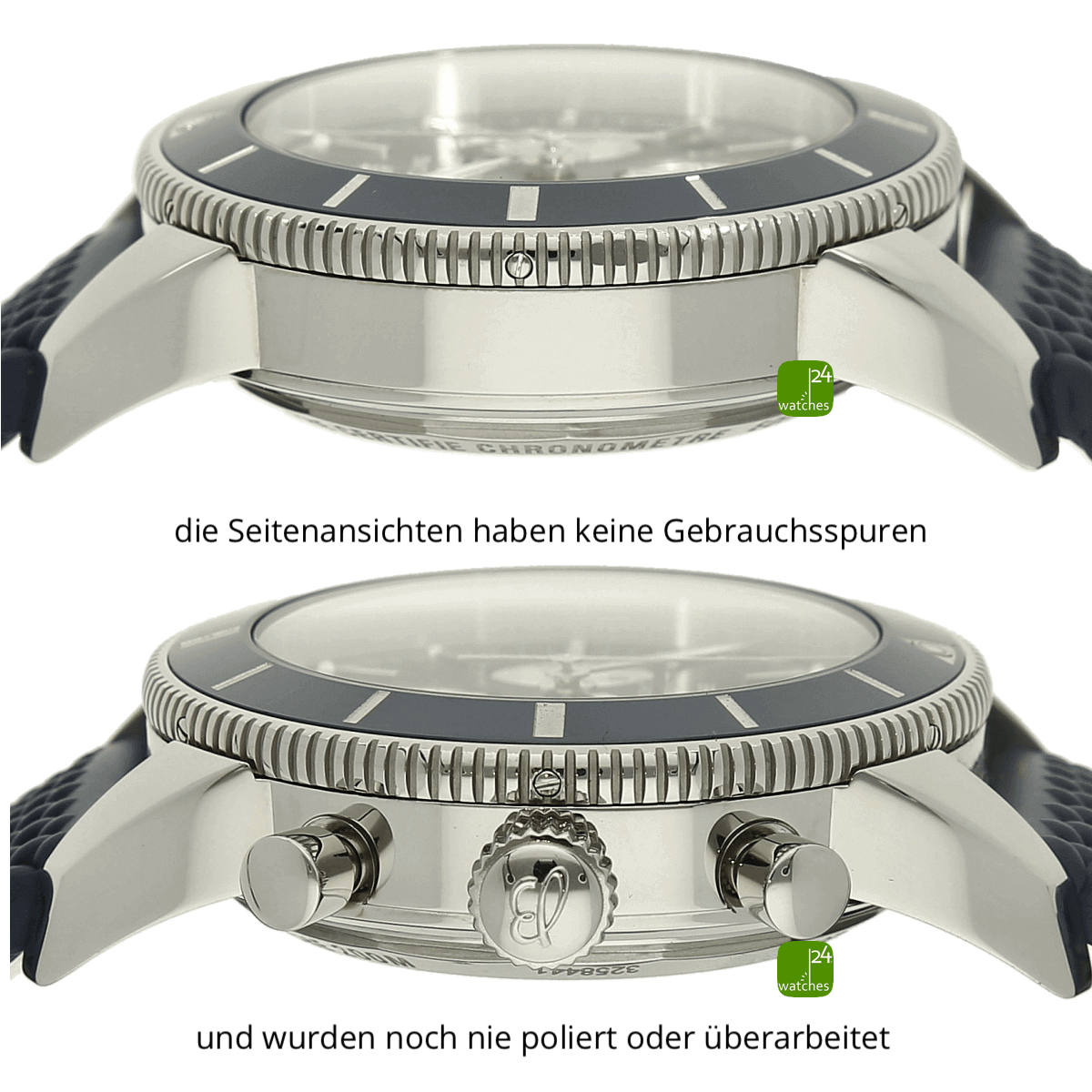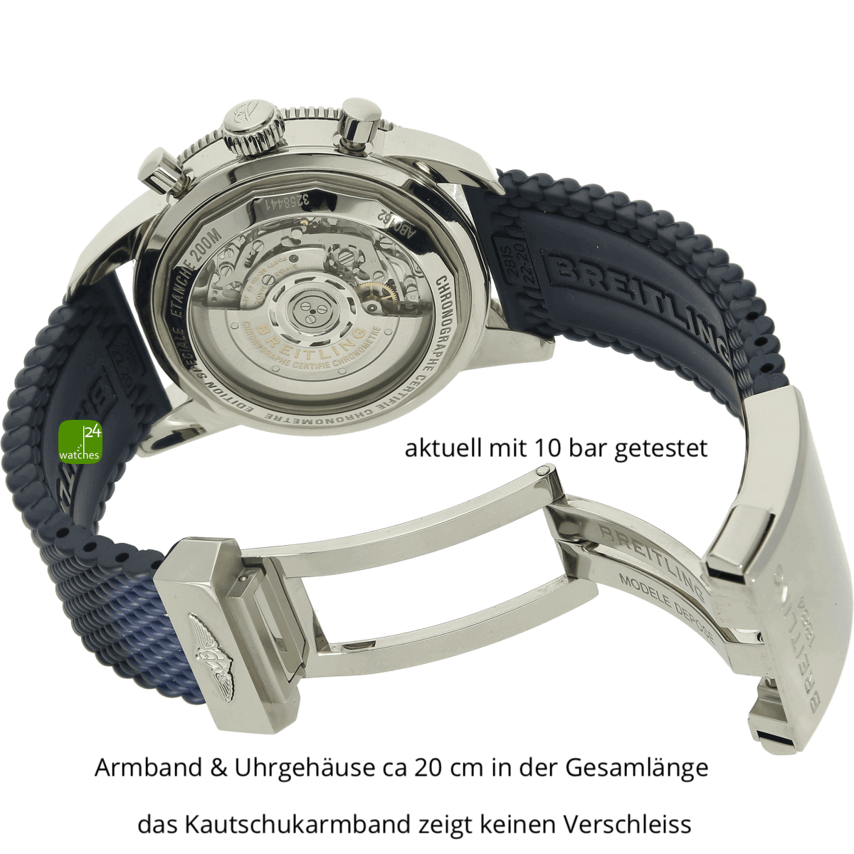 acier inoxydable | Diamètre du boîtier 44 mm mesuré sans couronne | avec couronne 48 mm | de patte à patte 54 mm | Hauteur du boîtier 15,2 mm | fond de boîtier vissé avec gravures du fabricant | Verre saphir antireflet et intact | couronne vissée Breitling d'origine | lunette tournante unidirectionnelle à 60 positions, insert en céramique bleue sans aucun signe d'usure | Largeur des cornes 22 mm | Selon le fabricant, il est étanche jusqu'à 200 m | Poids total 154,70 grammes