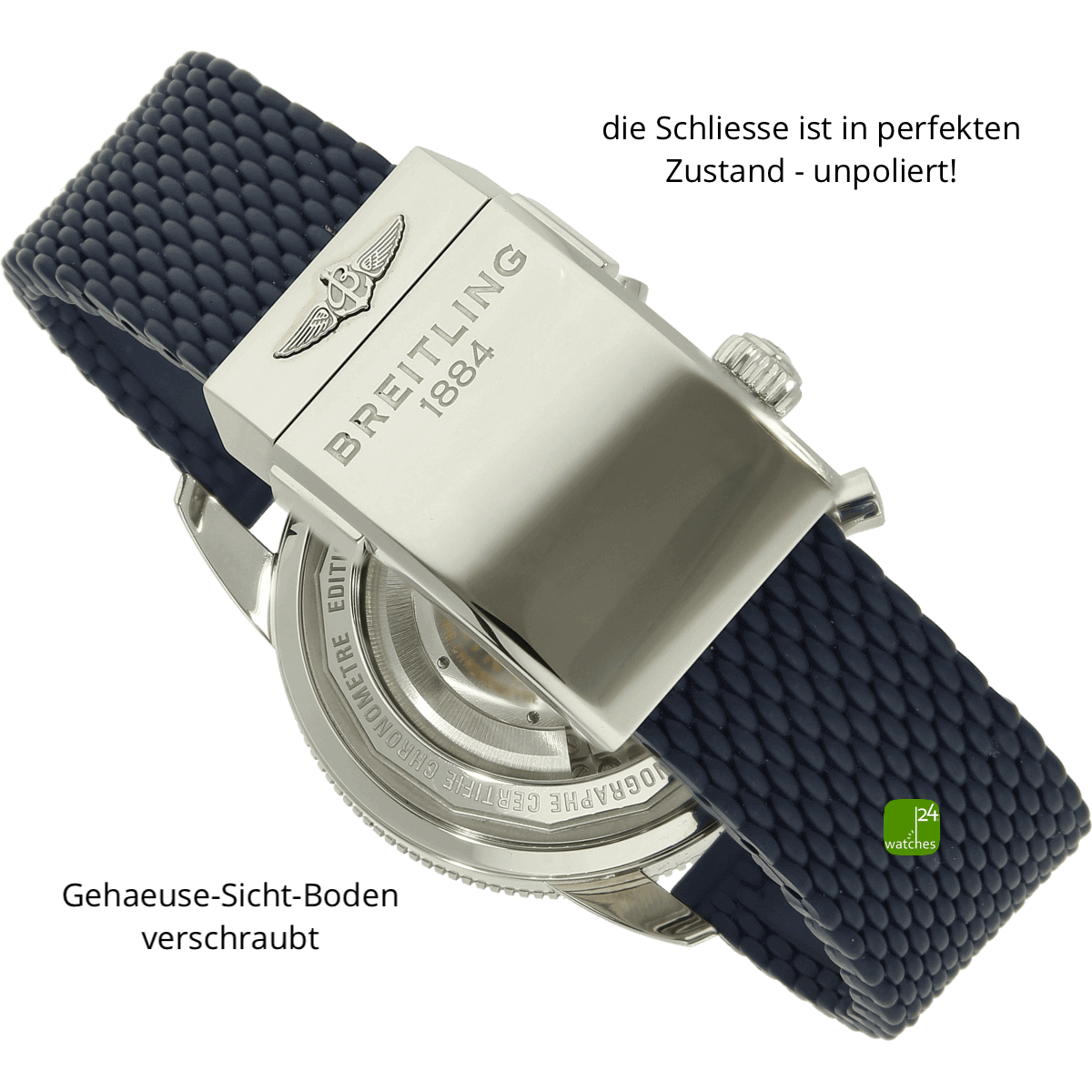 Bracelet en caoutchouc Breitling d'origine de style millanaise bleu | Fermoir boîte Breitling d'origine, poli et avec poussoirs de sécurité - avec système de réglage rapide | Longueur totale du bracelet et du boîtier de la montre environ. 20 cm | longueur de livraison d'origine