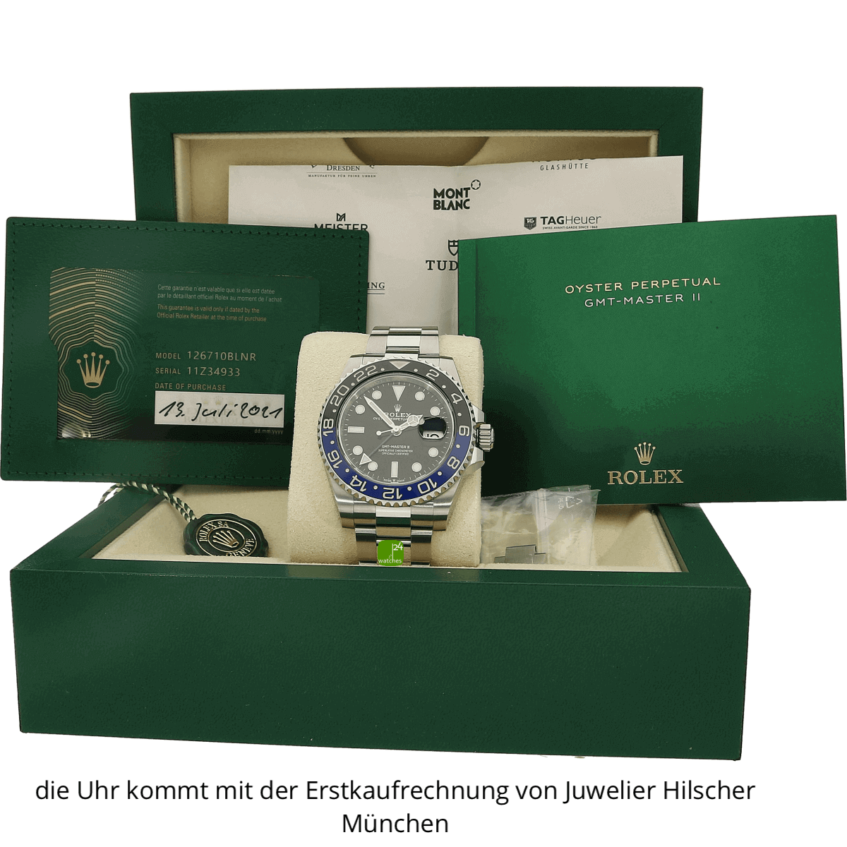 Hat die Uhr keine Original-Papiere, bescheinigen wir die Echtheit in Form eines Zertifikates. Die Referenz-/ Serien-Nummer wird von uns dokumentiert in der personalisierten watches24-Rechnung.