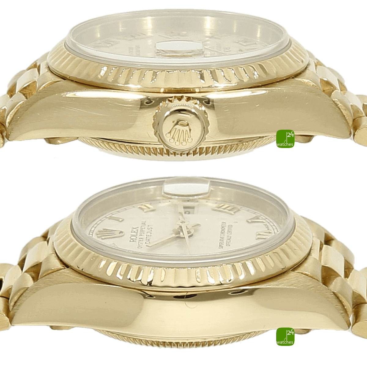 Or jaune 18 ct / 0,750 | Diamètre du boîtier 26 mm mesuré sans couronne - avec couronne 28 mm | De corne à corne 32,5 mm | Hauteur du boîtier 10,2 mm | fond de boîtier vissé massif avec gravure Rolex | Verre saphir avec loupe à trois heures pour un grossissement de la date de 2,5x - intact | couronne Rolex d'origine vissée en or | Lynette or jaune 18 ct moleté bon état | Largeur des cornes 13 mm | Selon le fabricant, il est résistant à l'eau jusqu'à 100 m, actuellement testé à 10 bars | Poids total 73,63 grammes