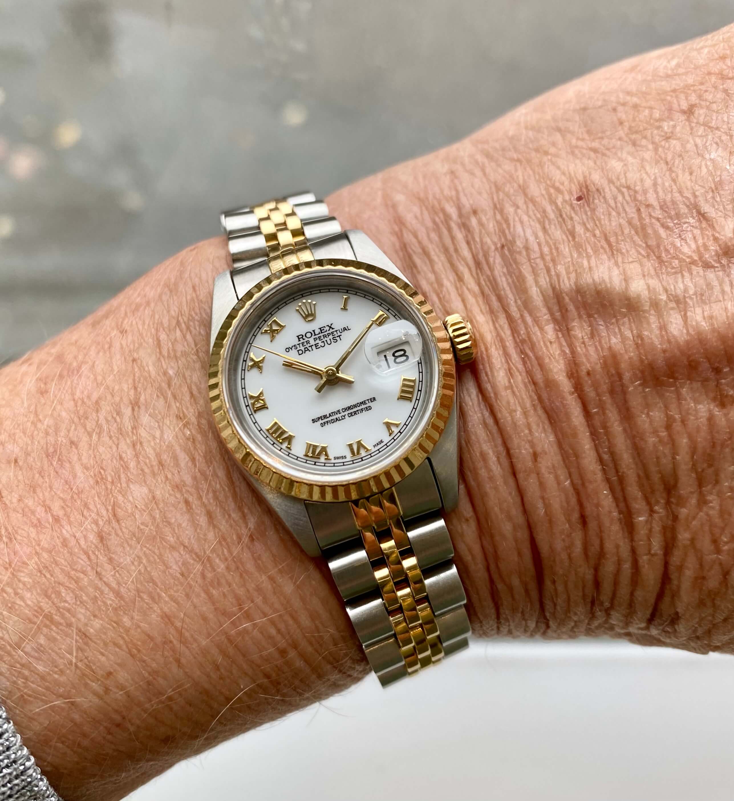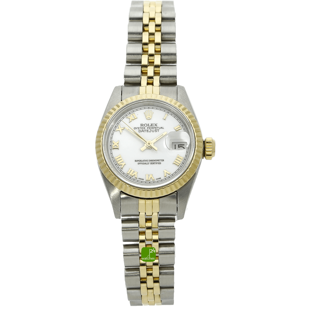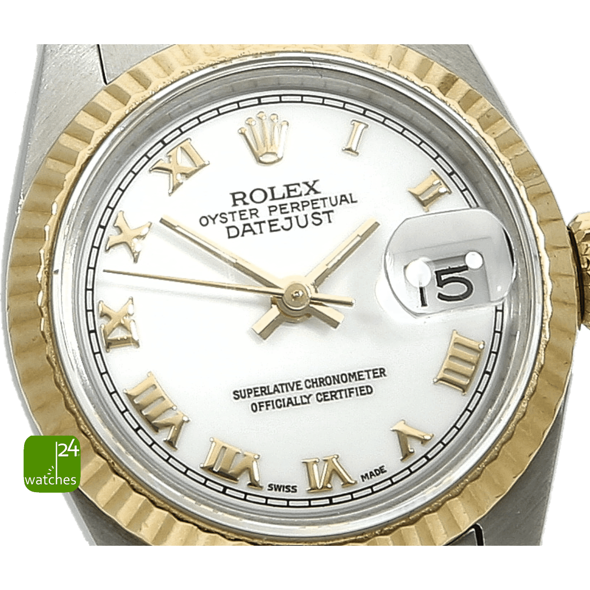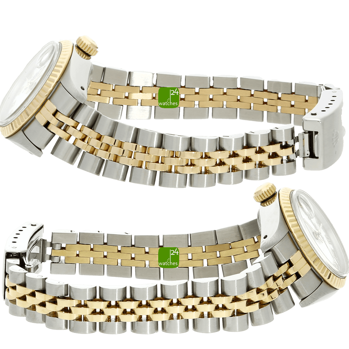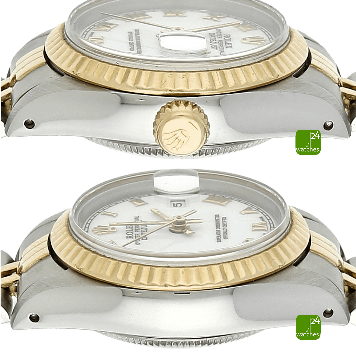Or jaune 18 carats / .750 et acier inoxydable| Diamètre du boîtier 26 mm mesuré sans couronne - avec couronne 28 mm | Cosse à cosse 32,5 mm | Hauteur du boîtier 10,2 mm | solide 1 fond vissé avec autocollant Rolex | Glace saphir avec loupe à trois heures pour agrandir la date 2,5 fois - en bon état | couronne Rolex d'origine vissée en or | Lynette Or jaune 18 carats moleté | Cosse 13 mm | Selon le fabricant, étanche jusqu'à 100 m, actuellement testé à 4 bar | Poids total 54,86 grammes