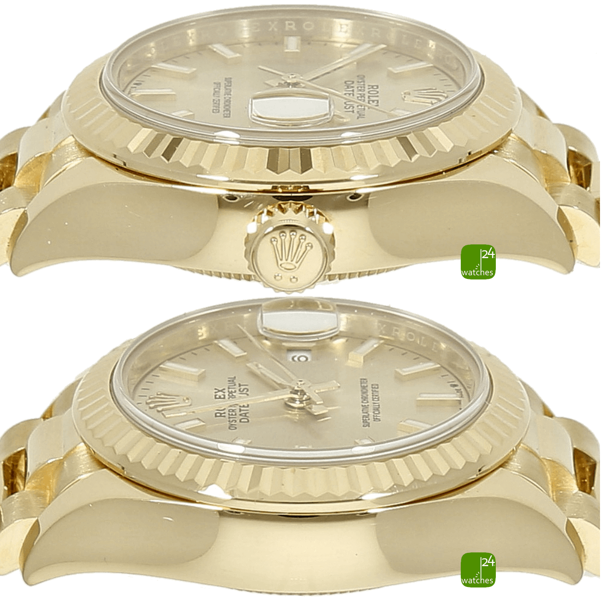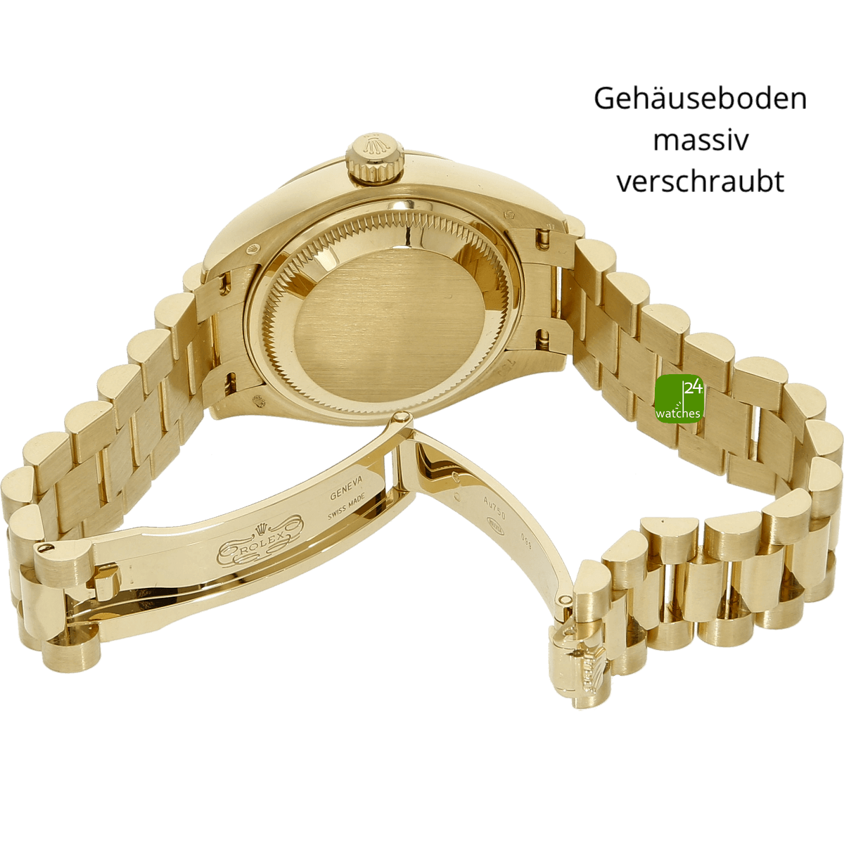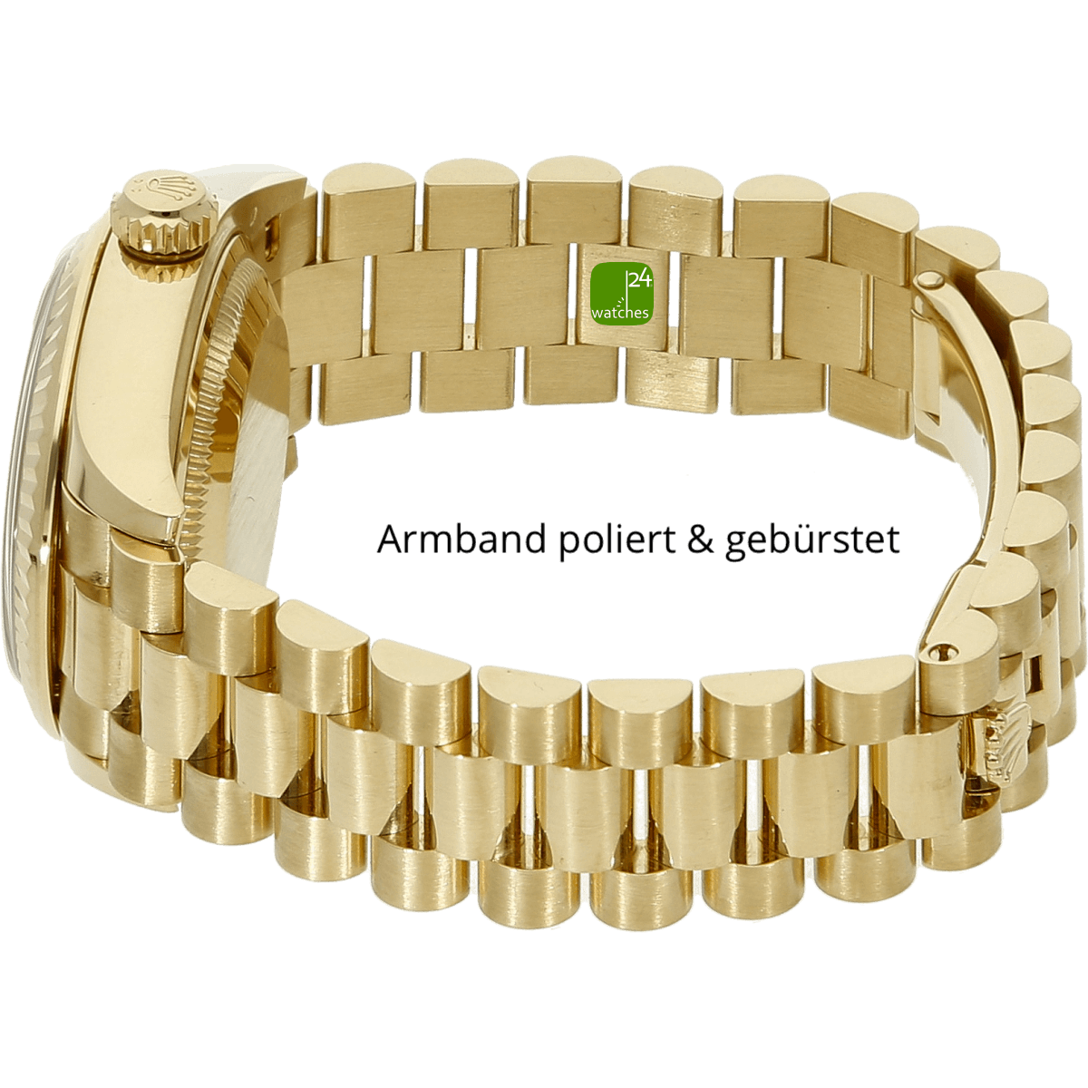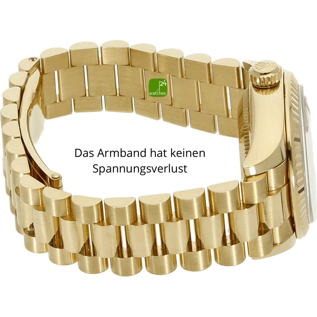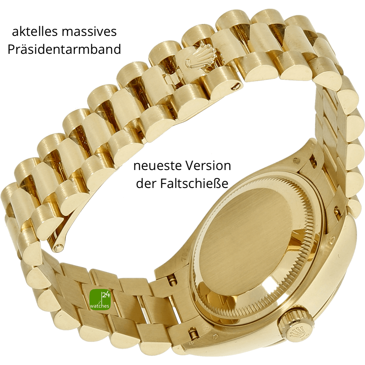 Bracelet original Rolex President en or jaune massif 18 ct / 0,750 - brossé et poli | boucle déployante originale Rolex recouverte - la version actuelle ne peut être ouverte que via la couronne | Longueur totale du bracelet et du boîtier de la montre env. 14,5 cm | le bracelet n'a aucune perte de tension