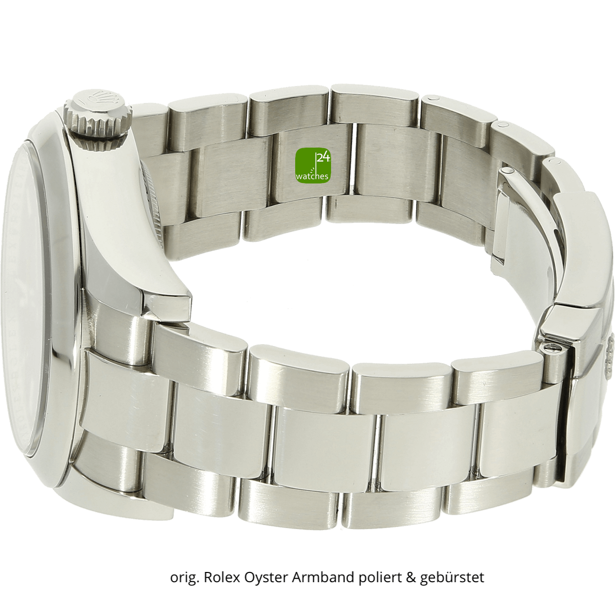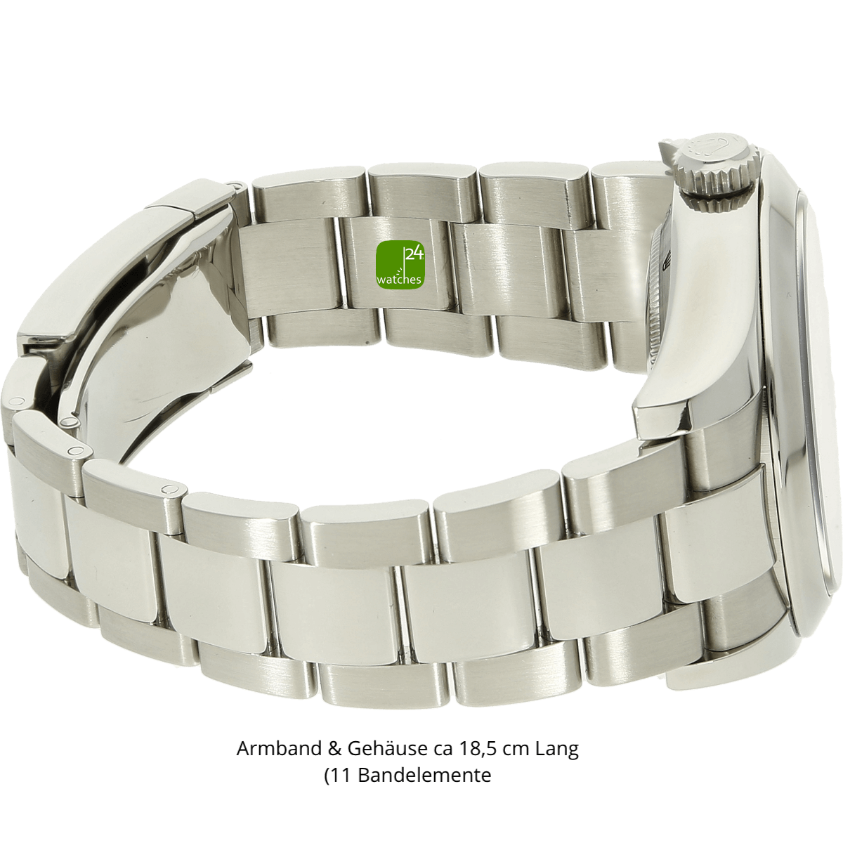bracelet original Rolex Oyster en acier inoxydable poli et brossé | Boucle déployante de boîte Rolex avec fonction de réglage rapide | Longueur totale du bracelet et du boîtier environ 18,5 cm | un total de 11 éléments de bande | le bracelet ne subit aucune perte de tension.