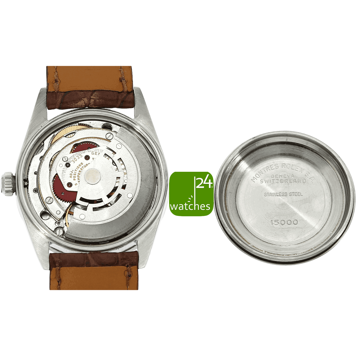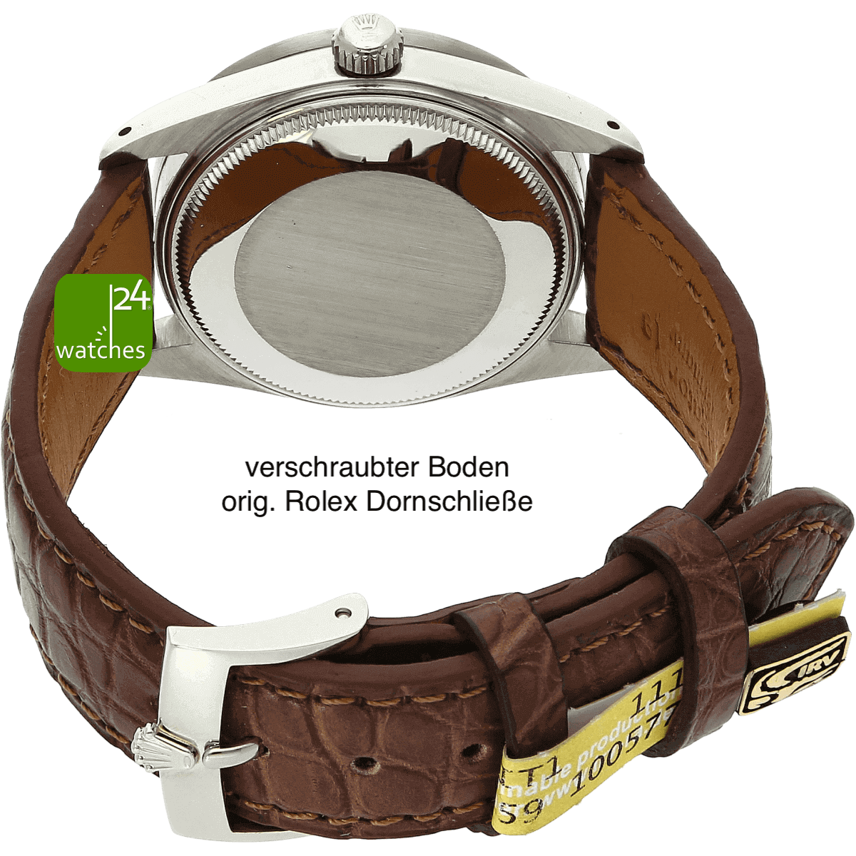 Inox brossé et poli | Diamètre du boîtier 34 mm sans couronne - avec couronne 37 mm | hauteur du boîtier 12 mm | Fond massif vissé | nouveau verre en plastique intact avec loupe de date à 3 heures | original Couronne Rolex vissée | Lunette en acier inoxydable avec bande et index des heures en bloc | Cosse 19 mm | Poids total 37,7 grammes