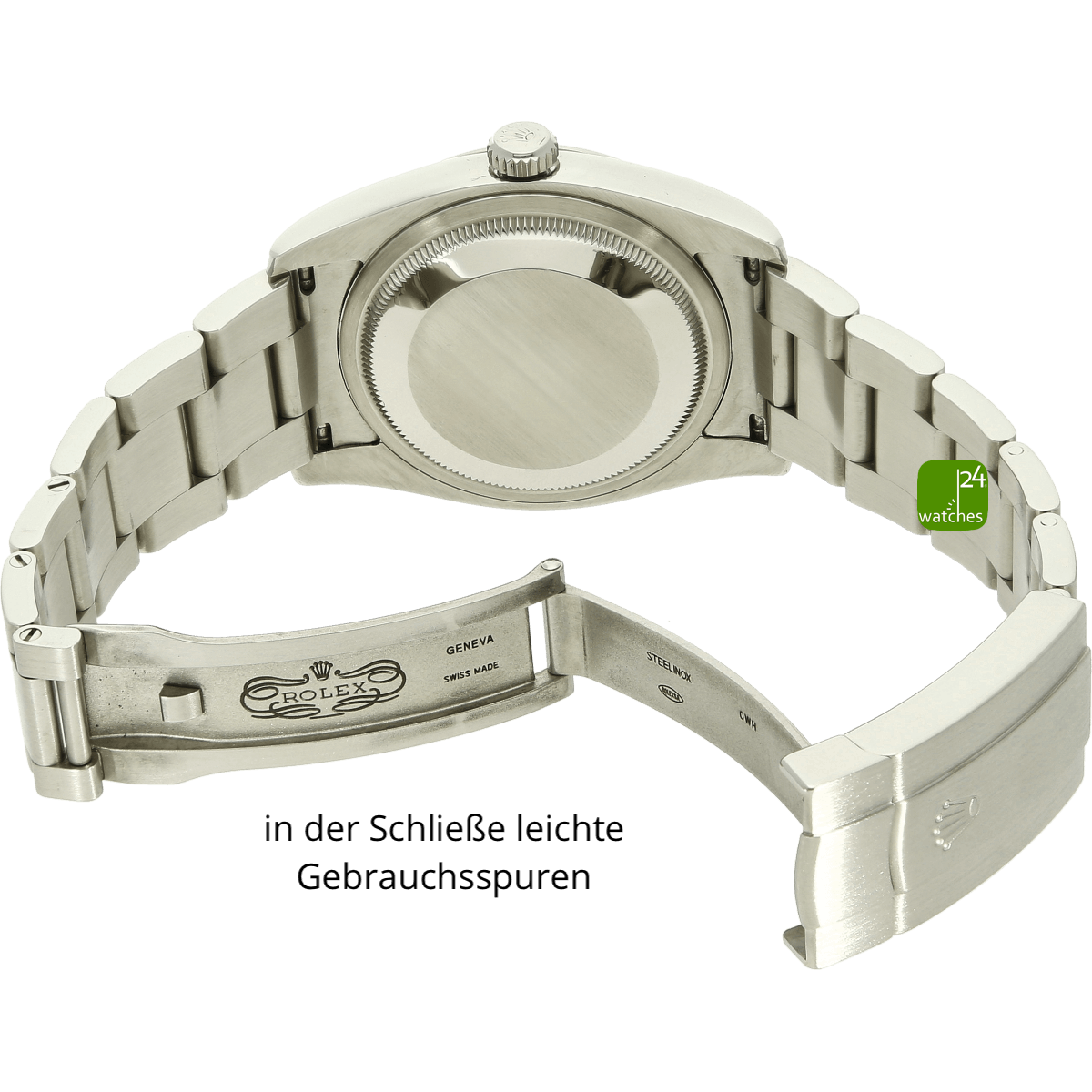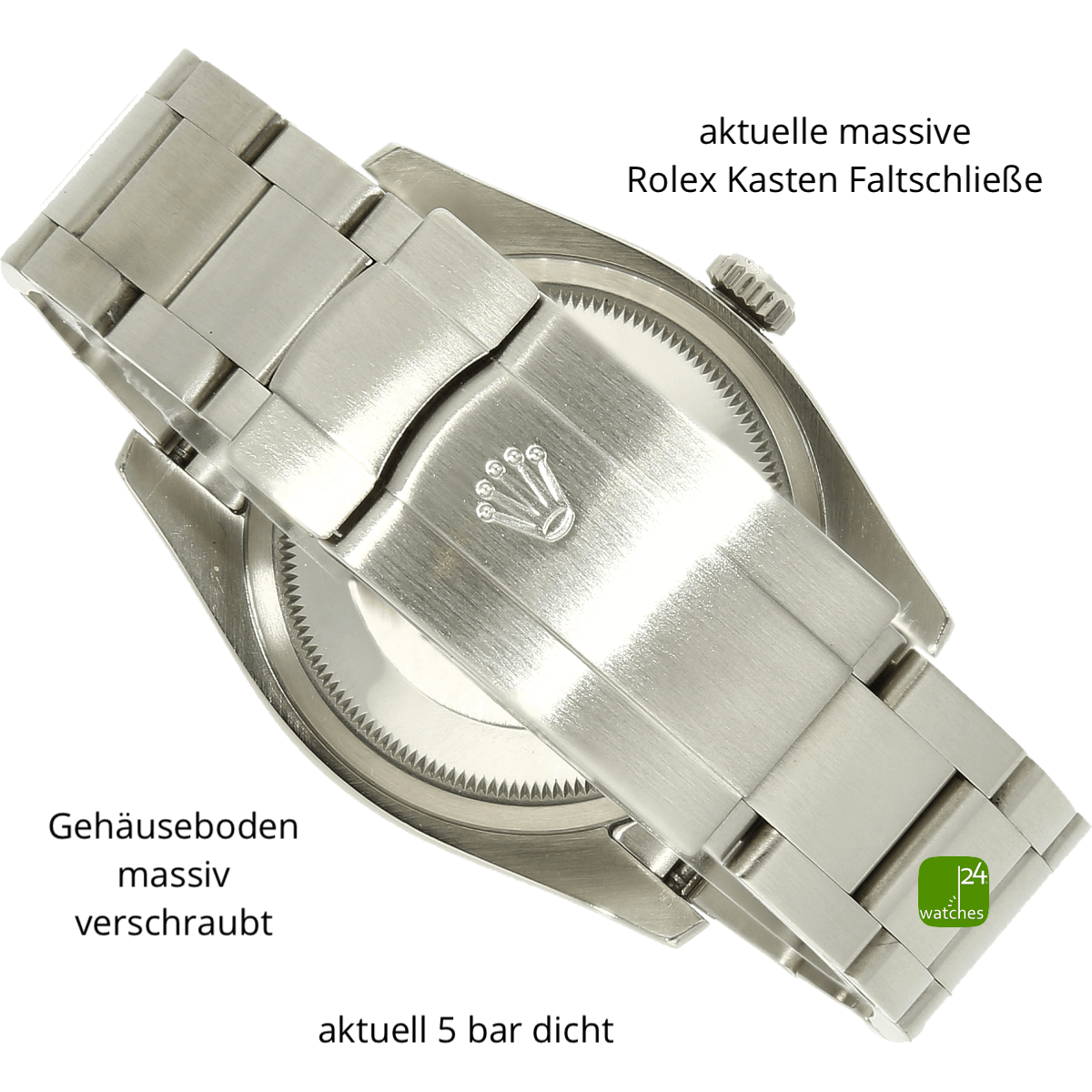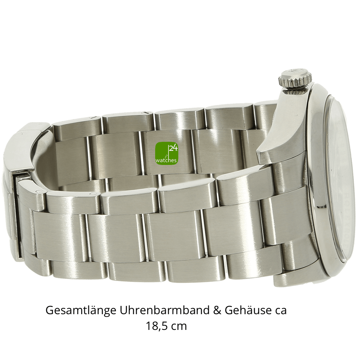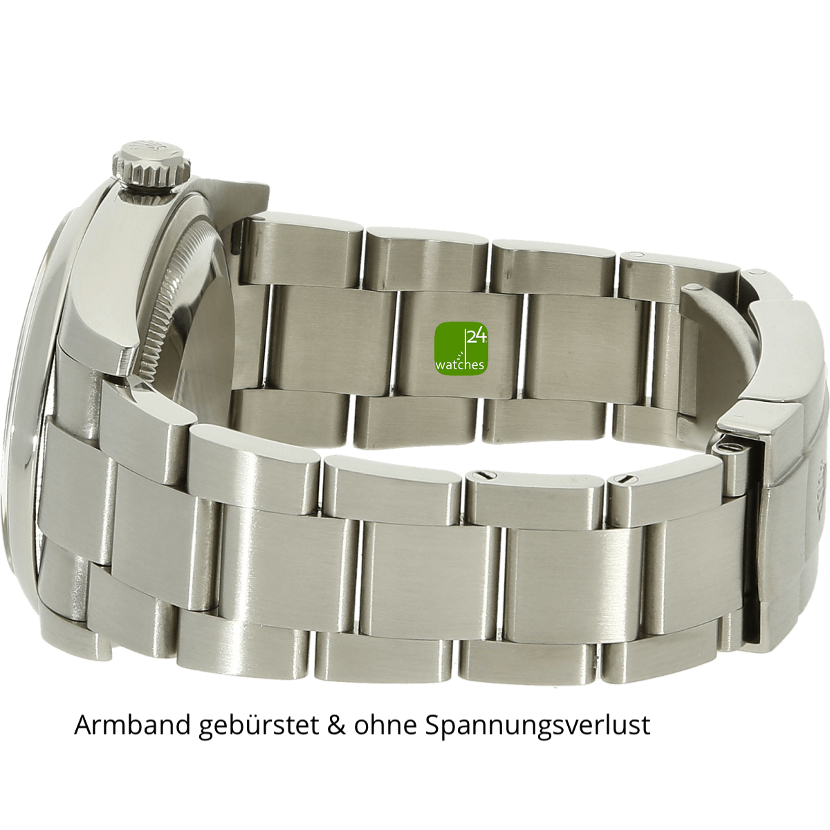 Acier inoxydable | Diamètre sans couronne mesuré 36 mm | avec couronne 39 | de patte à patte 44 mm | Hauteur du boîtier 11,5 mm | fond de boîtier solidement vissé | Verre saphir intact | couronne vissée orig Rolex | Lunette cambrée et polie | Cosse de bande 20 mm | Selon le fabricant, étanche à 100 m | Nous sommes actuellement testés positifs à 5 bars | Poids total 116,6 grammes