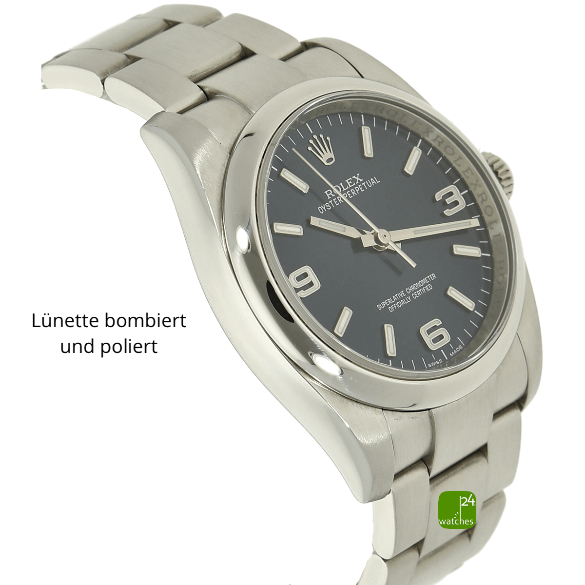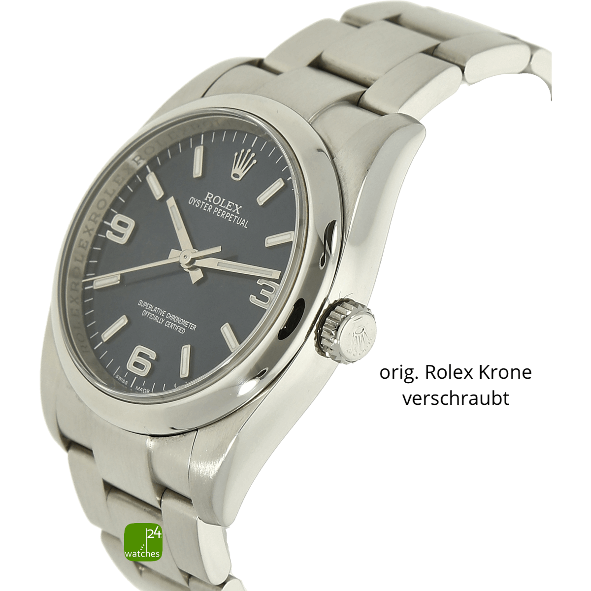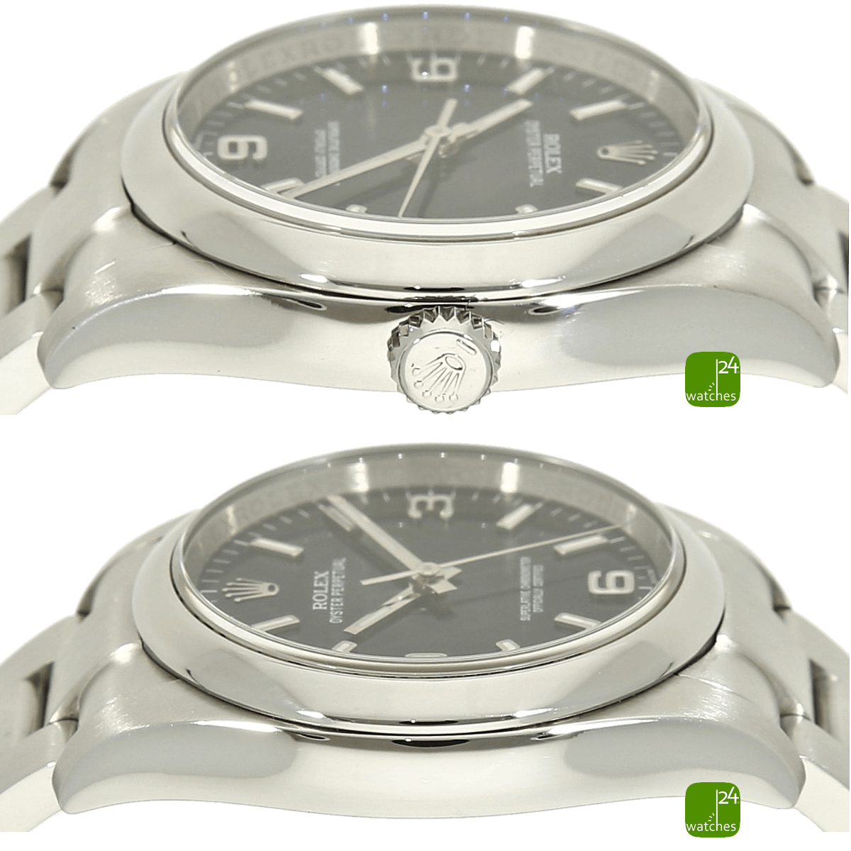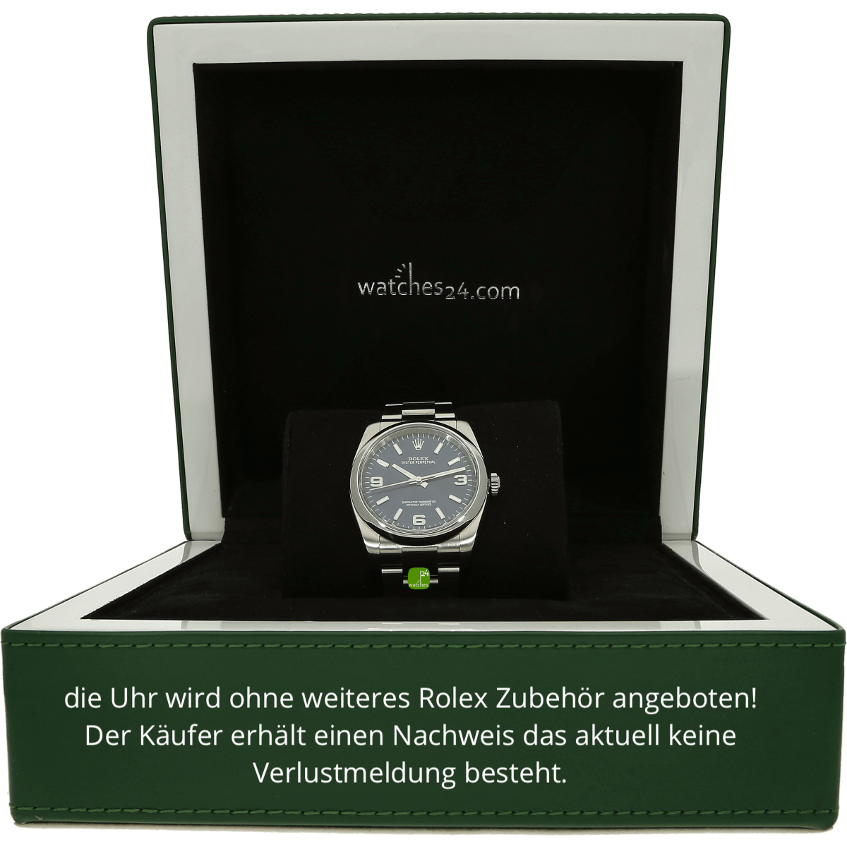 Acier inoxydable | Diamètre sans couronne mesuré 36 mm | avec couronne 39 | de patte à patte 44 mm | Hauteur du boîtier 11,5 mm | fond de boîtier solidement vissé | Verre saphir intact | couronne vissée orig Rolex | Lunette cambrée et polie | Cosse de bande 20 mm | Selon le fabricant, étanche à 100 m | Nous sommes actuellement testés positifs à 5 bars | Poids total 116,6 grammes