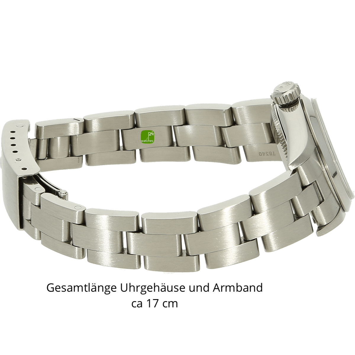 Acier inoxydable | Diamètre du boîtier 25 mm mesuré sans couronne - avec couronne 27 mm | De patte à patte 32 mm | Hauteur du boîtier 9,2 mm | fond de boîtier solidement vissé | Glace saphir - sans dommage | couronne vissée orig Rolex | Lynette en acier inoxydable poli | Cosse de bande 13 mm | Selon le fabricant, étanche jusqu'à 100 m - actuellement testé à 5 bar | Poids total 46,9 grammes