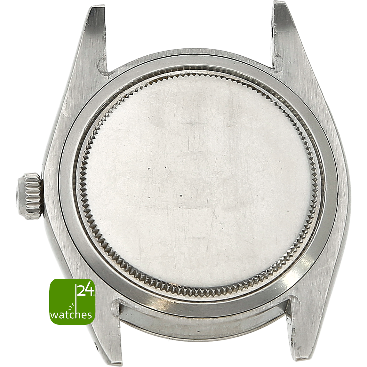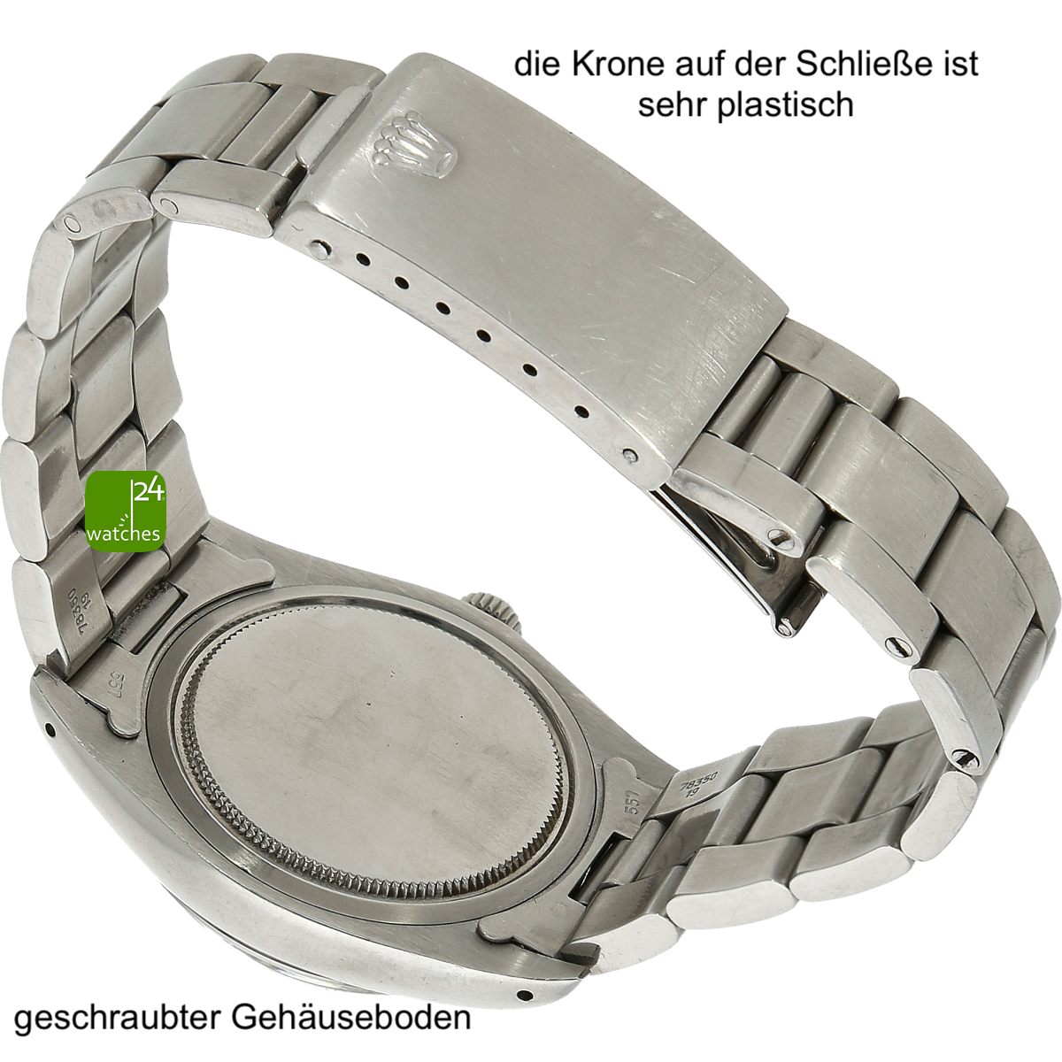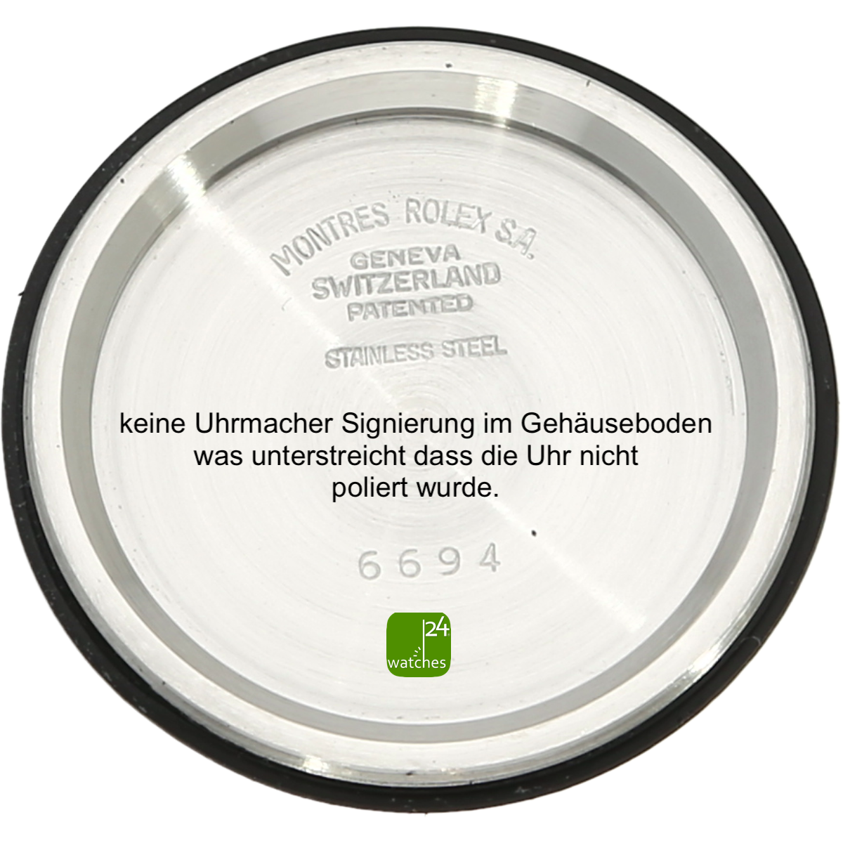 acier inoxydable | Diamètre du boîtier 34 mm mesuré sans couronne - avec couronne 37,5 mm | Cosse à cosse 42,5 mm | Hauteur du boîtier 11,5 mm | fond plat solide vissé | Verre en plastique avec loupe à trois heures pour agrandir la date 2,5 fois - avec de légers signes d'usure, probablement poli | couronne Rolex d'origine vissée | Inox poli Lynette | Cosse 19 mm | Selon le fabricant, étanche à 100 m | Poids total 84,90 grammes