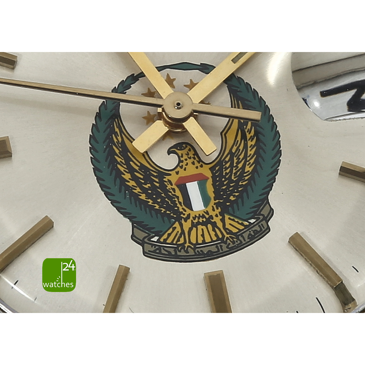 index des heures compensés appliqués en or jaune | Points luminescents imprimés au tritium au-dessus des index des bâtons - tous présents | Piste des minutes imprimée en noir | date digitale à 3h | Aiguilles obélisques en or jaune remplies de matière luminescente au tritium - orgi Armoiries de la Force militaire d'Abu Dhabi imprimées
