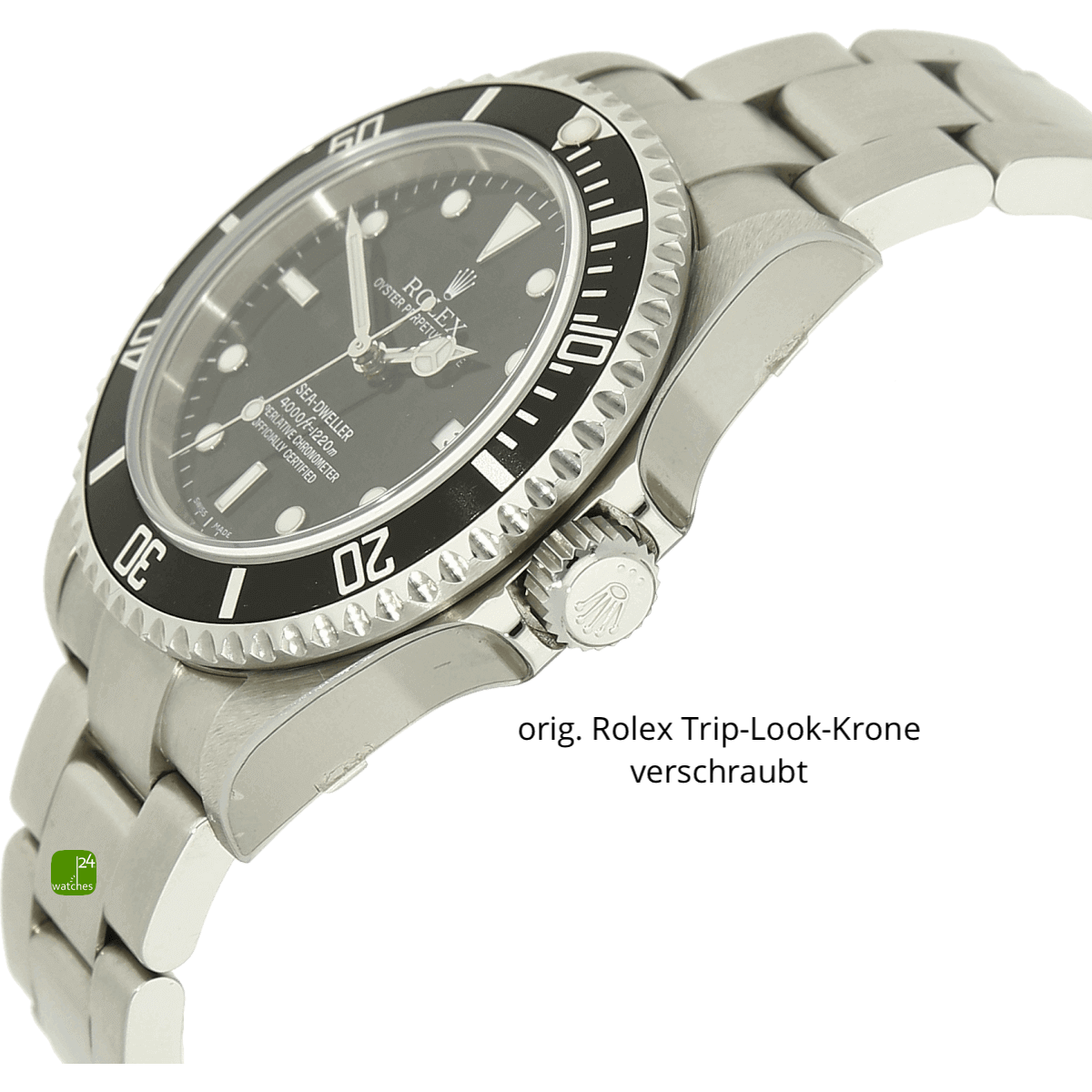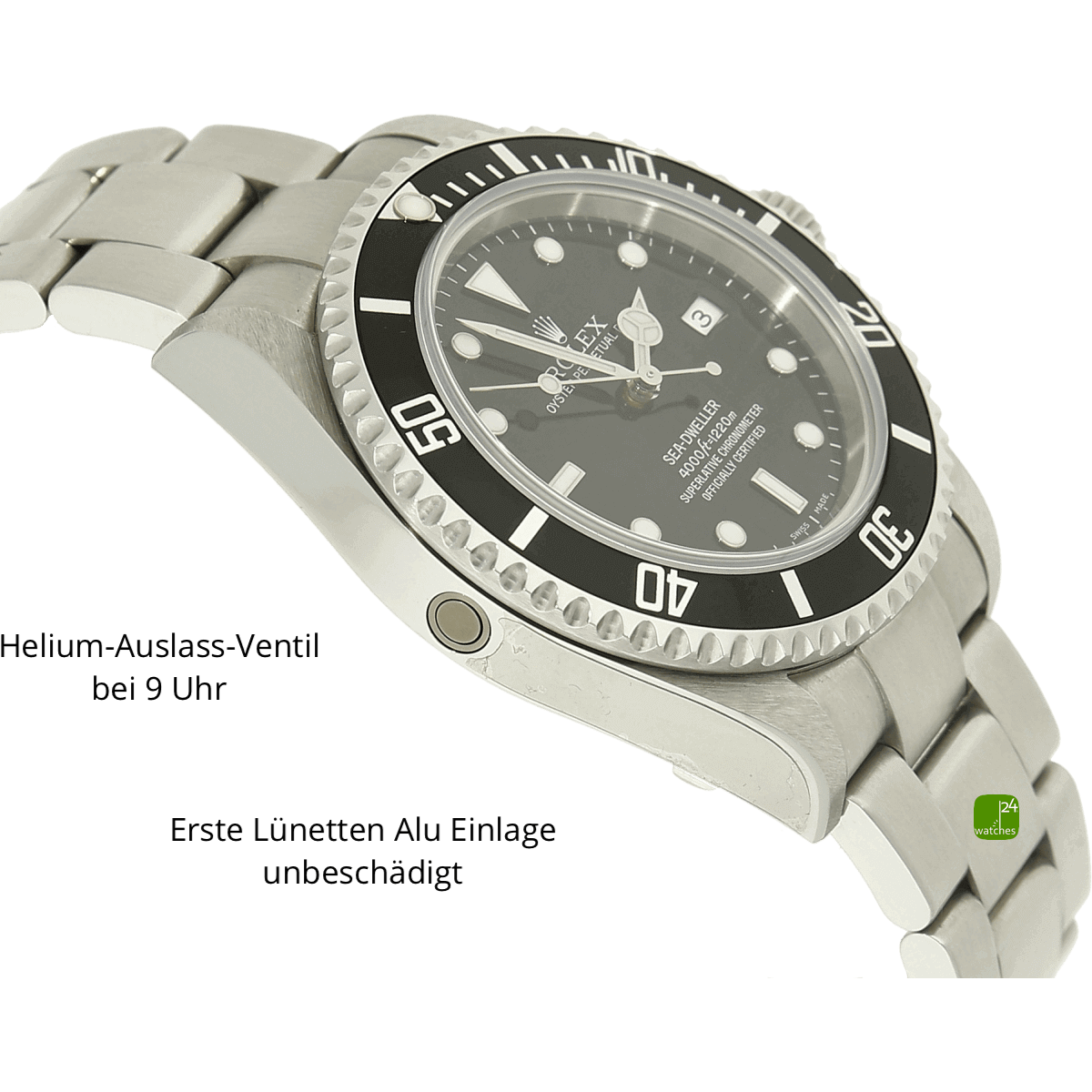 Acier inoxydable poli et brossé | Diamètre du boîtier 40 mm sans couronne | avec couronne 44 mm | de patte à patte 47,5 mm | Hauteur du boîtier 14 mm | fond de boîtier vissé solide avec gravures du fabricant encore collées | Verre saphir intact | couronne vissée d'origine Rolex Triplook | Valve d'échappement à hélium à neuf heures | Lunette rotative dans un sens, indexation à 60 niveaux avec incrustation en aluminium imprimé | Largeur des cornes 20 mm | Selon le fabricant, résistant à l'eau jusqu'à 1220 m | Poids total 150 grammes