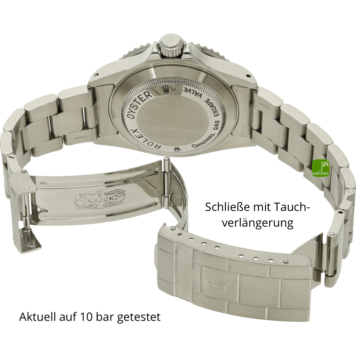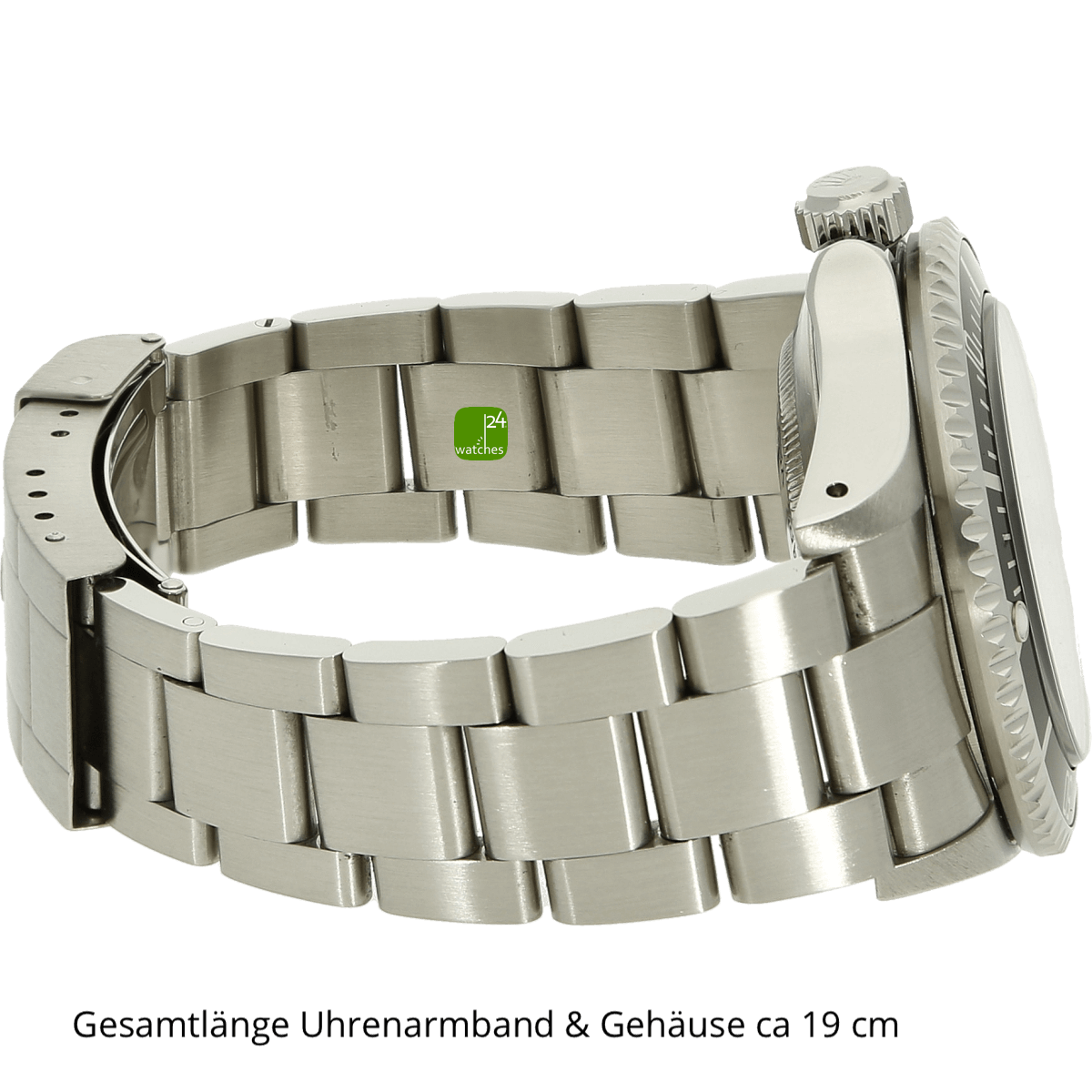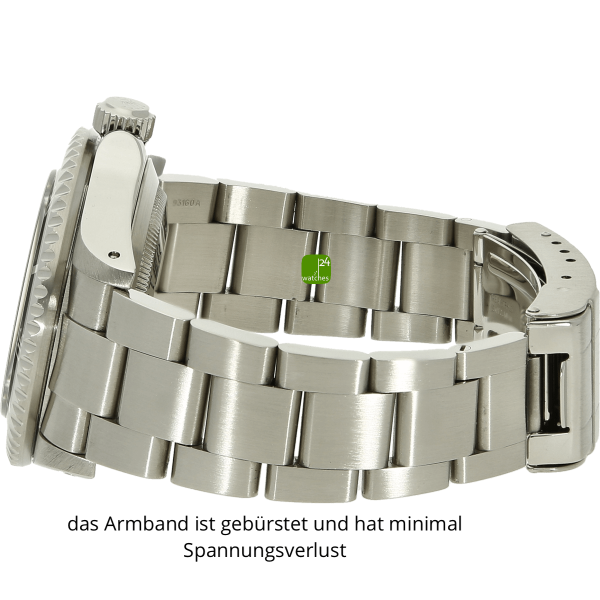 Bracelet original Rolex Oyster en acier inoxydable | 93160A avec cosses pleines | Boucle déployante de boîte Orig Rolex avec extension de plongée et barre de sécurité | Longueur totale du bracelet et du boîtier de la montre : environ 19,0 cm. Le bracelet présente une perte de tension minimale