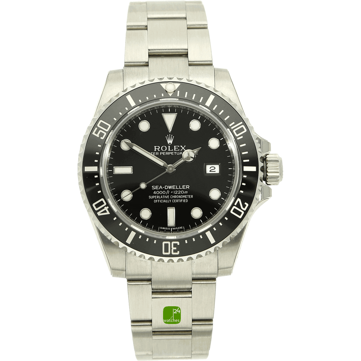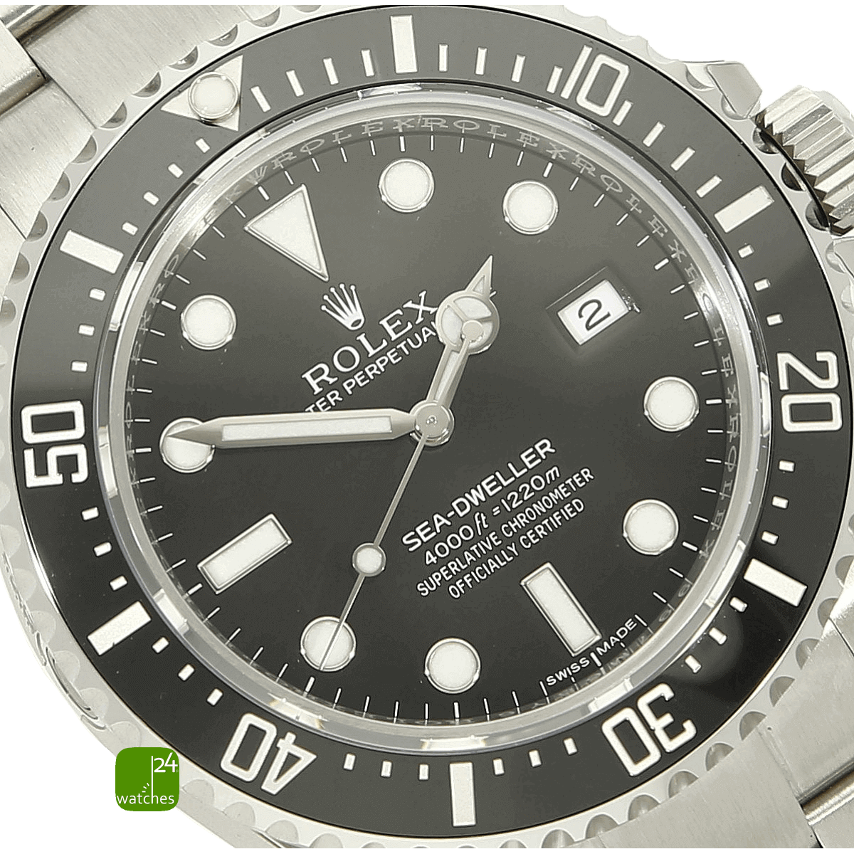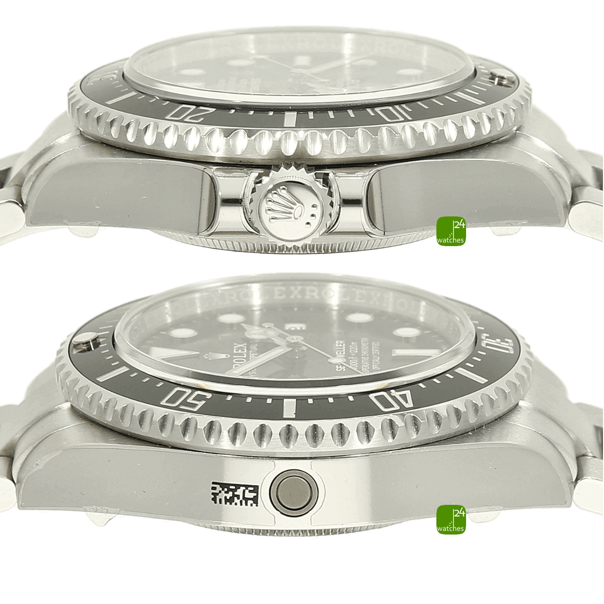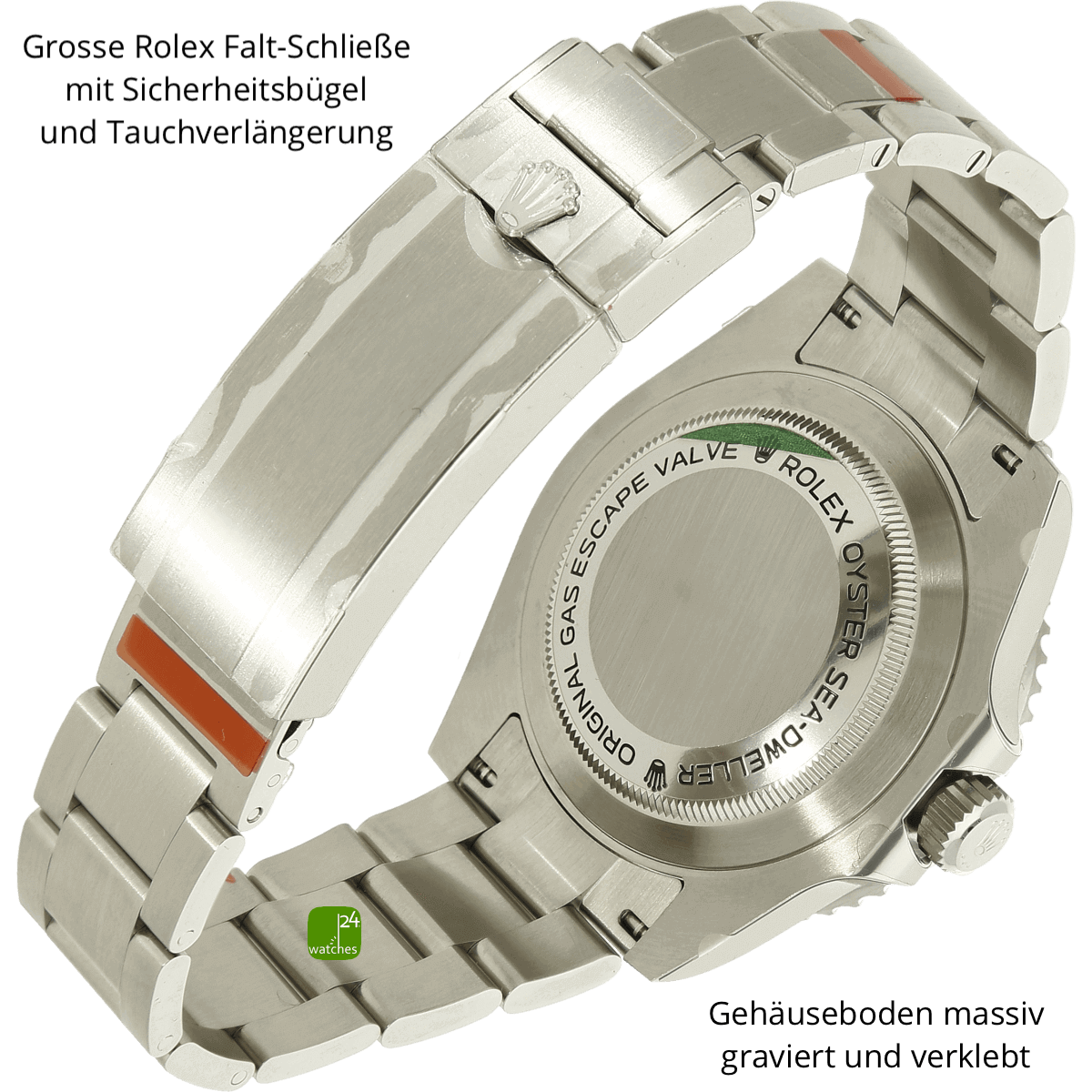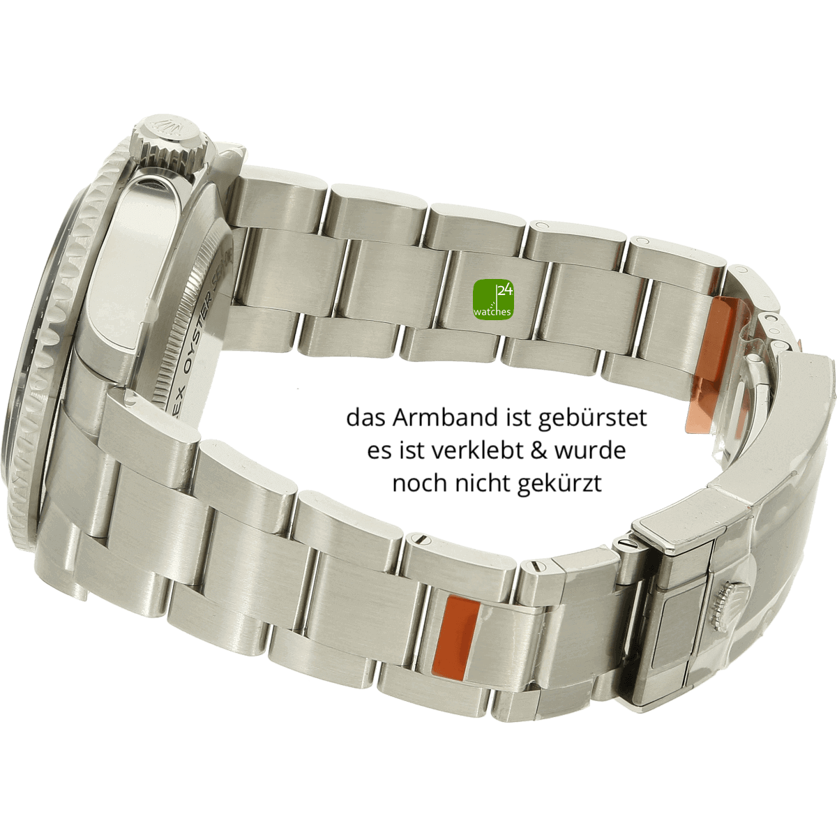 Acier inoxydable poli et brossé - et original. Emballage de transport Rolex | Diamètre du boîtier mesuré sans couronne 40 mm - avec couronne 44 mm | Longueur totale d'une patte à l'autre 46 mm | Hauteur du boîtier 14,5 mm | fond de boîtier vissé solide avec gravures du fabricant | verre saphir Rolex d'origine intact | Couronne Rolex d'origine revissée | Lynette rotative unidirectionnelle verrouillable à 120 positions avec insert Cerachrom | Valve à hélium à 9 heures | Largeur des cornes 20 mm | Selon le fabricant, résistant à l'eau jusqu'à 1220 m | Poids total 163,60 grammes