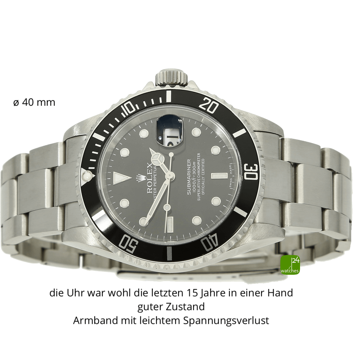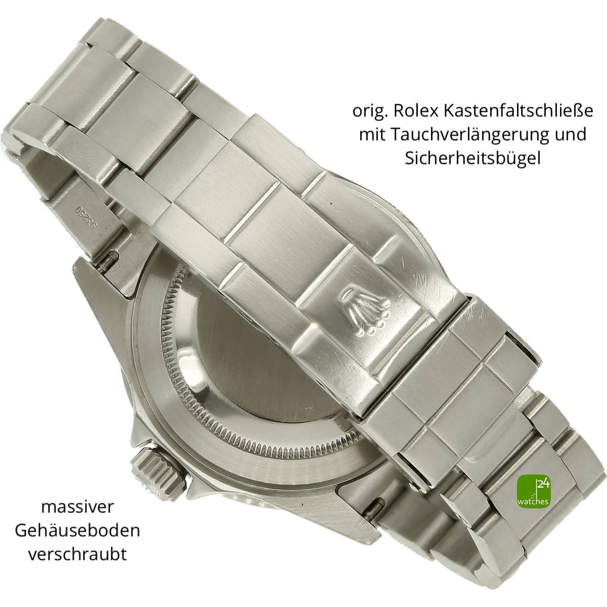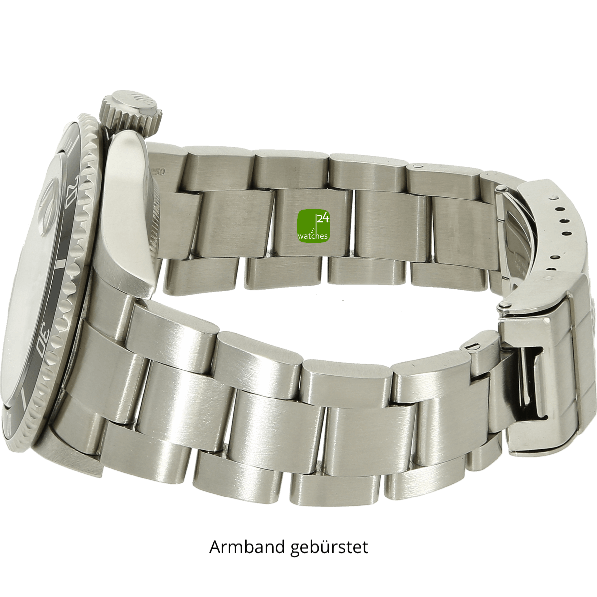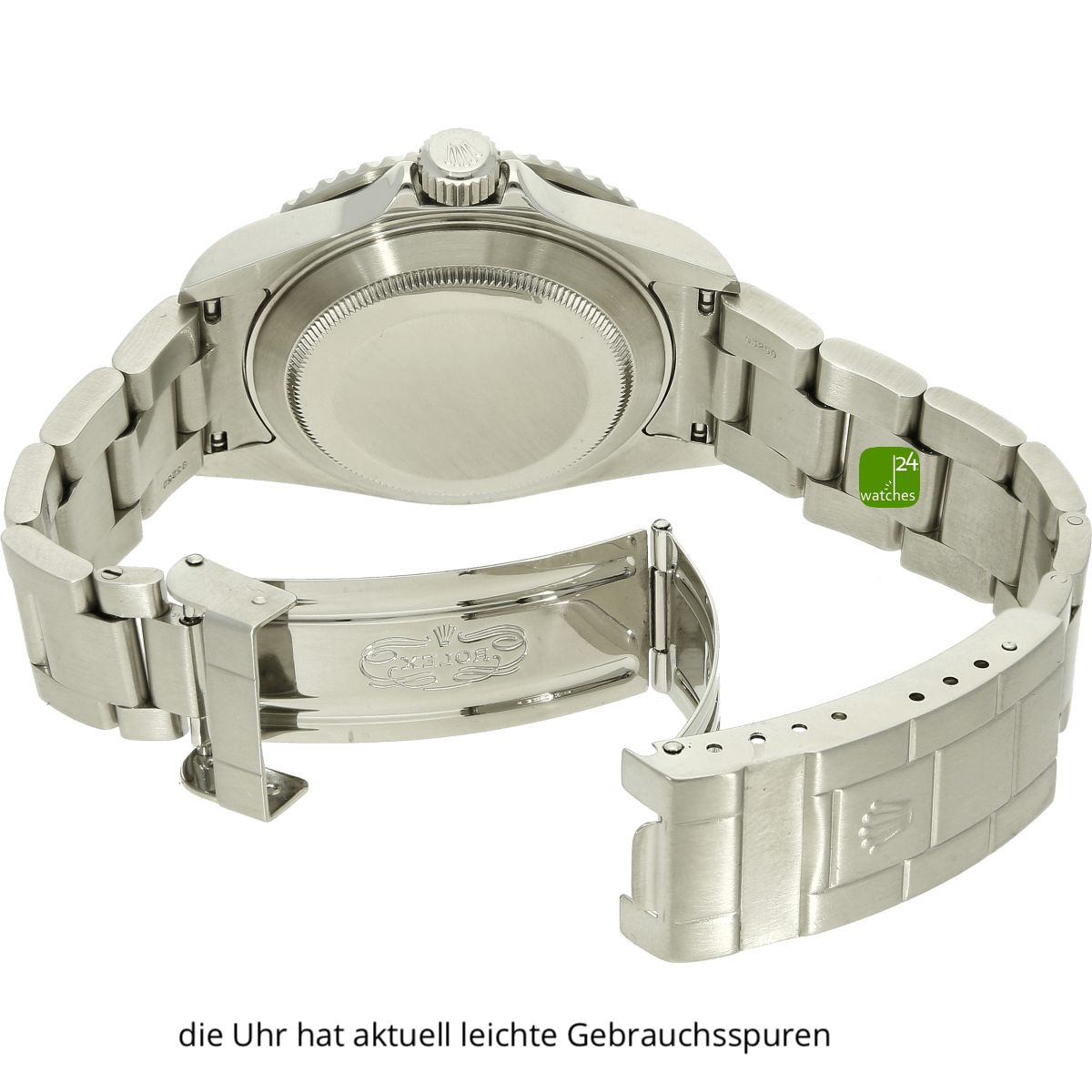 acier inoxydable | Diamètre du boîtier 40 mm mesuré sans couronne - avec couronne 44 mm | De cosse à cosse 47 mm | hauteur du boîtier 12 mm | Fond massif vissé | Glace saphir avec loupe à trois heures pour agrandir la date 2,5 fois - en bon état | couronne Rolex d'origine vissée | La lunette peut être tournée dans une direction et cliquetée jusqu'à 60 fois avec un insert en aluminium non endommagé | Cosse 20 mm | Selon le fabricant, étanche jusqu'à 300 m - actuellement testé | Poids total 133,5 grammes