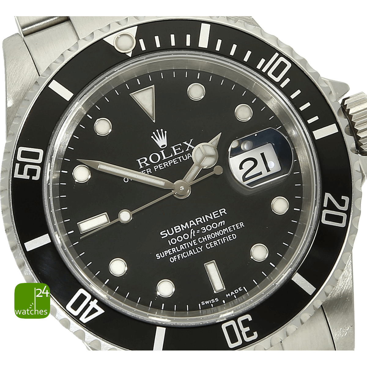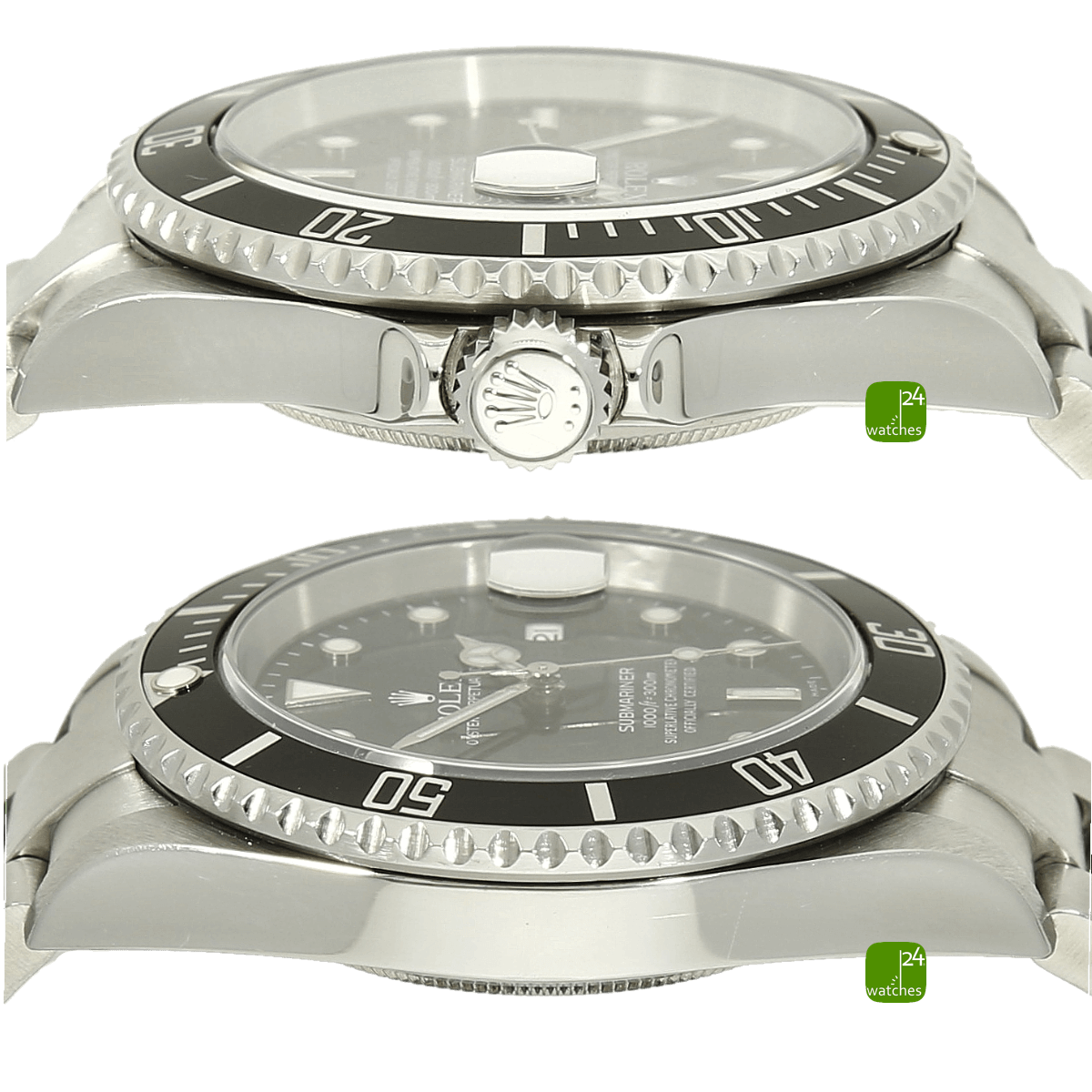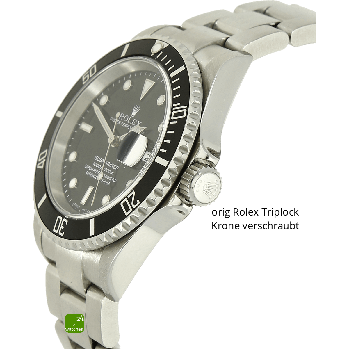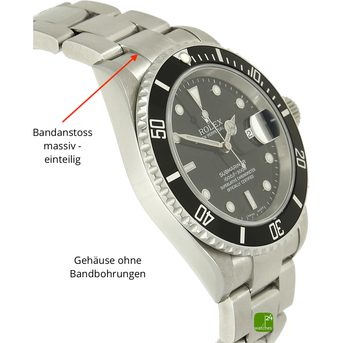 acier inoxydable | Diamètre du boîtier 40 mm mesuré sans couronne - avec couronne 44 mm | De cosse à cosse 47 mm | hauteur du boîtier 12 mm | Fond massif vissé | Glace saphir avec loupe à trois heures pour agrandir la date 2,5 fois - en bon état | couronne Rolex d'origine vissée | La lunette peut être tournée dans une direction et cliquetée jusqu'à 60 fois avec un insert en aluminium non endommagé | Cosse 20 mm | Selon le fabricant, étanche jusqu'à 300 m - actuellement testé | Poids total 133,5 grammes