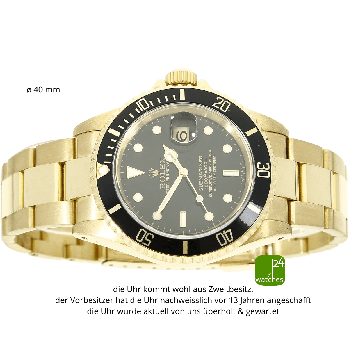 Or jaune 18 ct / 0,750 | Diamètre du boîtier 40 mm mesuré sans couronne - avec couronne 44 mm | De barrette à barrette 47 mm | Hauteur du boîtier 12 mm | fond de boîtier solidement vissé | Glace saphir avec loupe à trois heures pour agrandir la date 2,5 fois - sans dommage | couronne vissée orig Rolex | La lunette peut être tournée d'un côté et se verrouille 60 fois avec 1. Incrustation en aluminium avec de légers signes d'usure Cosse de bande 20 mm | Selon le fabricant, étanche jusqu'à 300 m - actuellement testé | Poids total 169,80 grammes