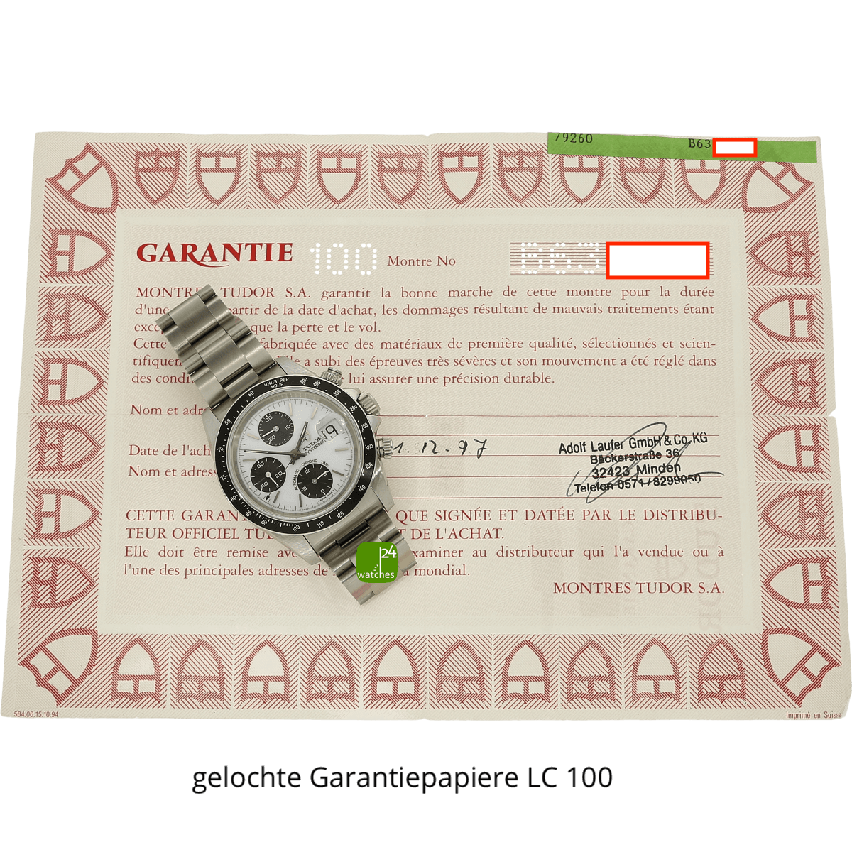 L'original Tudor. Documents de garantie du 31 décembre 1997 du Juwelier Laufer à Minden