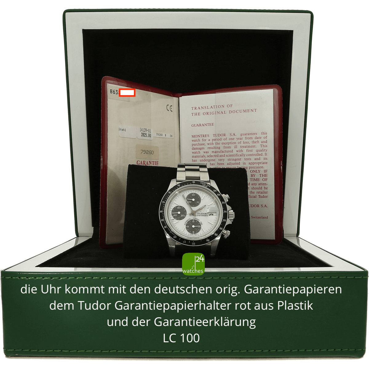 Hat die Uhr keine Original-Papiere, bescheinigen wir die Echtheit in Form eines Zertifikates. Die Referenz-/ Serien-Nummer wird von uns dokumentiert in der personalisierten watches24-Rechnung.