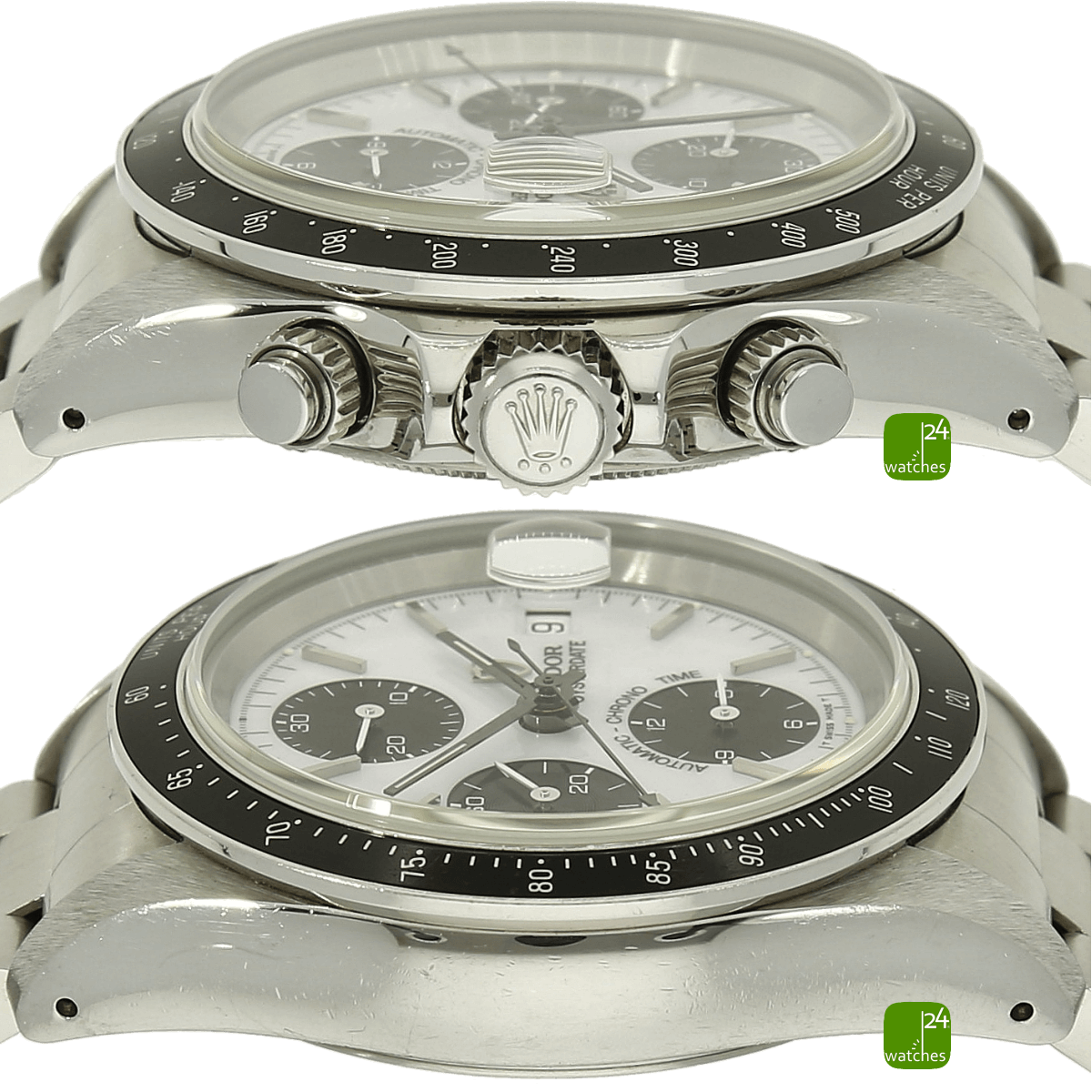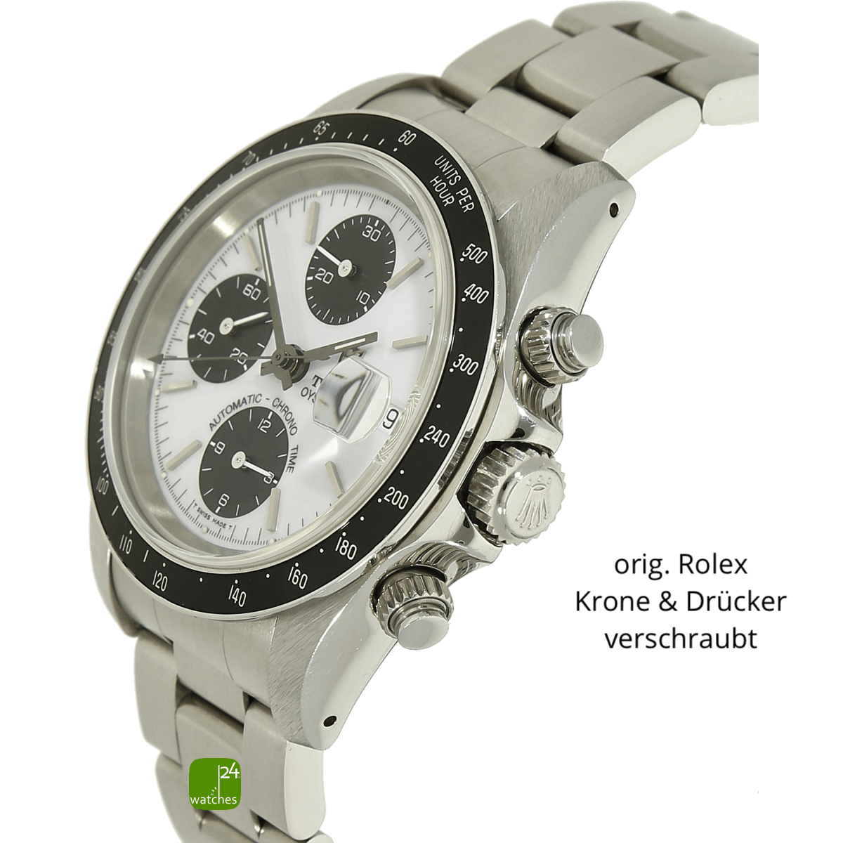 blanc pur | en émail ! avec le vernis de protection Zapon, le lettrage Oysterdate est imprimé en très relief et semble être en 3 dimensions - tout comme le lettrage fin au-dessus du totalisateur à 6 heures "AUTOMATIC - CHRONO - TIME" | Index de canne attachés | chronographe encastré noir affiche à 6 -9 - 12 dans la conception record | échelle des minutes imprimée en noir | date numérique à trois heures |