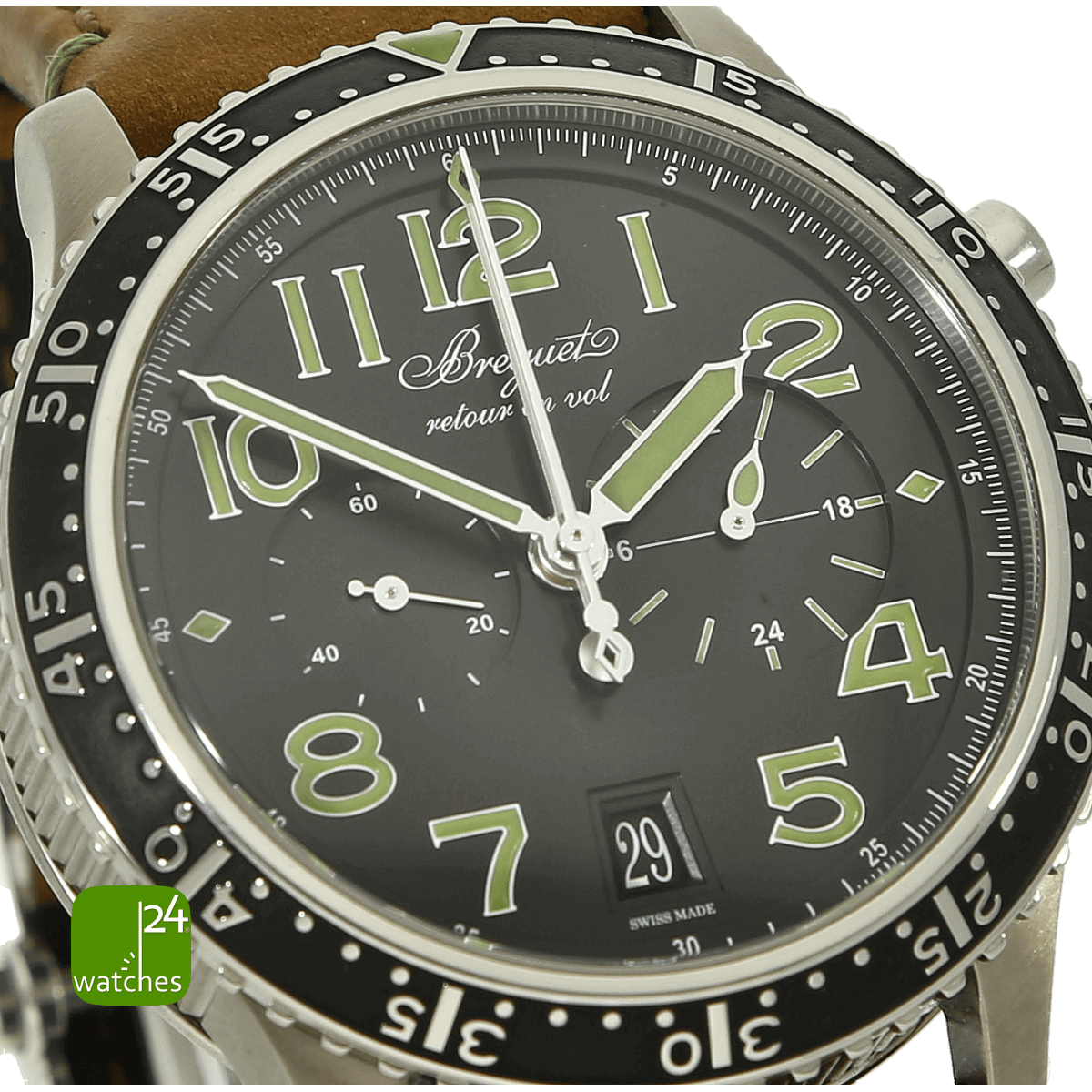 matt schwarz | mit grüner Leuchtmasse gedruckte arabische Indides | weiss gedruckte Minuterie | vertiefte 24 Stunden Anzeige bei 3 Uhr | digitales Datum bei 6 Uhr | permanente Sekunde bei 9 Uhr | Chronographen Anzeige über Zentral Sekunde und Zentral Minute - so sehr selten mit Flyback Funktion | Zeiger in Pfeilform in Edelstahl mit grüner Leuchtmasse befüllt