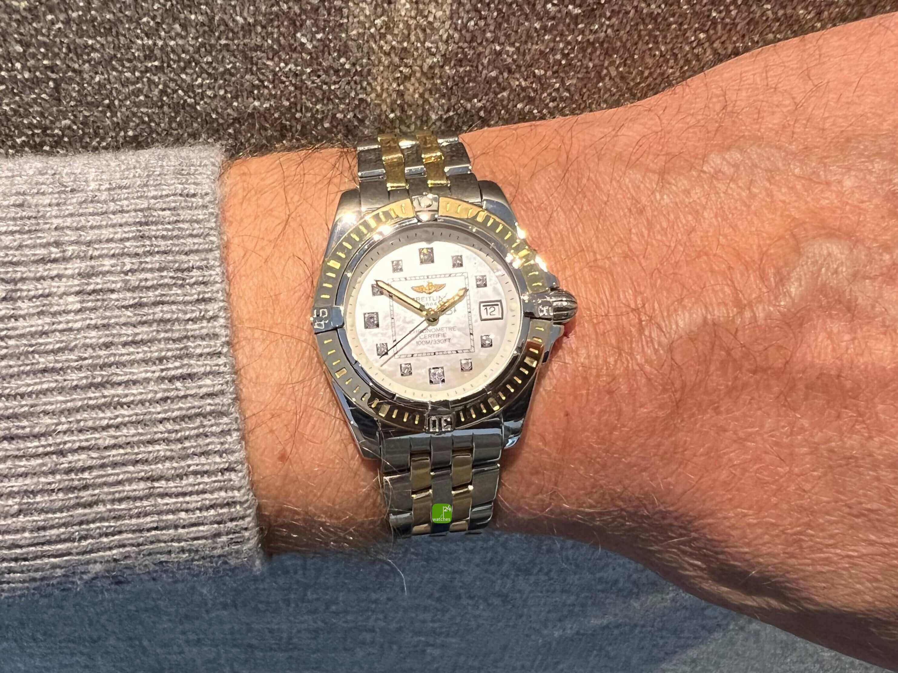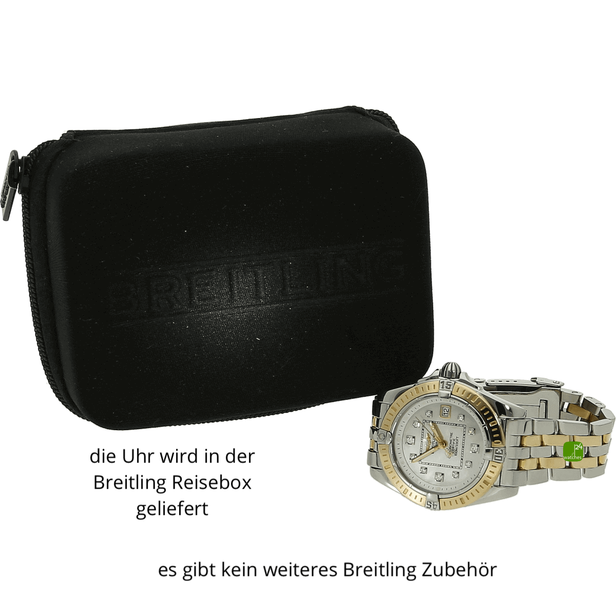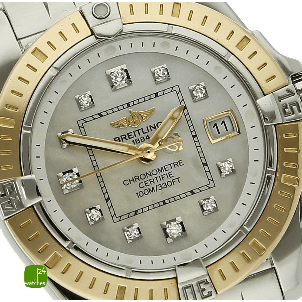 perlmutt hell | in Weissgold gesetzte Brillantindechse 11 Stück | in der Rehaut gedruckte Minuterie mit Leuchtmakierungen schwarz gedruckt | digitales Datum bei 3 Uhr | Gold Pfeil Zeiger mit Leuchtmasse belegt | Sekundenzeiger mit den typischen Breitling B