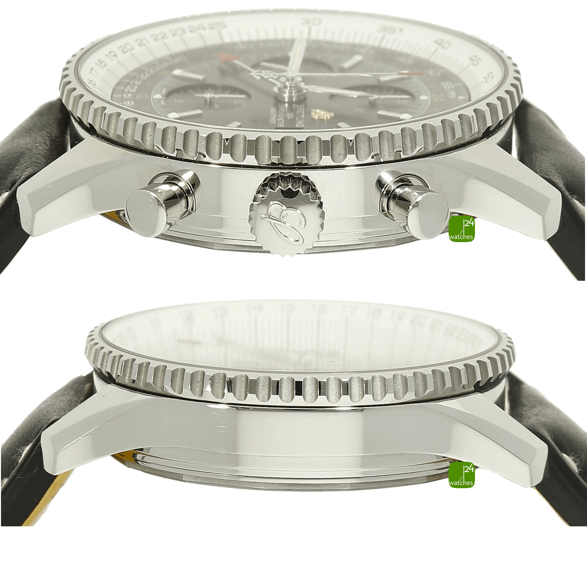Edelstahl poliert | Durchmesser ohne Krone gemessen 46 mm | mit Krone 48 mm | von Bandanstoss zu Bandanstoss 53 mm | Gehäusehöhe 14,5 mm | geschraubter Gehäuse Boden mit Hersteller Gravuren | Saphirglas unbeschädigt und entspiegelt | orig Breitling Krone | beidseitig drehende Lünette | Bandanstoss 24 mm | lt Hersteller wassergeschützt | Gesamtgewicht 129,37 Gramm
