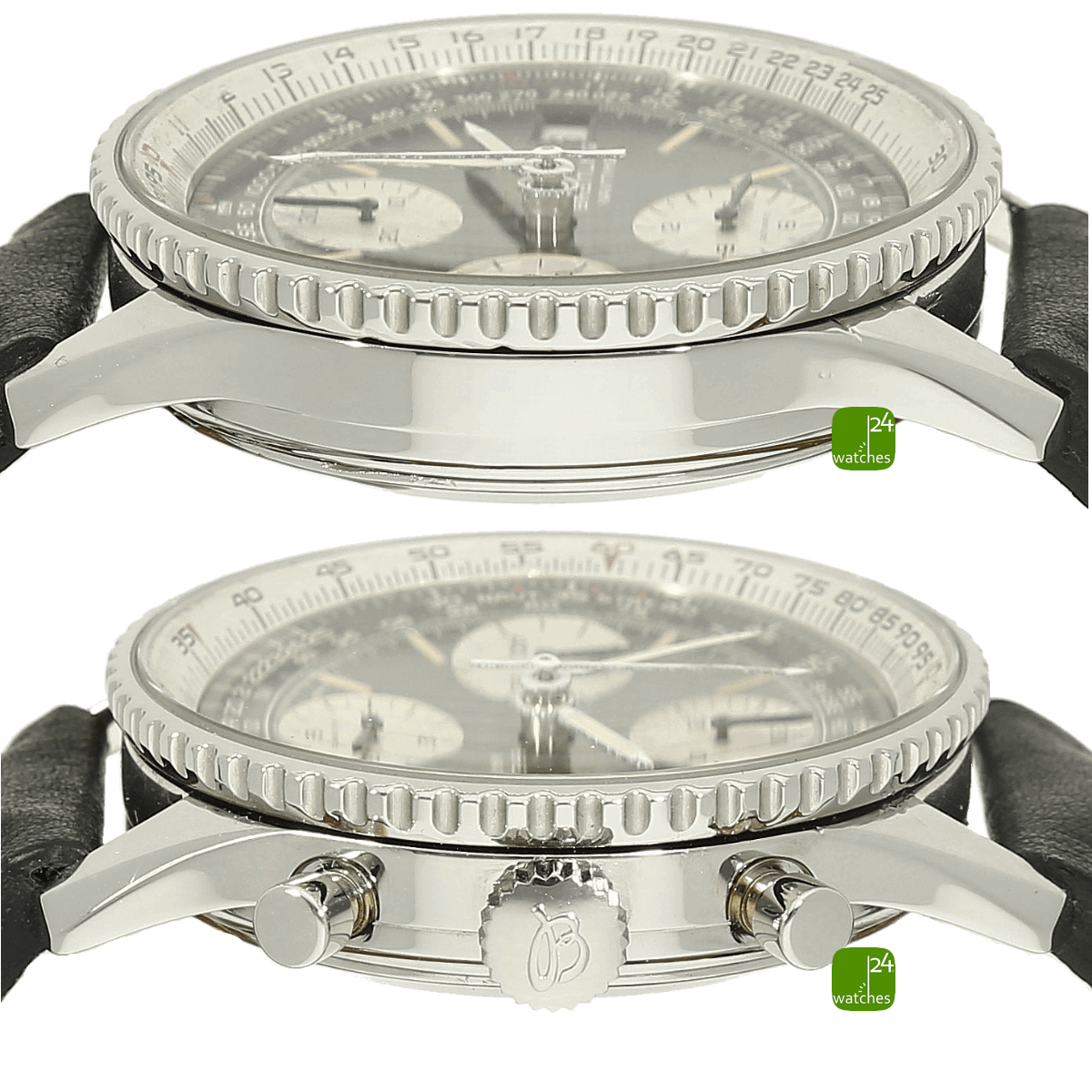 Edelstahl poliert | Gehäusedurchmesser 41 mm ohne Krone gemessen | mit Krone 43 mm | von Bandanstoss zu Bandanstoss 48 mm | Gehäusehöhe 13 mm | massiver Edelstahl Boden geschraubt mit Hersteller Gravuren | Saphirglas 2 fach entspiegelt und unbeschädigt | orig Breitling Krone | Lünette beidseitig drehbar ohne Rasterung | lt Hersteller bis 30 m wasserdicht - aktuell nicht dicht. | Bandanstoss 22 mm | Gesamtgewicht 104. Gramm