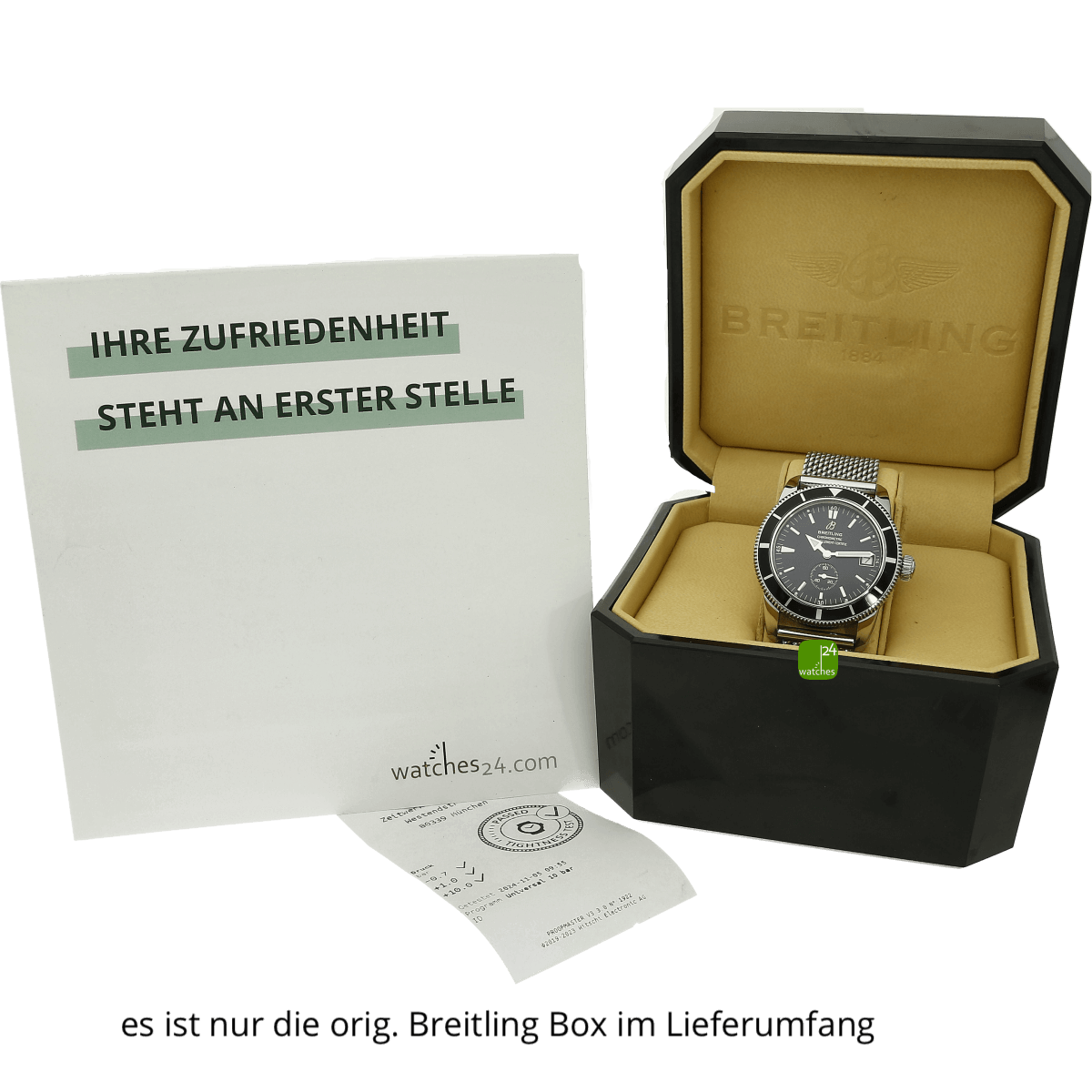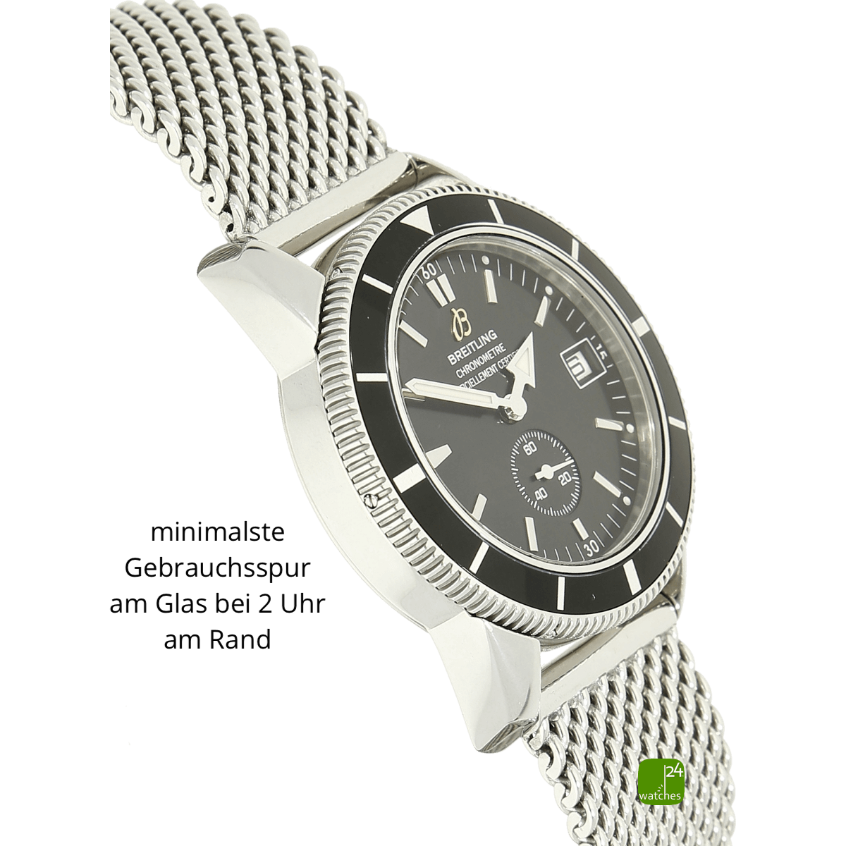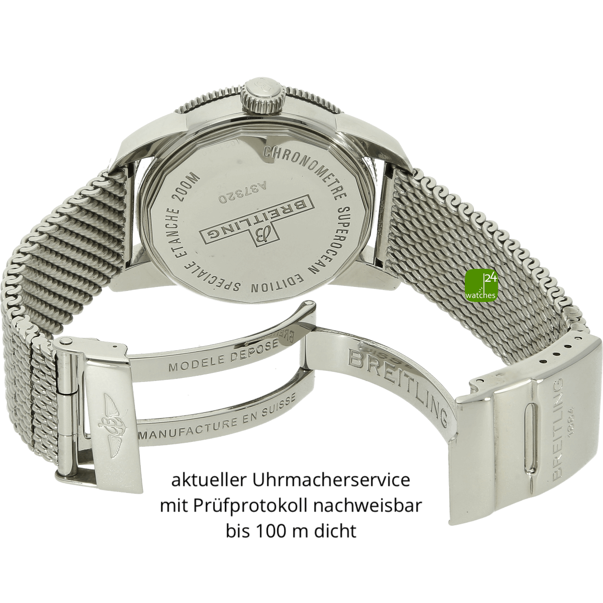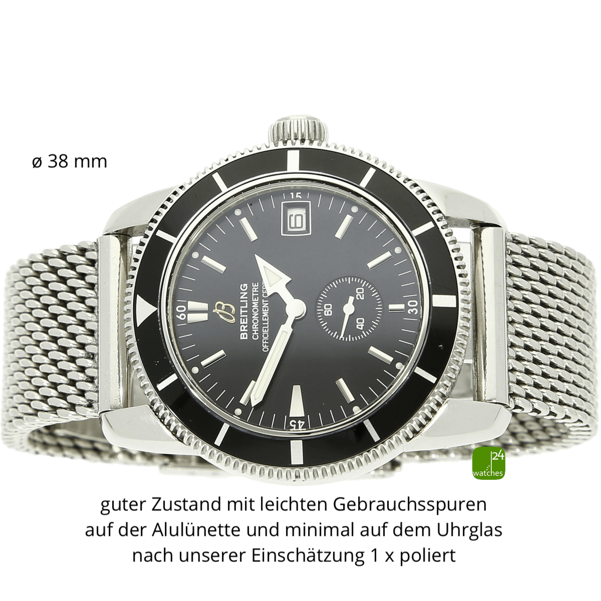 Edelstahl | Gehäusedurchmesser ohne Krone gemessen 38 mm | mit Krone 41 mm | von Bandanstoss zu Bandanstoss 44,5 mm | Gehäusehöhe 12 mm | geschraubter massiver Gehäuseboden mit Hersteller Gravuren | orig Breitling Saphirglas mit minimalster Nutzungsspur im Rand bei 2 Uhr | 60 fach rastende, einseitig drehbare Lünette | Lünetteneinlage mit leichten Kratzern | orig Breitling Krone verschraubt | Bandanstoss 20 mm | lt Hersteller 200 m wasserdicht - aktuell getestet mit + 100 m | Gesamtgewicht 117,55 Gramm