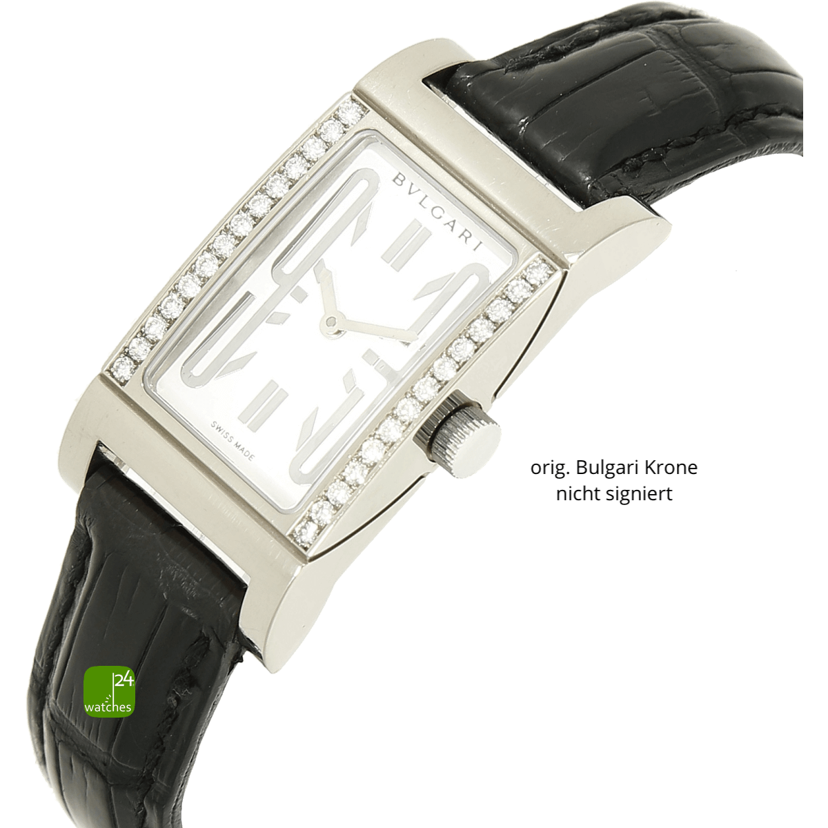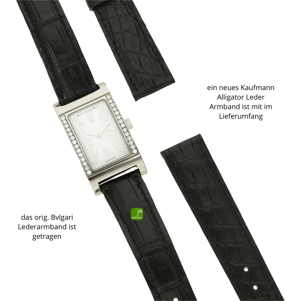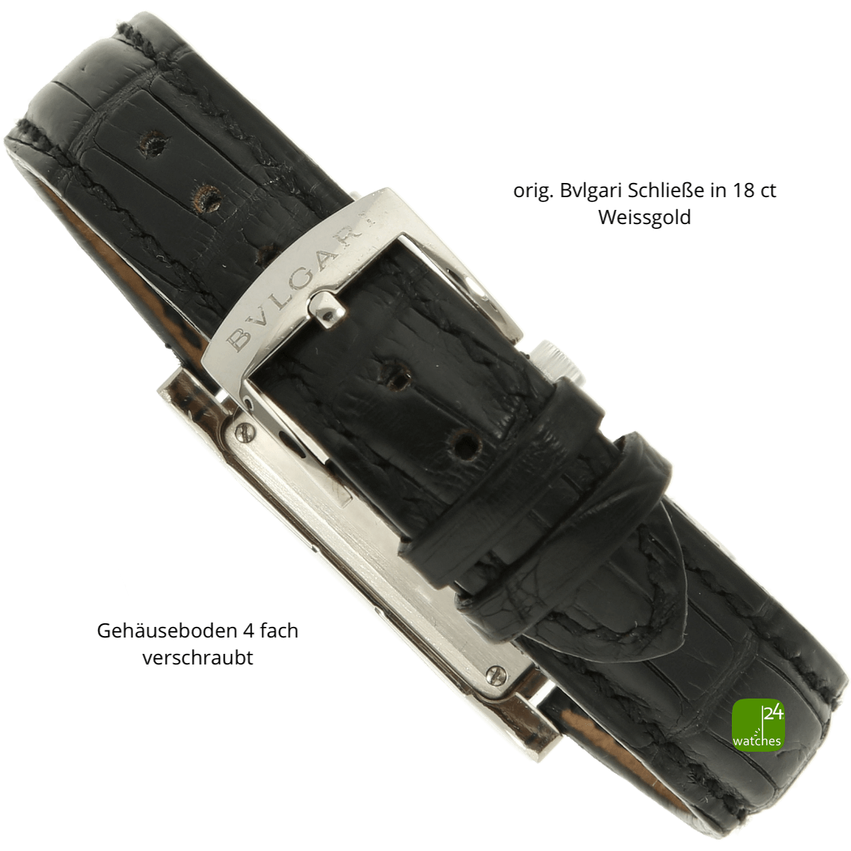 Original Bulgari Alligator Lederarmband - getragen | neues Alligatorarmband sec. im Lieferumfang | orig. Bulgari Dornschließe in 18kt Weißgold | Gesamtlänge Uhrgehäuse und Armband ca 18.5 cm