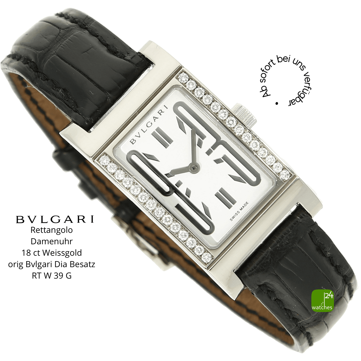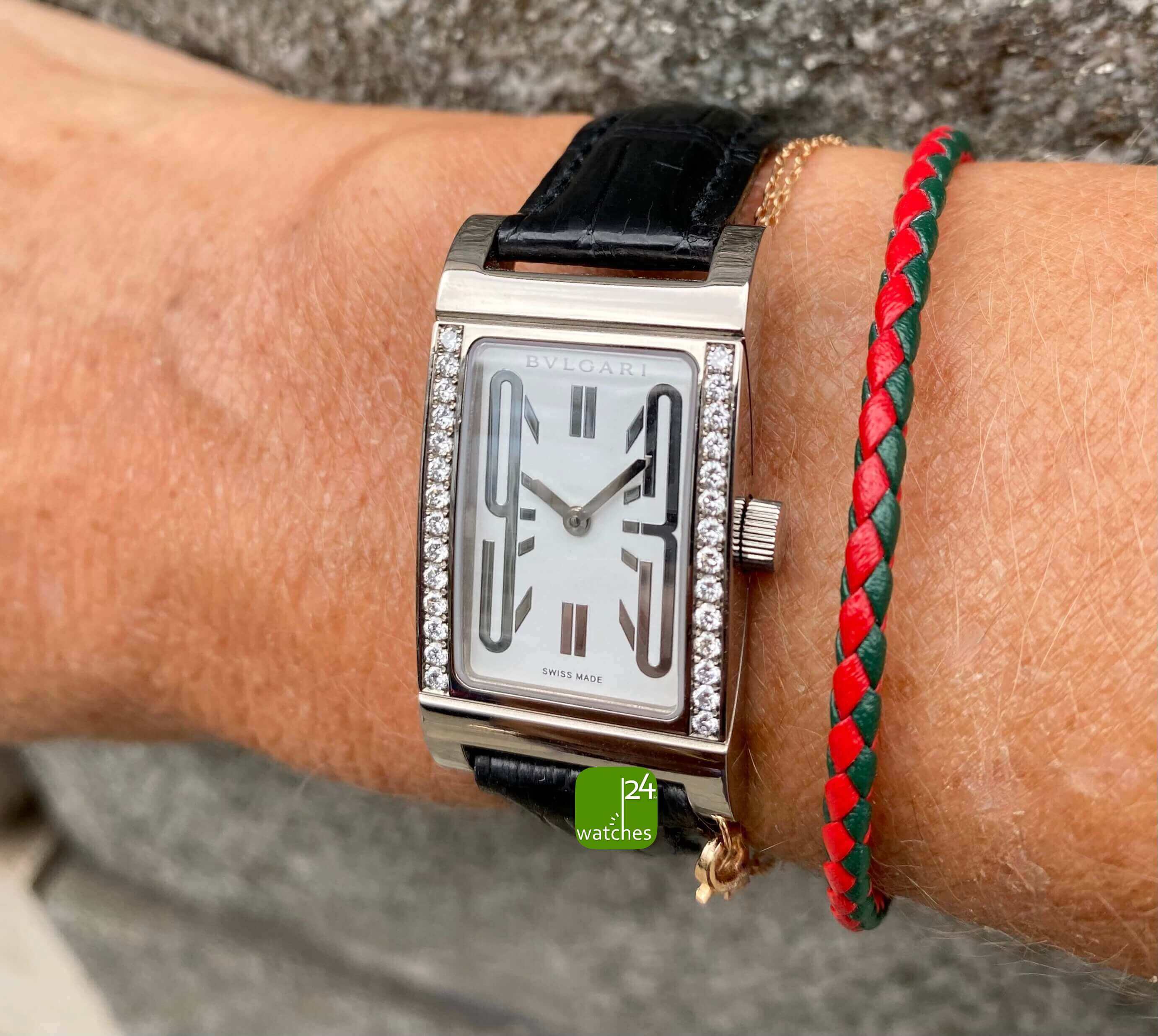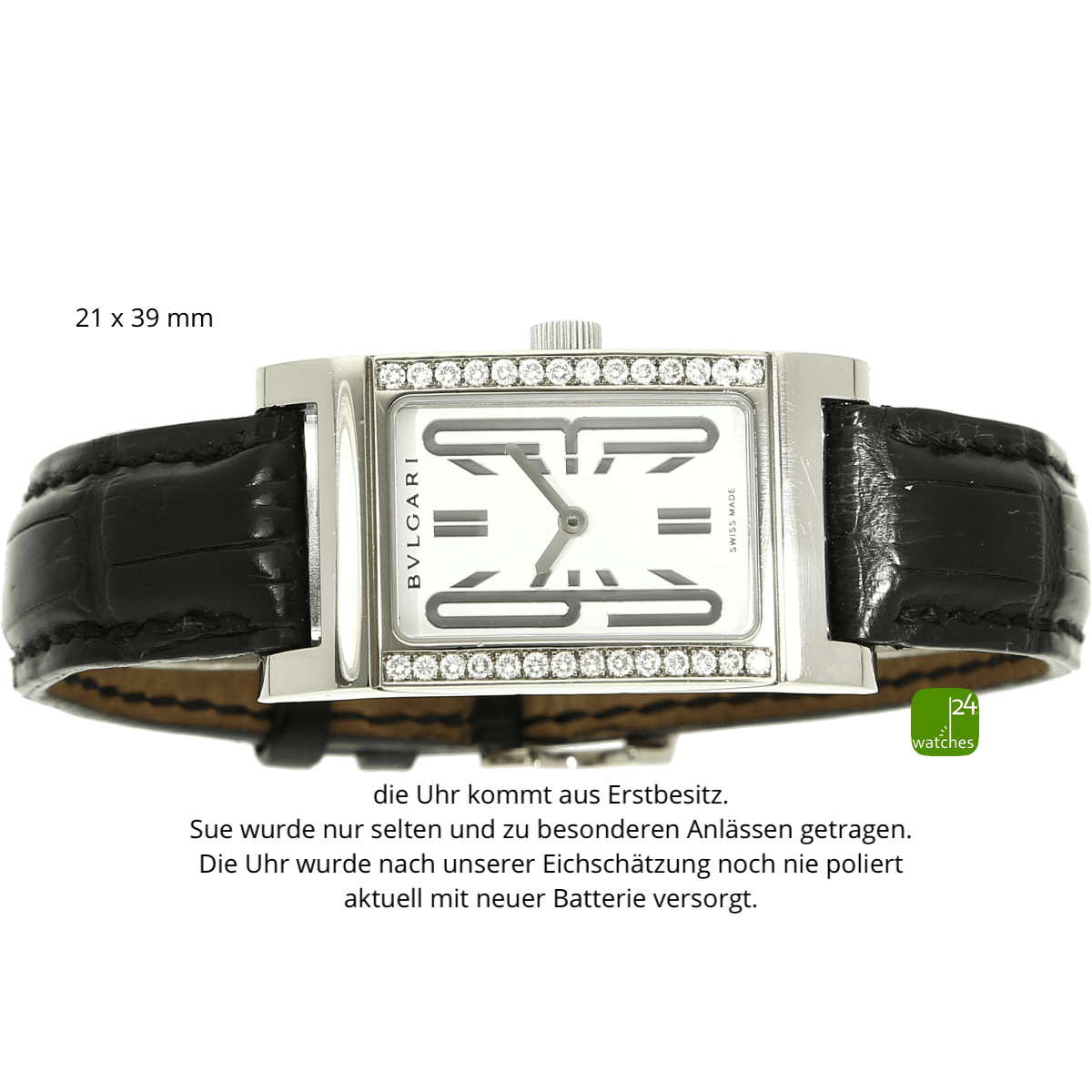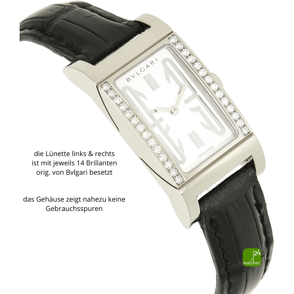 Original Bulgari Alligator Lederarmband - getragen | neues Alligatorarmband sec. im Lieferumfang | orig. Bulgari Dornschließe in 18kt Weißgold | Gesamtlänge Uhrgehäuse und Armband ca 18.5 cm