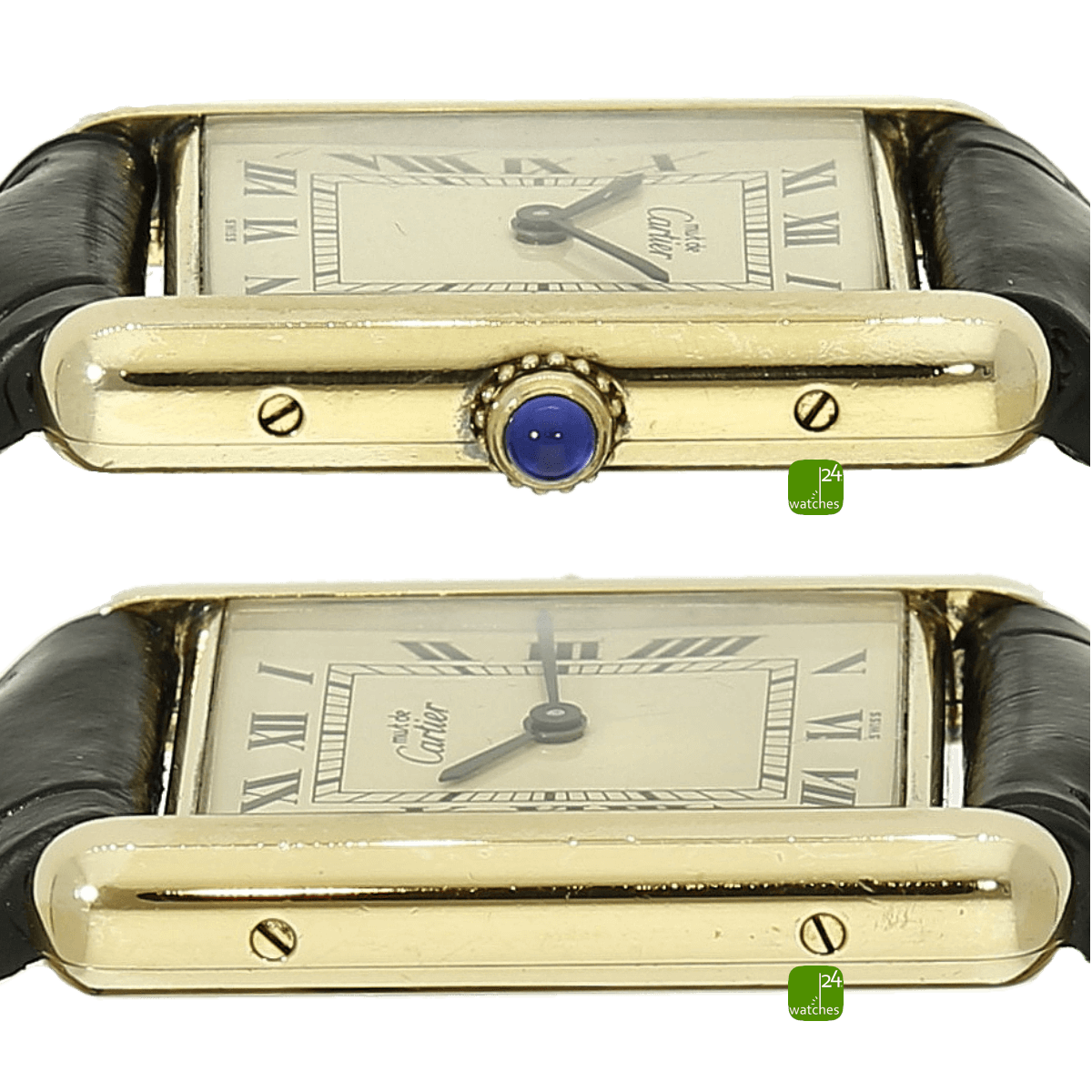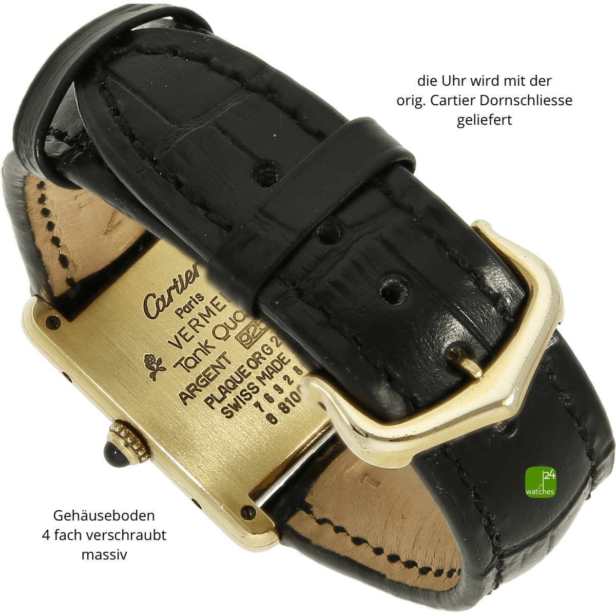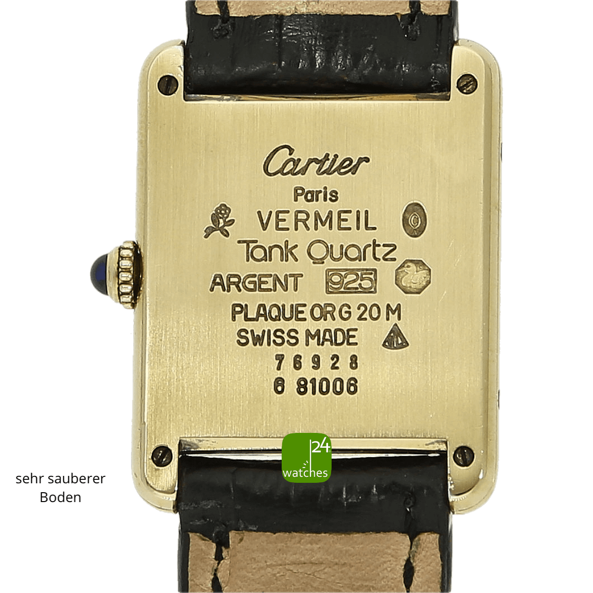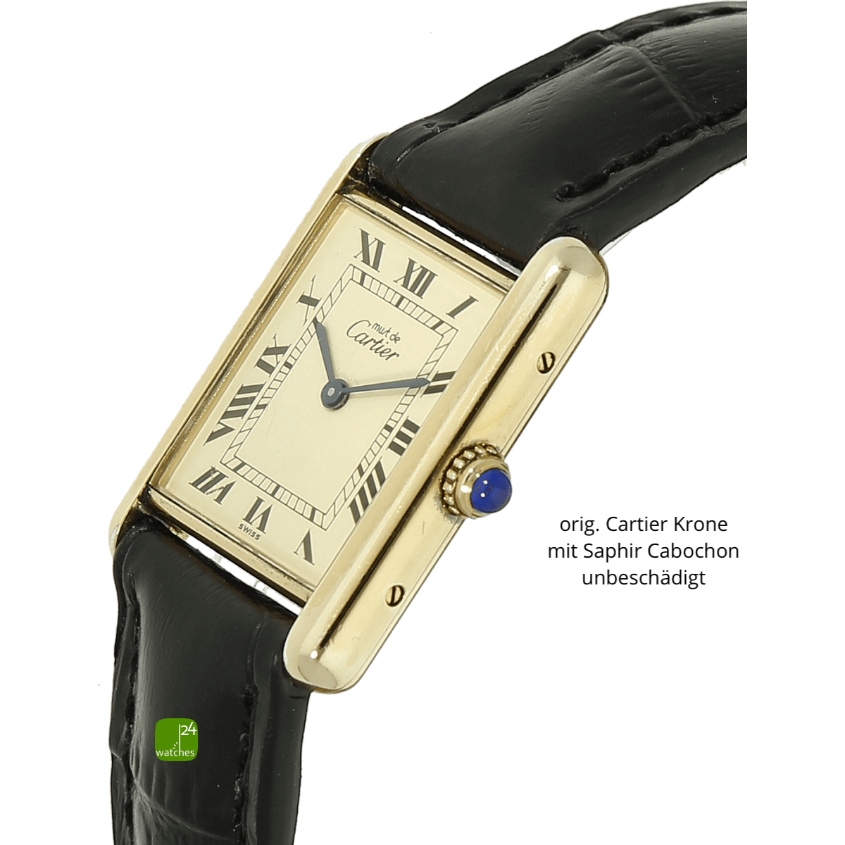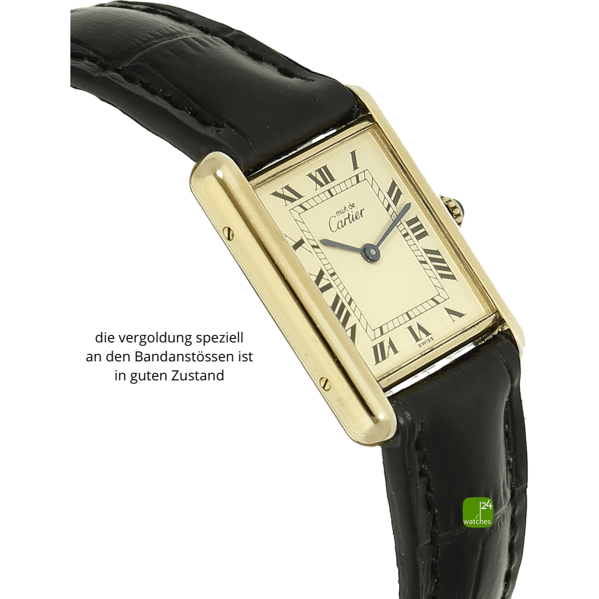 silber 20 micron vergoldet | Gesamtlänge incl Bandanstoss 31 mm | Breite ohne Krone gemessen 23 mm mit Krone 26 | Höhe 5 mm | 4 fach verschraubter massiver Gehäuseboden mit Hersteller Gravuren | Mineralglas ohne Beschädigungen | orig Cartier Krone mit synth. Saphircabouchon | Bandanstoss 17 mm | lt Hersteller wasserdicht bis 30 m | Gesamtgewicht 26,31 Gramm