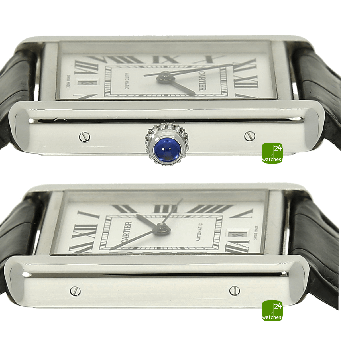 Edelstahl | Gehäuselänge 41 mm | Gehäusebreite ohne Krone gemessen 31 mm | mit Krone 35 mm | Gehäusehöhe 7,5 mm | massiver 8 fach geschraubter Gehäuse mit Hersteller Gravuren | Saphirglas ohne Nutzungsspuren | orig Cartier Krone mit synth Saphir Cabouchon | Bandanstoss 23 mm | lt Hersteller wassergeschützt | Gesamtgewicht 59,60 mm