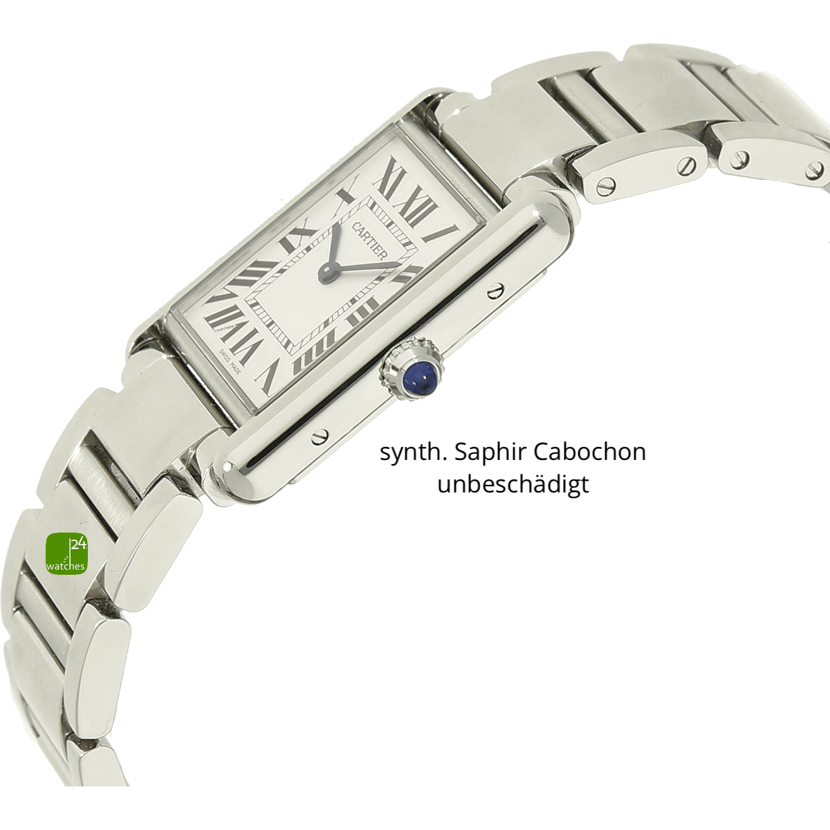 Edelstahl | Breite ohne Krone gemessen 25 mm | mit Krone 29.5 mm |Gesamtlänge 33 mm | Höhe 6 mm | massiver Gehäuseboden 4 fach verschraubt in Edelstahl mit Hersteller Gravuren | Saphirglas ohne Beschädigung | orig Cartier Krone mit Spindel Saphir Cabouchon ohne Beschädigung | Bandanstoss 19 mm | lt Hersteller 30 m wasserdicht | Gesamtgewicht 107,22 Gramm