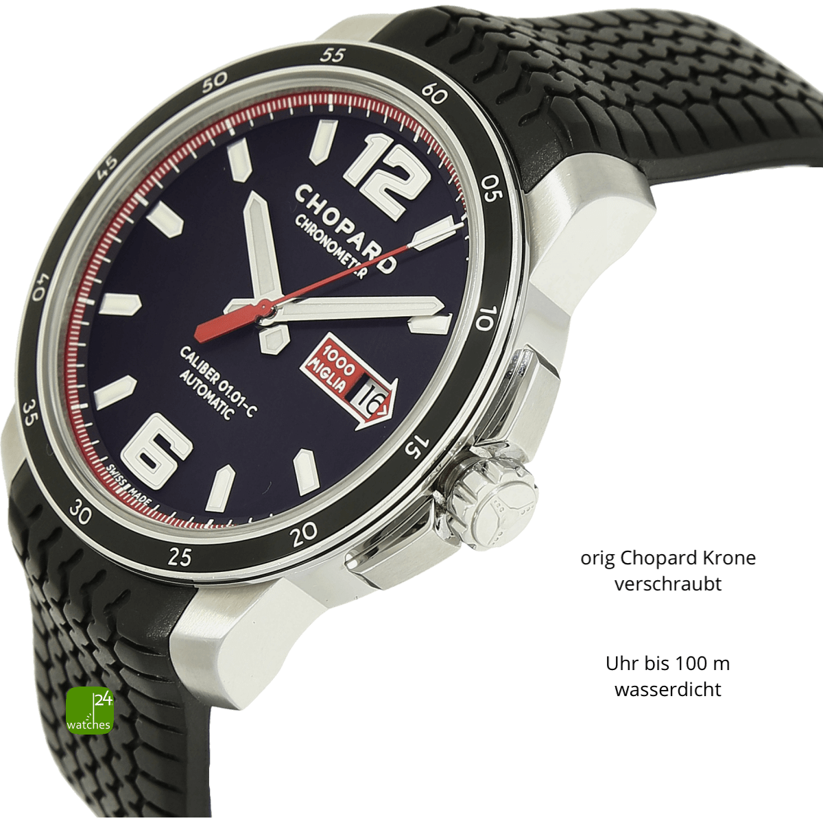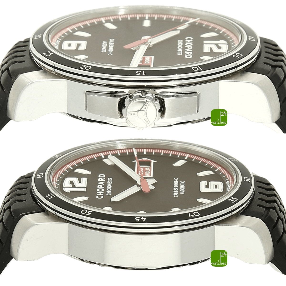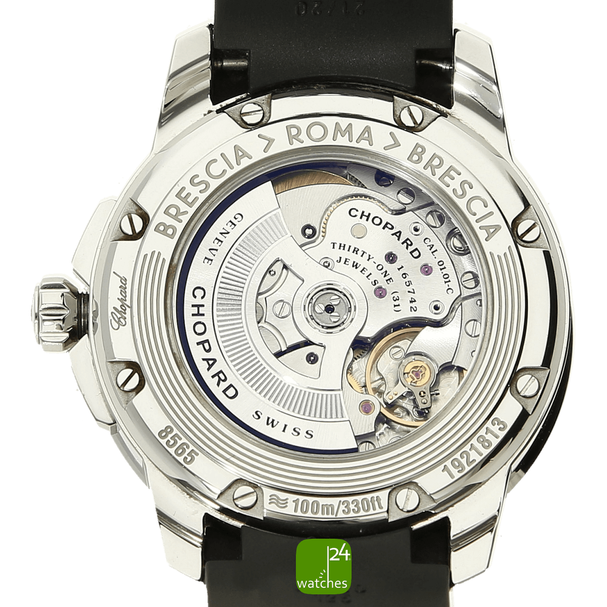 Edelstahl poliert & gebürstet | Gehäusedurchmesser ohne Krone 43 mm - mit Krone 47 mm | von Bandanstoss zu Bandanstoss 59 mm | Gehäusehöhe 11,5 mm | 8 fach verschraubter Gehäuse - Sicht- Boden mit Hersteller Gravuren | Saphirglas entspiegelt unbeschädigt | orig Chopard Krone verschraubt aktuell | Lünette mit schwarzer Alu Einlage | Bandanstoss 211 mm | lt Hersteller 100 m wasserdicht | Gesamtgesicht 118,85 Gramm