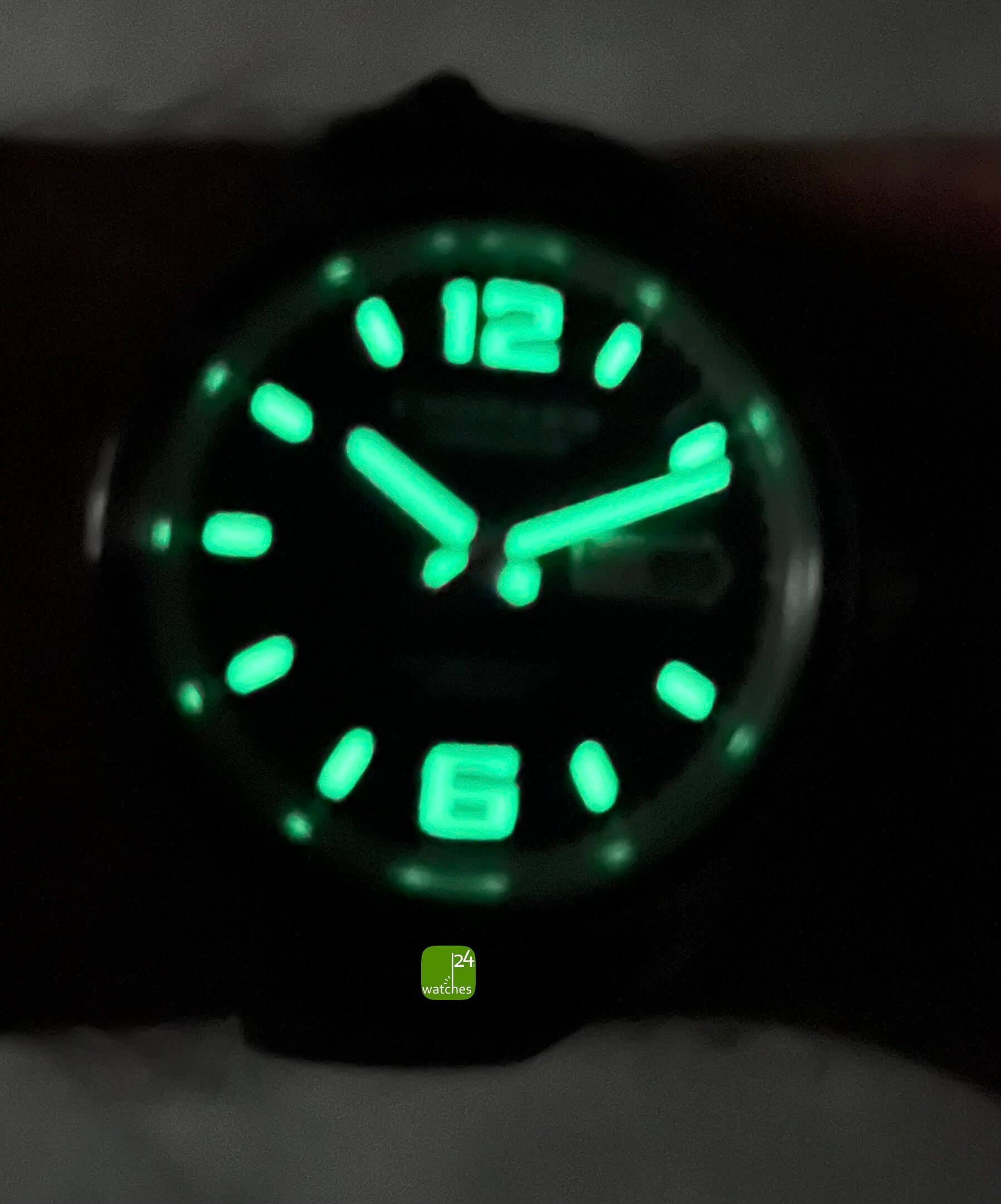 schwarz | aufgesetzte Stunden Keil Indices aus Edelstahl mit Leuchtmasse befüllt | arabische 12 und 6 aufgesetzt und mit Leuchtmasse befüllt | weiss gedruckte Minuterie | digitales Datumsanzeige bei drei Uhr | in der Rehaut 60ziger Unterteilung | polierte Edelstahl Keil Zeiger mit Leuchtmasse befüllt | das Zifferblatt verfügt über eine sehr hohe Leuchtkraft