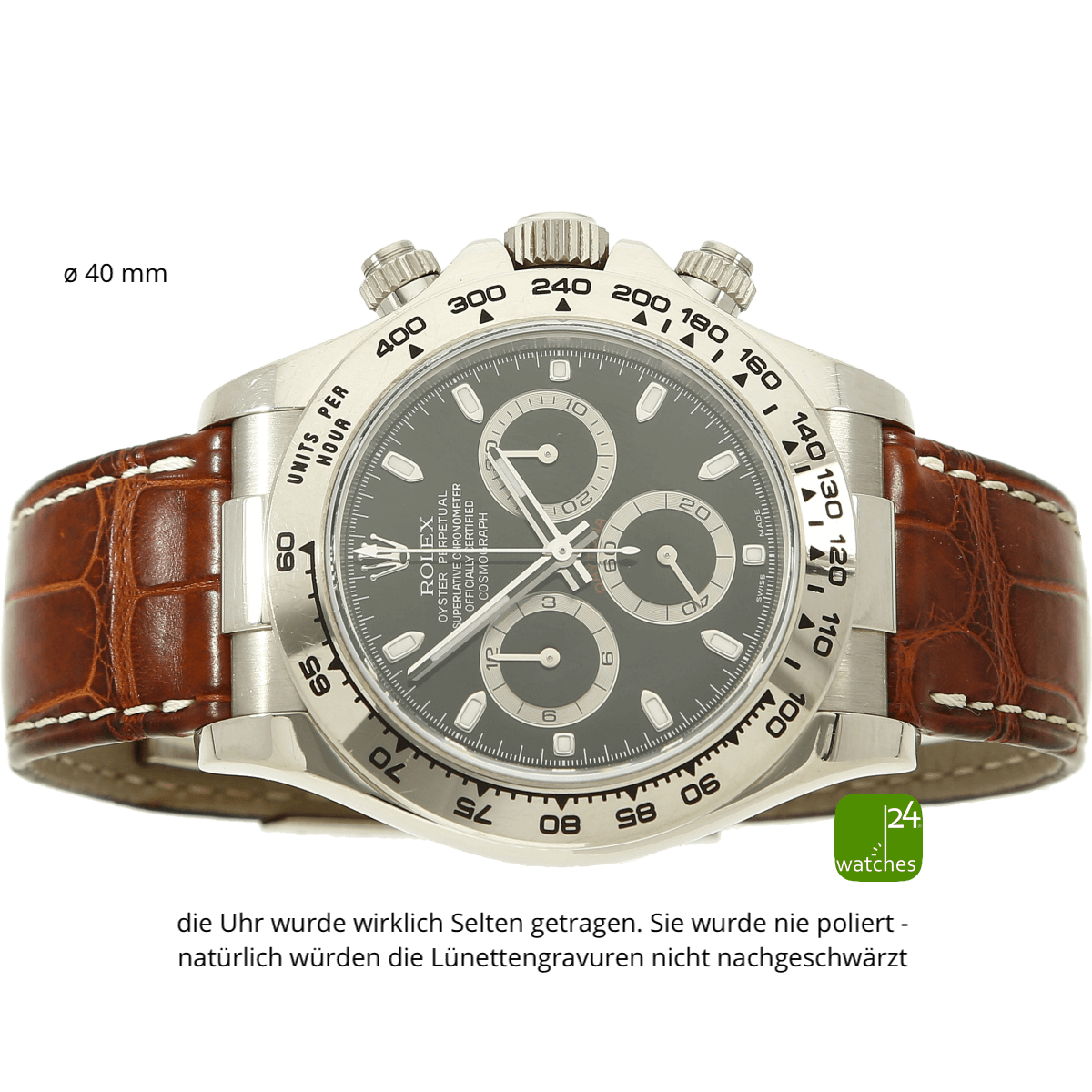 18 ct / 0,750 Weissgold poliert | Gehäusedurchmesser ohne Krone gemessen 40 mm - mit Krone 42,5 mm | von Bandanstoss zu Bandanstoss 46,5 mm | Gehäusehöhe 12 mm | massiver geschraubter Gehäuseboden | Saphirglas entspiegelt und unbeschädigt | orig Rolex Krone & Drücker verschraubt | Weissgold Lünette mit Tachymeter Anzeigen graviert silber | Bandanstoss 20 mm | lt Hersteller 100 m wasserdicht | Gesamtgewicht 131,09 Gramm
