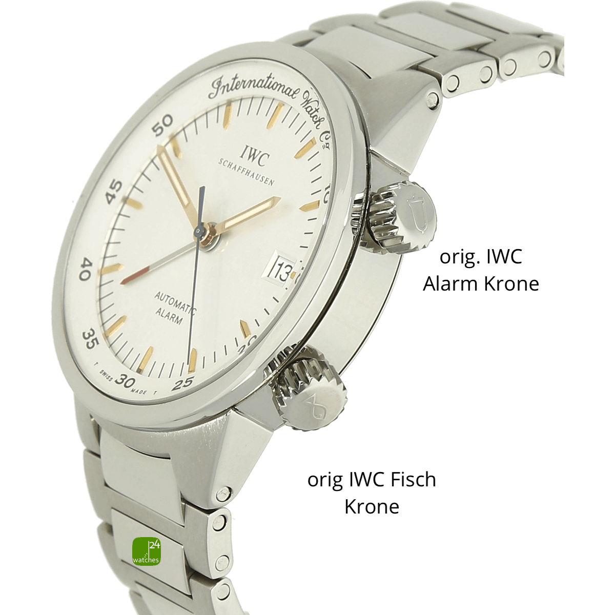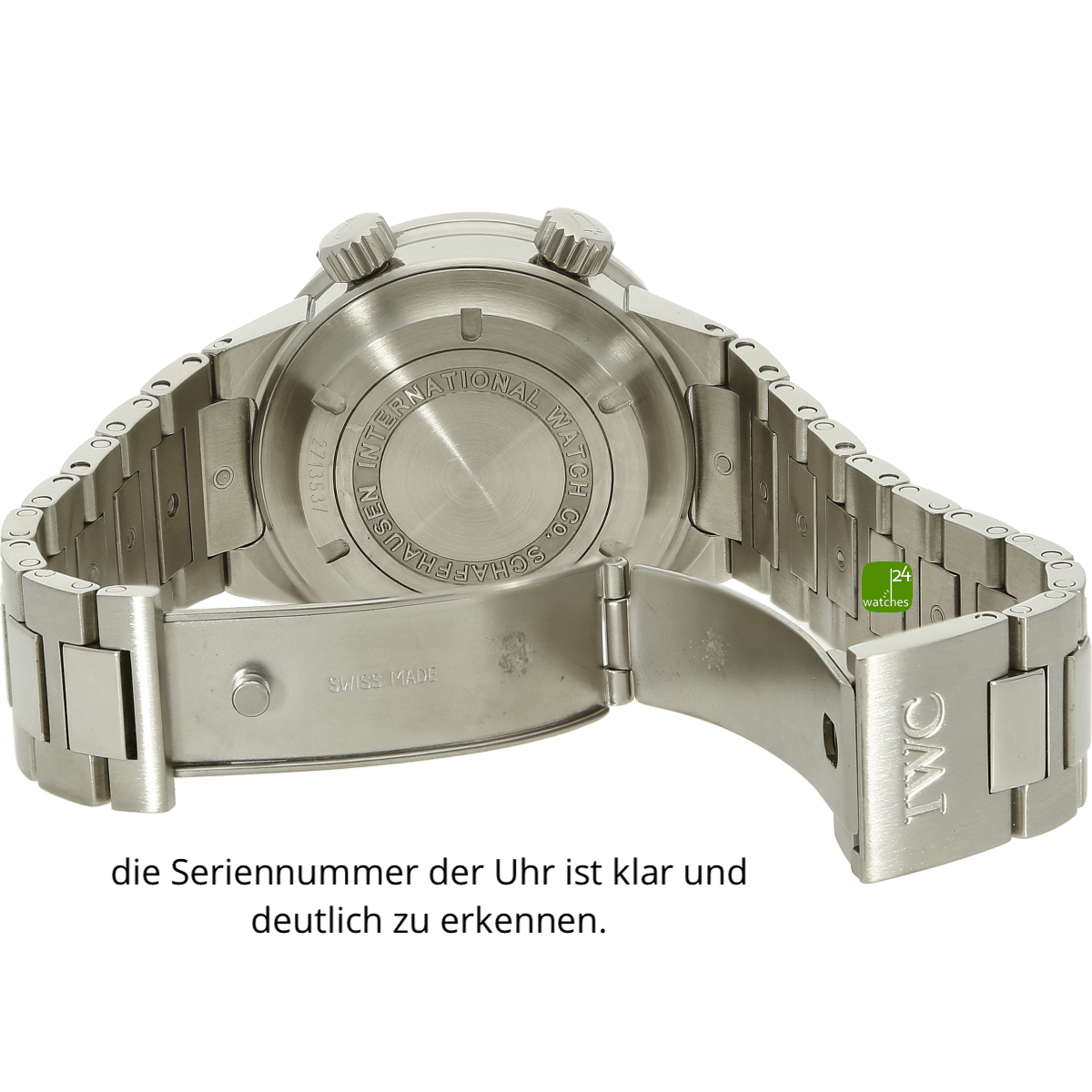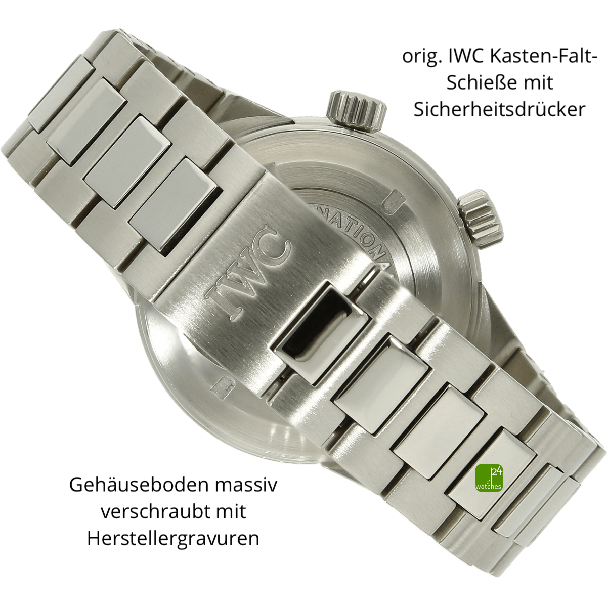 Edelstahl gebürstet & poliert | Gehäusedurchmesser ohne Krone 40 mm - mit Krone 43,5 mm | von Bandanstoss zu Bandanstoss 45,5 mm | Gehäusehöhe 13,2 mm | massiver verschraubter Gehäuse Boden mit Hersteller Gravuren | Saphirglas entspiegelt unbeschädigt | orig IWC Fisch Krone verschraubt bei 4 Uhr | bei 2 Uhr Alarmkrone | lt Hersteller 100 m wasserdicht | aktuell geprüft auf 5 bar | Bandanstoss 22 mm | Gesamtgewicht 142,10 Gramm
