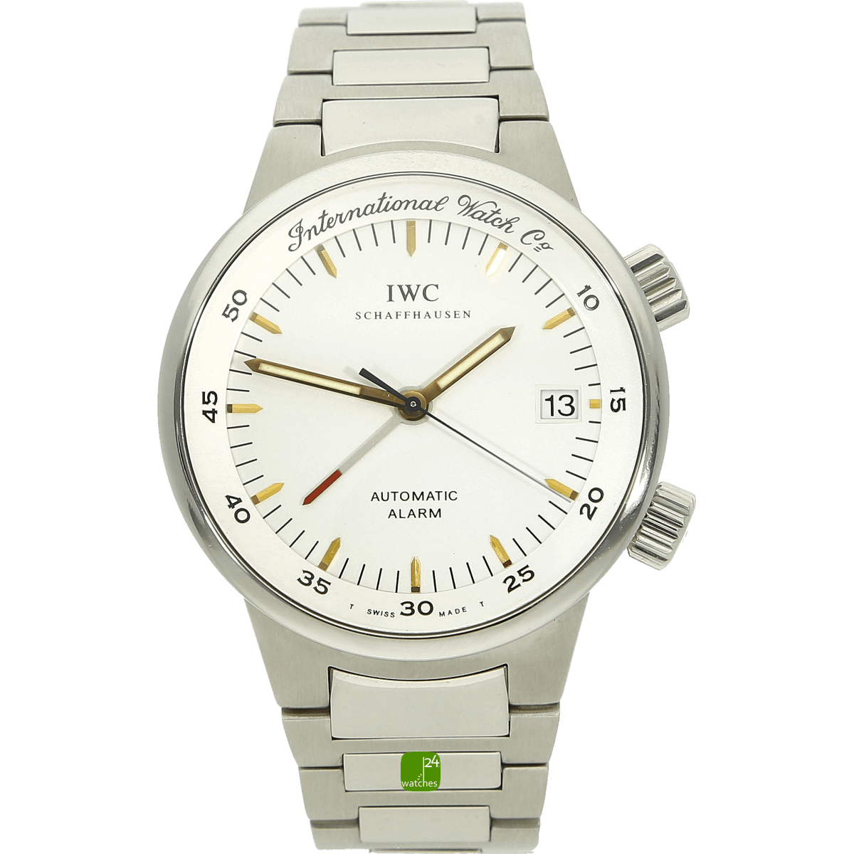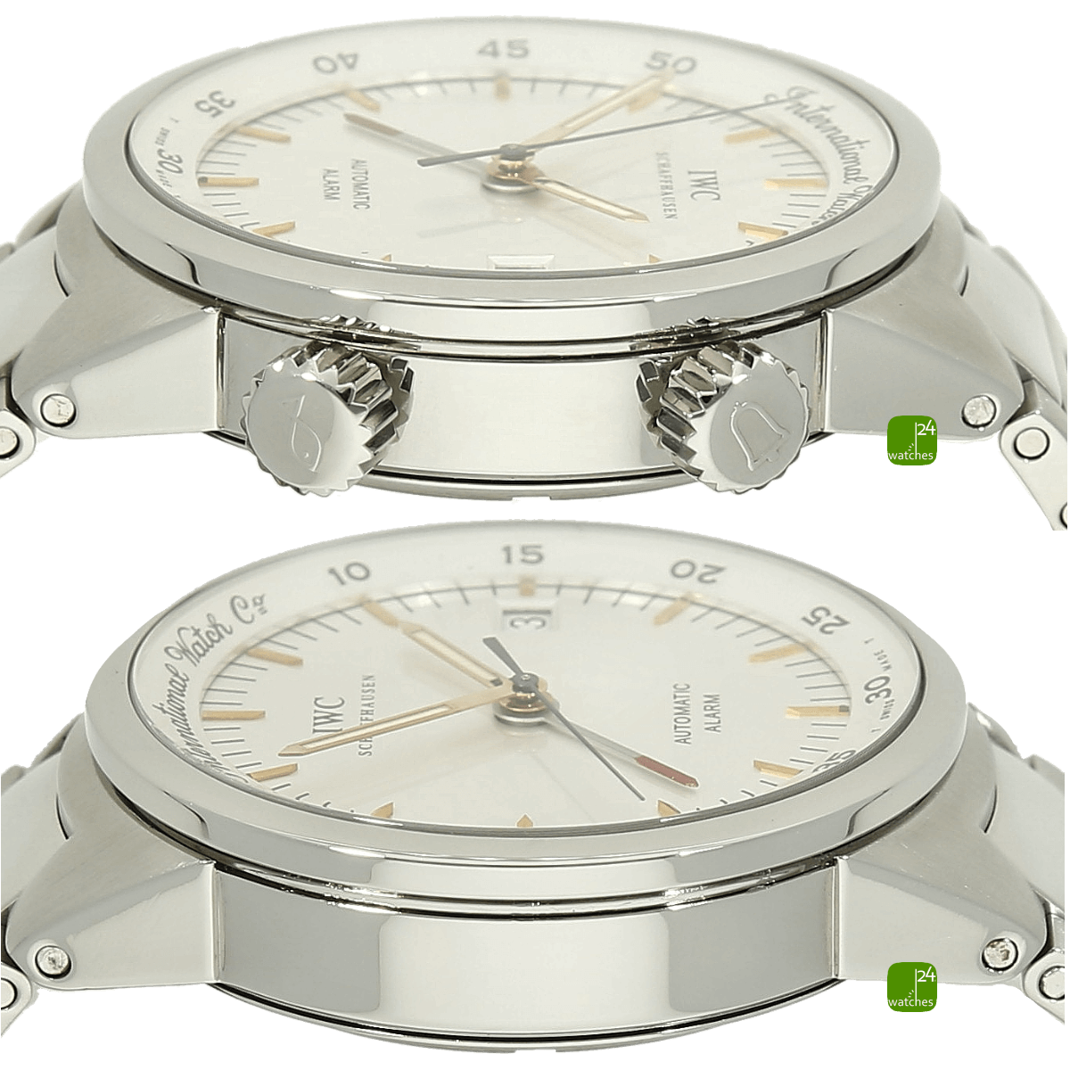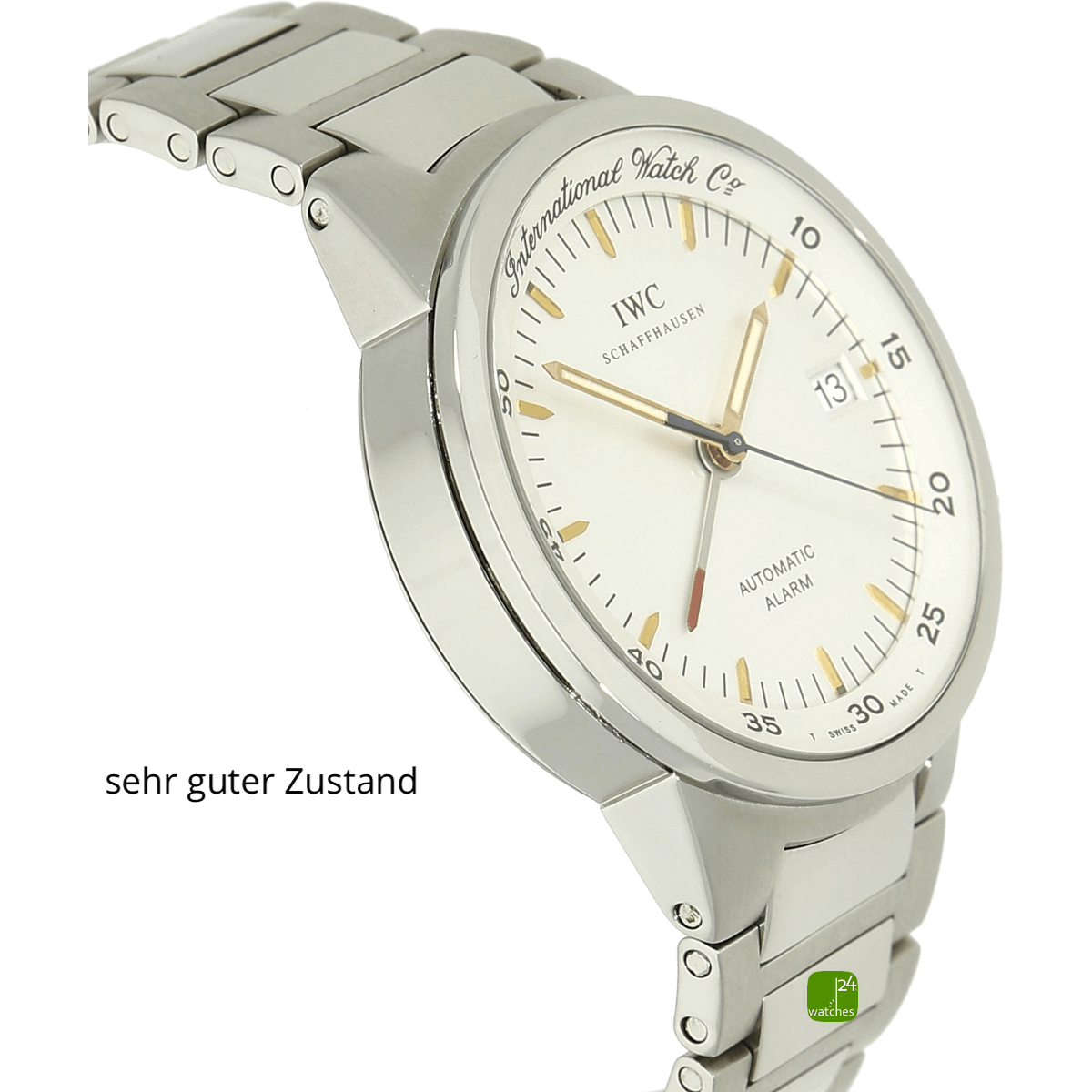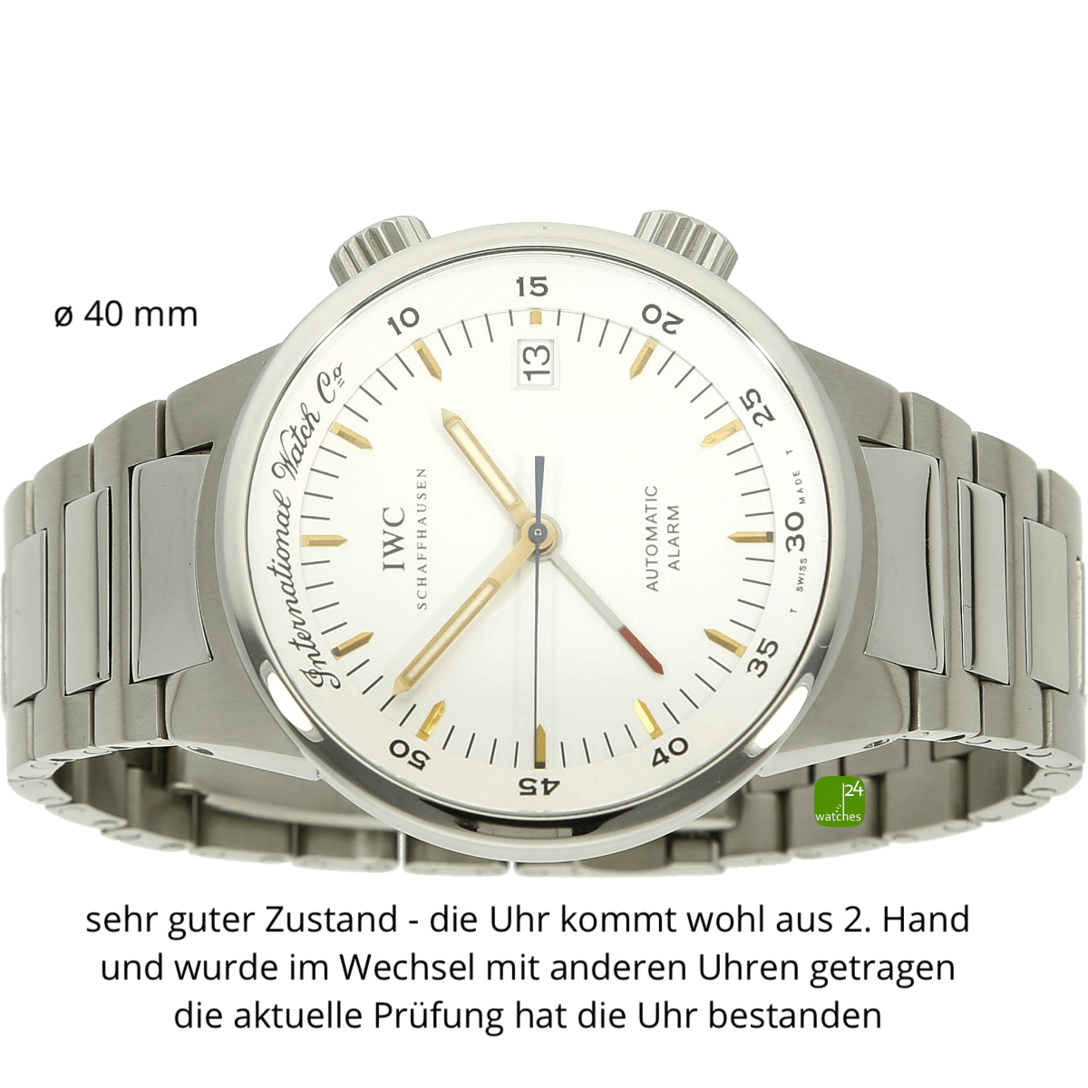 Edelstahl gebürstet & poliert | Gehäusedurchmesser ohne Krone 40 mm - mit Krone 43,5 mm | von Bandanstoss zu Bandanstoss 45,5 mm | Gehäusehöhe 13,2 mm | massiver verschraubter Gehäuse Boden mit Hersteller Gravuren | Saphirglas entspiegelt unbeschädigt | orig IWC Fisch Krone verschraubt bei 4 Uhr | bei 2 Uhr Alarmkrone | lt Hersteller 100 m wasserdicht | aktuell geprüft auf 5 bar | Bandanstoss 22 mm | Gesamtgewicht 142,10 Gramm