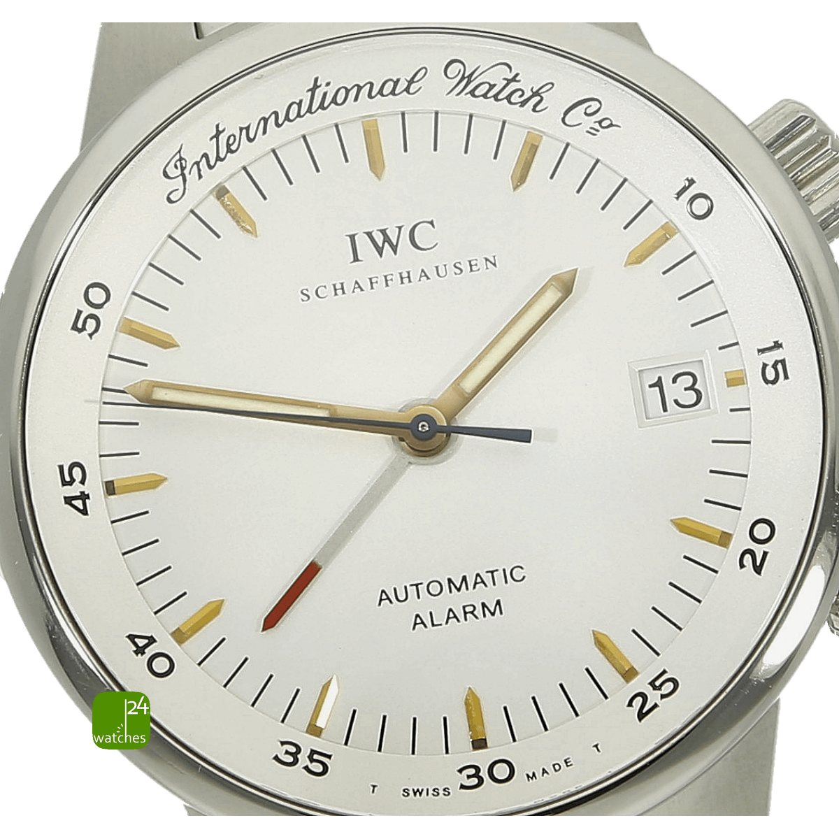 rein weiss | aufgesetzte Stunden Stab Indices in Goldfarben |schwarz gedruckte Minuterie | in der Rehaut (zwischen Glas und Zifferblatt) Schriftzug International Watch Co. und Einteilung 10 - 50 | digitales Monatsdatum bei drei Uhr | Schwertzeiger mit Leuchtmasse befüllt | 4. Zeiger mit roter Spitze zur Anzeige der Alarmzeit