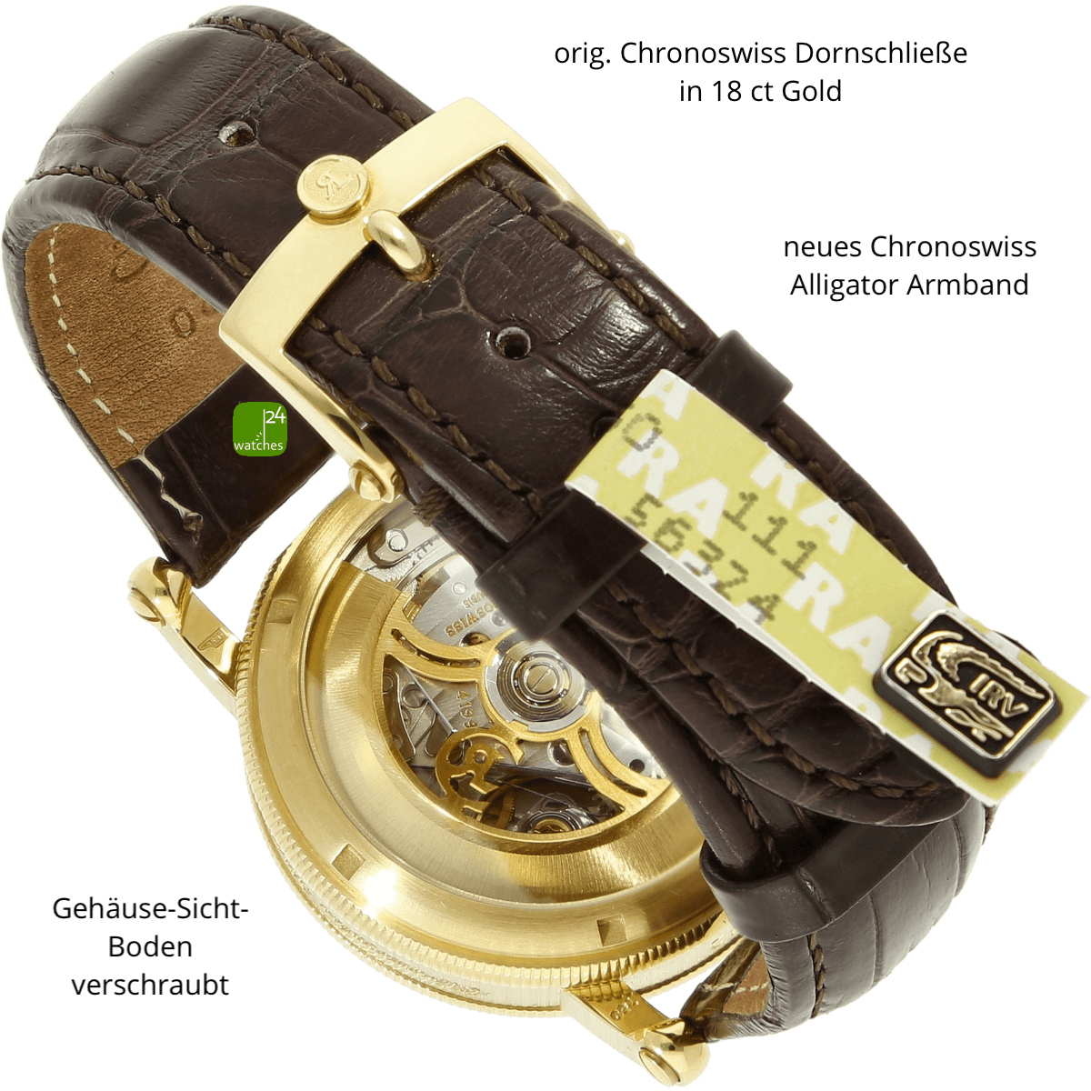 18 ct/0,750 Gelbgold | Gehäusedurchmesser ohne Krone 38 mm - mit Krone 43 | von Lug to Lug 47,5 mm | Gehäusehöhe 13 mm | Gehäuse Sicht Boden geschraubt | Saphirglas entspiegelt und unbeschädigt | orig Chronoswiss Zwiebelkrone in Gold (und Drücker) | Gold kannelierte Lünette | Bandbefestigungsschraubenköpfe in Gold | Bandanstoss 20 mm | lt Hersteller wassergeschützt mit 30 m | Gesamtgewicht 105,75 Gramm |