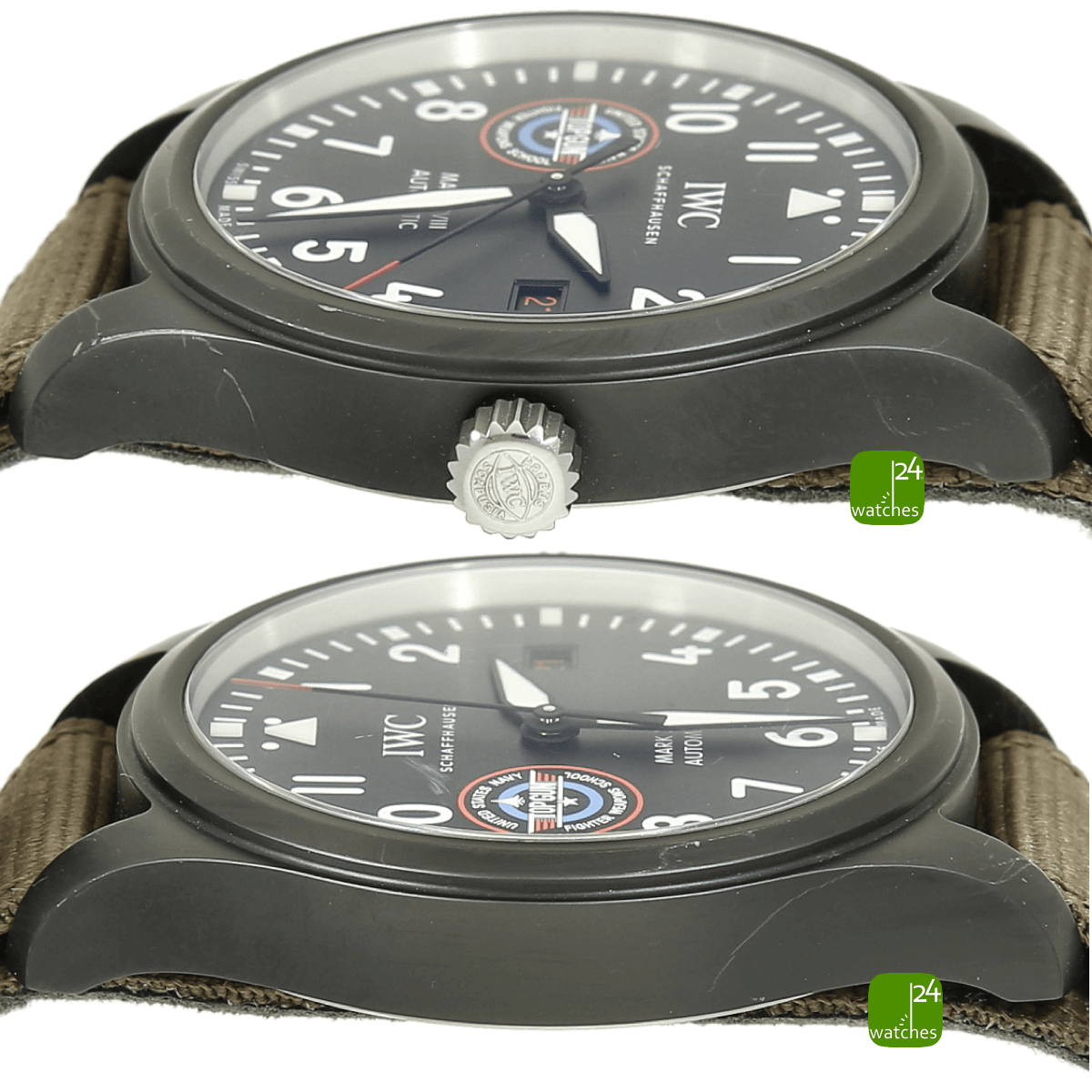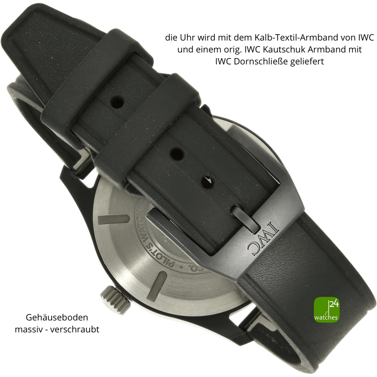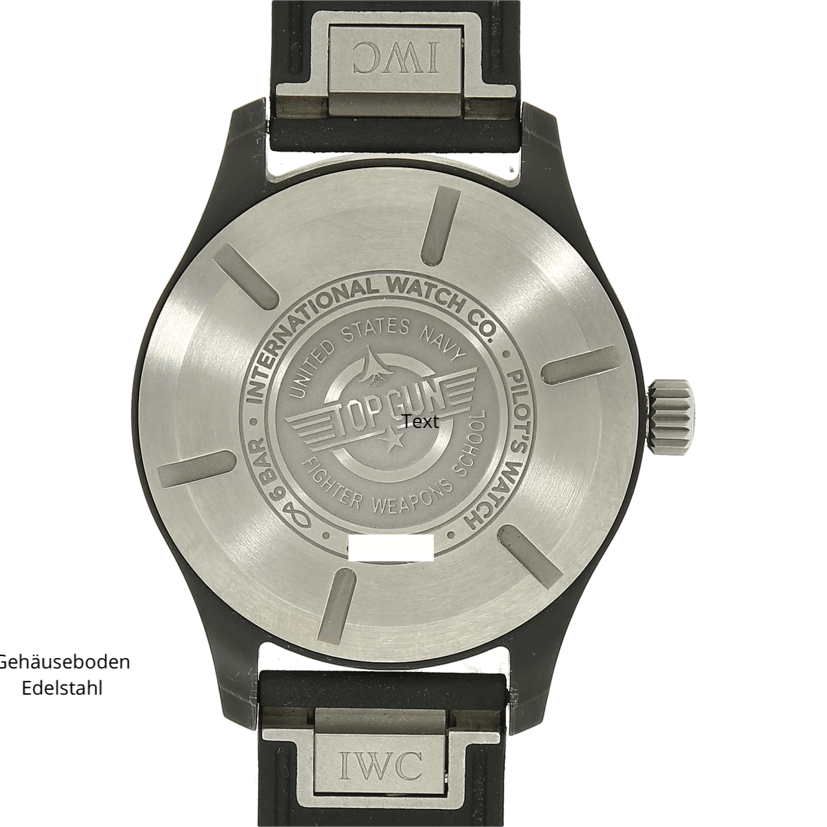 Keramik| Gehäusedurchmesser ohne Krone gemessen 41 mm | mit Krone 44,5 mm | von Bandanstoss zu Bandanstoss 50,5 mm | Gehäusehöhe 11 mm | geschraubter massiver Gehäuseboden mit Herstellergravuren und TOP GUN Logo| Saphirglas mit Nutzungsspur bei 10 Uhr entspiegelt| geschraubte IWC Krone | Bandanstoss 20 mm | lt Hersteller 60 m wasserdicht | Gesamtgewicht 89,06 Gramm