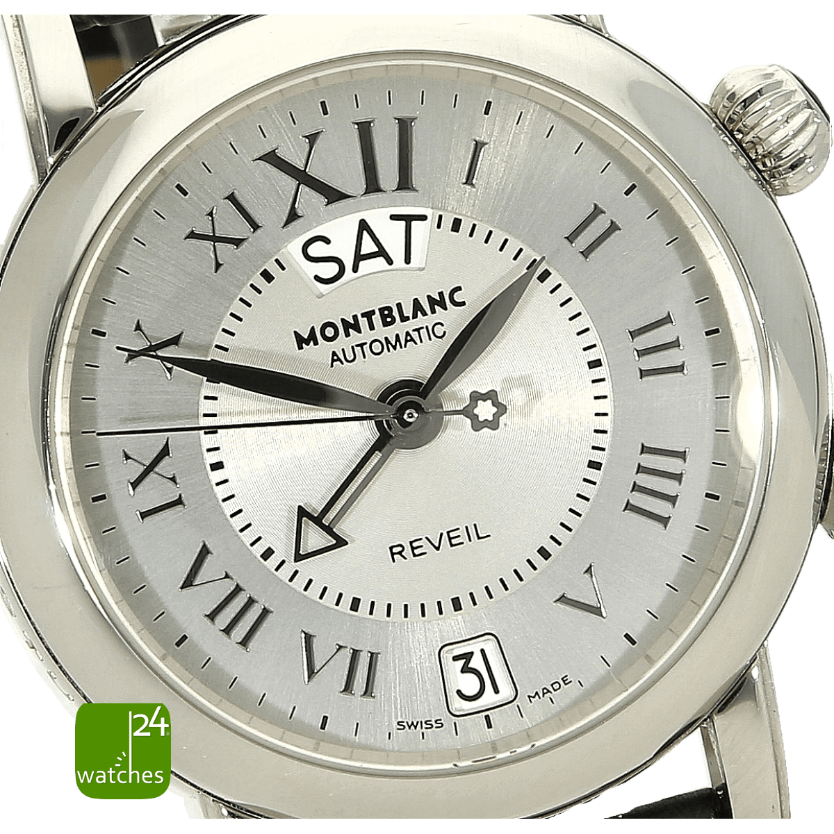 silber guilochiert | aufgesetzte Stundenindexe römisch | schwarz gedruckte Minuterie | bei 12 Uhr Wochentagsanzeige | bei sechs Uhr digitales Datum 1 - 31 | Weckfunktion über den 4. Zeiger mit dem roten kleinen Dreieck