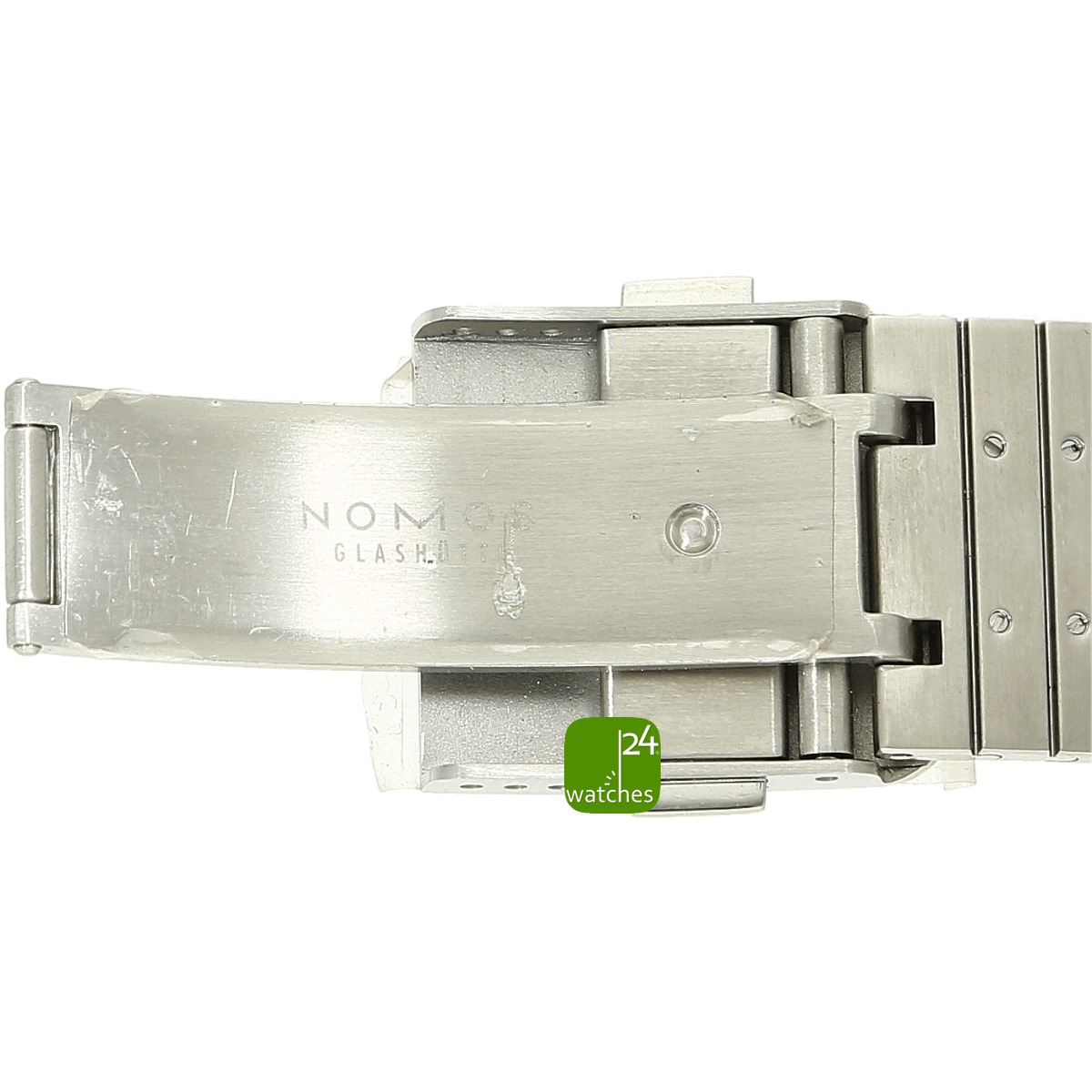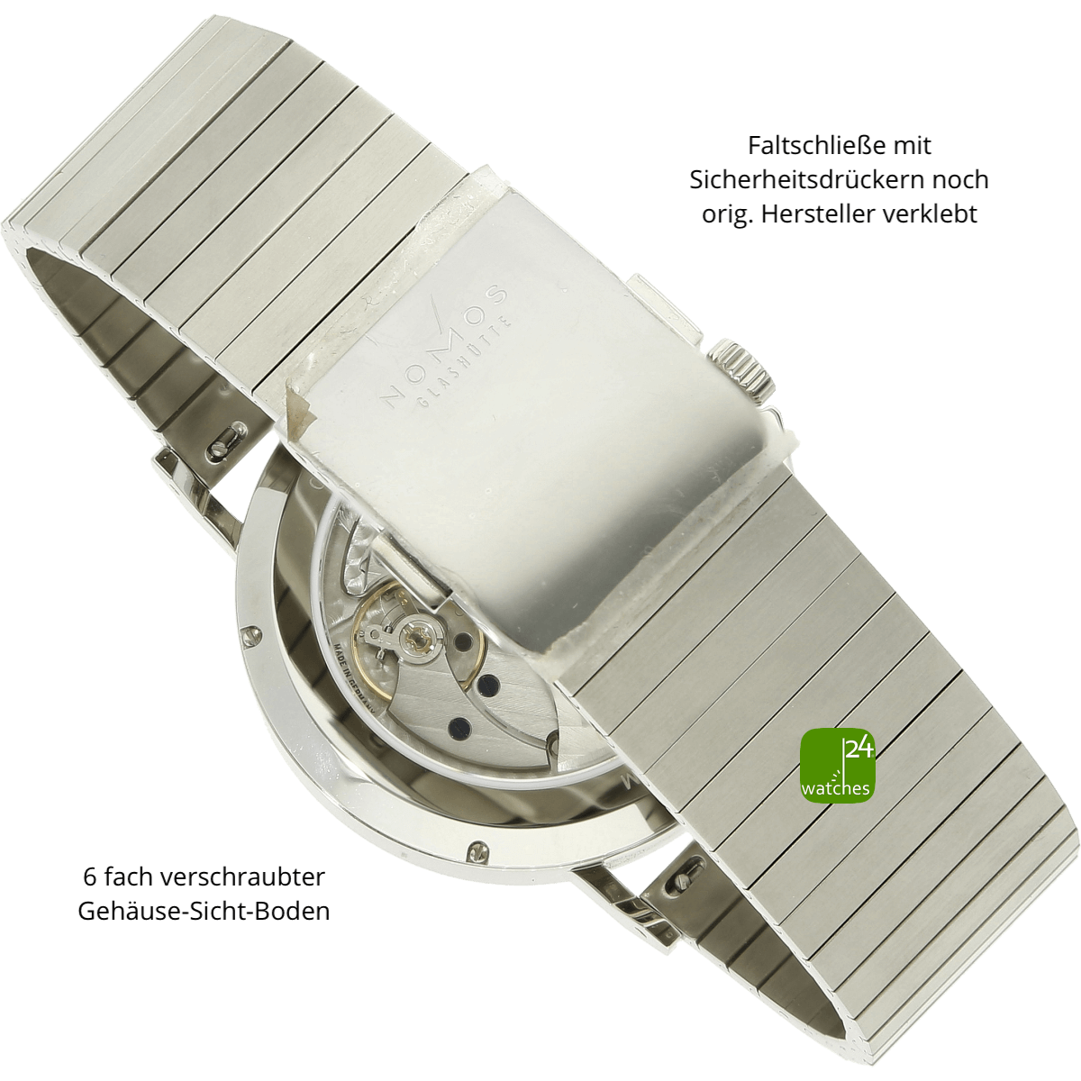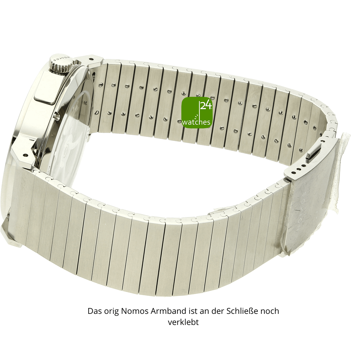 Original Nomos Edelstahl Armband quer gebürstet | Nomos Faltschließe noch verklebt | Gesamtlänge Armband und Uhrgehäuse ca 19,5 cm | Das Armband hat einen sehr hohen Tragekompfort.