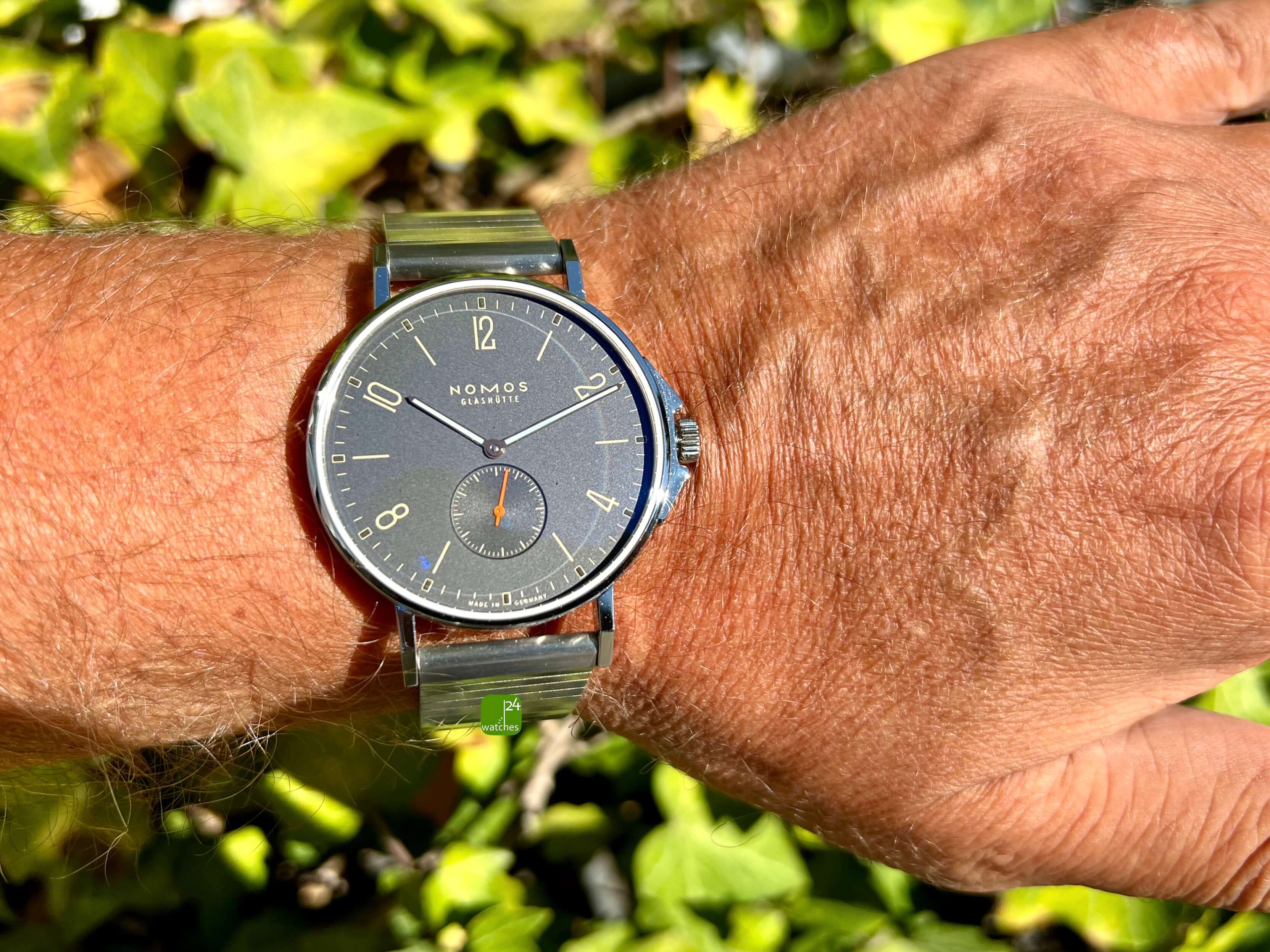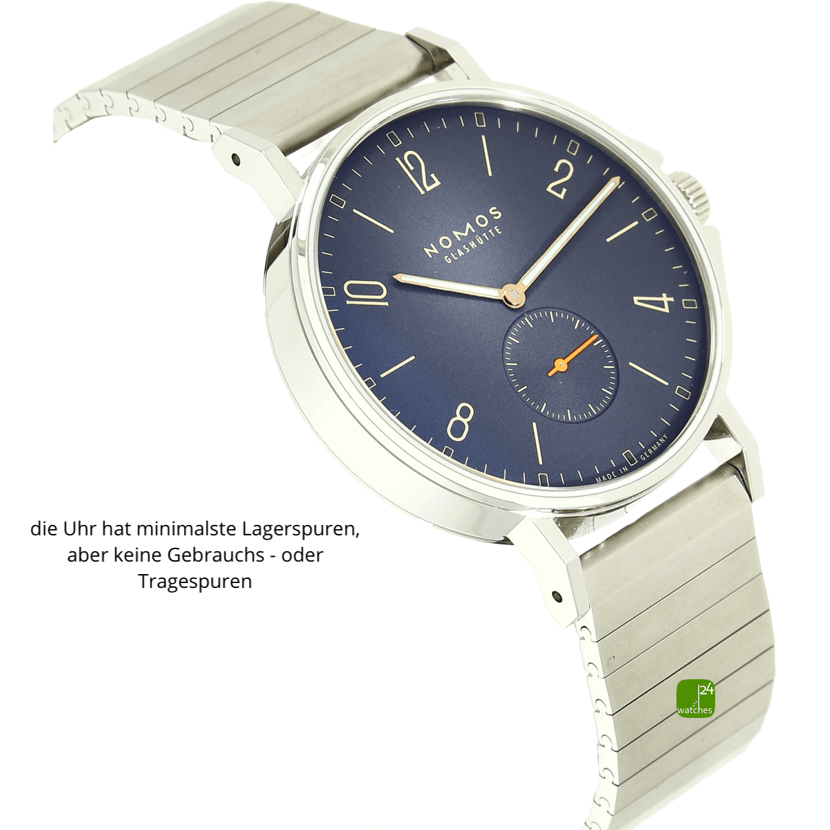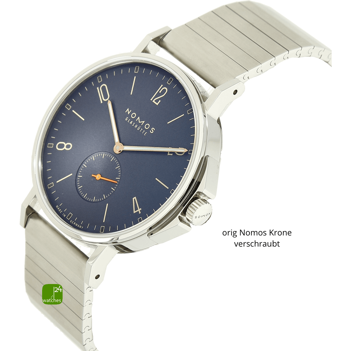 Original Nomos Edelstahl Armband quer gebürstet | Nomos Faltschließe noch verklebt | Gesamtlänge Armband und Uhrgehäuse ca 19,5 cm | Das Armband hat einen sehr hohen Tragekompfort.