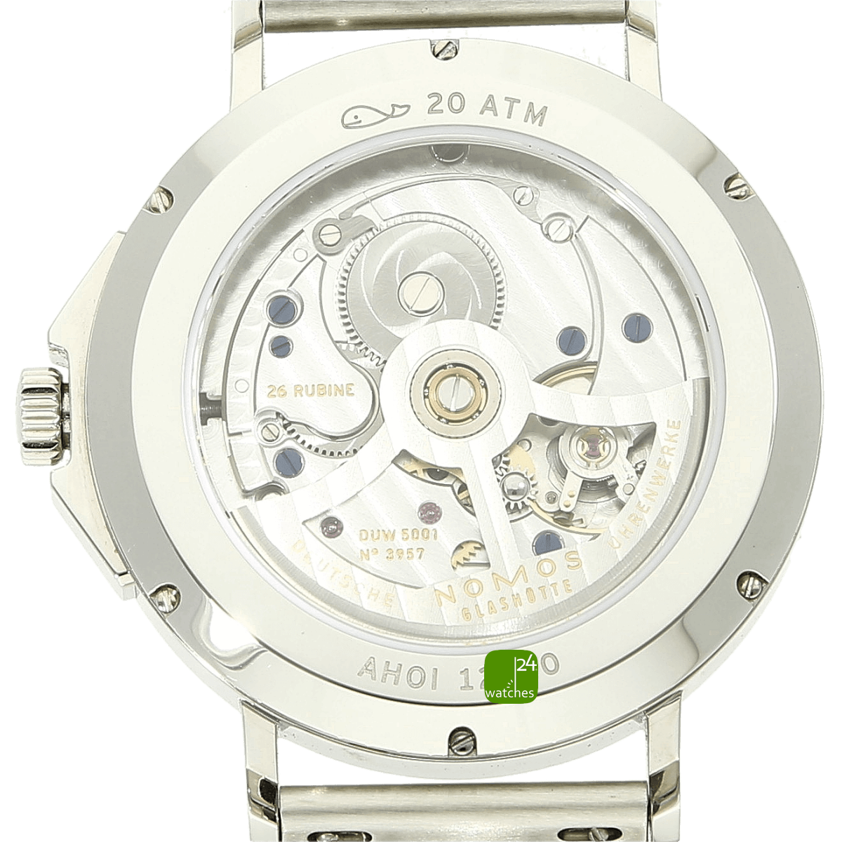 automatisch | Nomos Cal DUW 5001 | 21.600 A/h | | 26 Lagersteine, | 43 Stunden Gangreserve | Anzeige von Stunden, Minuten, dezentralen Sekunden |