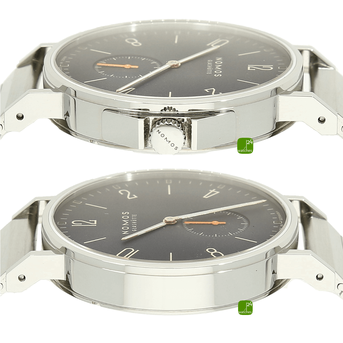 Edelstahl poliert | Gehäusedurchmesser 40 mm ohne Krone gemessen | mit Krone 44 mm | von Bandanstoss zu Bandanstoss 50 mm | Gehäusehöhe 9,6 mm | Gehäuse-Sicht-Boden 6 fach verschraubt mit Saphirglas und Hersteller Gravuren | Saphirglas unbeschädigt | orig. Nomos Krone verschraubt - mit Flankenschutz | Bandanstoss 20 mm | lt Hersteller bis 200 m wasserdicht | Gesamtgewicht 134,50 Gramm