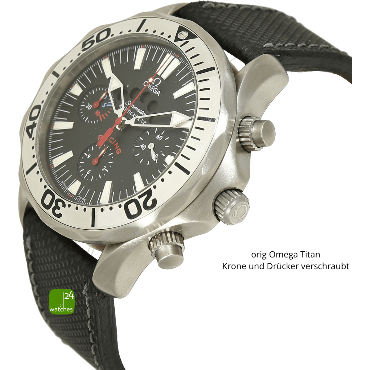 Titan | 44 mm im Durchmesser ohne Krone gemessen . mit Krone 49 mm | von Bandanstoss zu Bandanstoss 51 mm | Höhe 15 mm | geschraubter Gehäuse Boden massiv Titan mit Herstellergravuren | Saphirglas bombiert entspiegelt mit minimalsten Nutzungsspuren punktuell keine Kratzer | 60 fach rastende einseitig drehbare Lynette aus Edelstahl graviert | 21 mm Bandanstoss | 300 m wasserdicht | Gesamtgewicht 99,88 Gramm